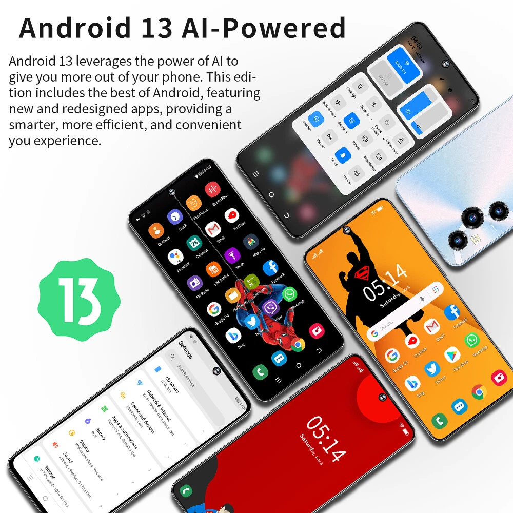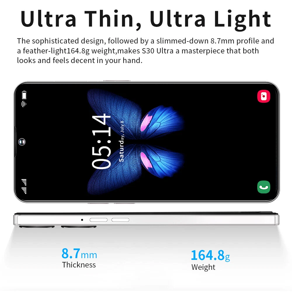 S30 Ultra 5G Smartphone 7.3" 16GB+1TB Android Mobile Phone Dual SIM OTG Type C Factory direct sales, better quality but lower price is our target and mission! Features: - 7.3inch FHD Display The S30Ultra delivers the viewing experience you always wanted, With a massive 93% screen-to-body ratio on a 7.3"inch screen. - 50MP Front Camera Clear and Stylish Selfie The S30Ultra world-leading 50MP front camera turns your every selfie into a work of art experience greater brightness, color vibrancy, clarity and dynamic range. Even in the dimmest light, whenever you need it, your S30Ultra is right there with you, capturing every moment with crystal-clear precision, Turn your selfies into masterpieces and shine in every photo. - 108MP Rear HD camera The S30Ultra features a 108MP camera combination. The main camera sports a large f/1.8 aperture and 1.28um pixels, This strong combination boosts photo-sensitivity in backlight or low light, Just point and shoot, and S30Ultra will make sure your pictures remain clear and bright. - Face Access The S30Ultra also supports facial recognition upon activation,S30Ultra scans your facial features and unlocks instantaneously accessing your phone has never been so easy, or so fun. - Powerful Performance The Snapdragon 8 gen2 mobile platform with 10mm process technology makes young people who love the young and other popular games. The game is on and lower. - Android 13.0 The new interactive design makes the operation simple and simple, the use of the mobile phone is so simple and straightforward, everything is handy. - Dual SIM card supports TF card Dual card dual standby, card slot does not distinguish between the main and the deputy, supporting the worlds 50 major communication carrier networks Specification: 1.Model No.:S30Ultra 2.Platform : Snapdragon 8 gen2, Deca Core (Latest 10 Core) 3.Standby: Dual sim dual standby 4.Screen: 7.3HD+ Full Display 1440*3200 5.Speaker: 1511 Box Speaker 6.Frequency: GSM850/900/1800/1900MHz, 3G:WCDMA850/1700/1900/2100MHz *4G:TDD(B38\B40\B41),FDD (B1\2\3\4\5\7\8\20\28A\28B) *5G 7.Vibration: Support 8.Colors: Black,White 9.Memory: 8GB RAM+256GB ROM 10.Multi Media: MP3/MP4/3GP/FM Radio/Bluetooth 11.Camera: 50MP+108MP 12.Multi Function: Full screen, Face recognition, Dual SIM,OTG, Wi-Fi, GPS,Gravity Sensor, Alarm ,Calendar ,Calculator ,Audio recorder ,Video recorder, WAP/MMS/GPRS, Image viewer,E-Book,World clock,Tasks card, rear flash 13.Languages: Muti-language support 14.Others: Android OS 13.0 System 15.Battery: 8000mAh Lithium-ion battery 16.Ultra unibody 17.TypeC input Packing list: 1 x Smartphone 1 x Charger Adapter 1 x Headphones 1 x User Manual 1 x phone case 1 x Protection film 1x OTG input