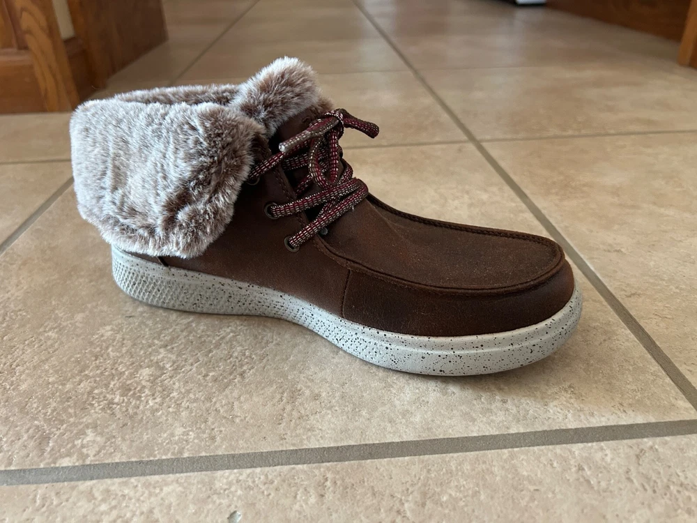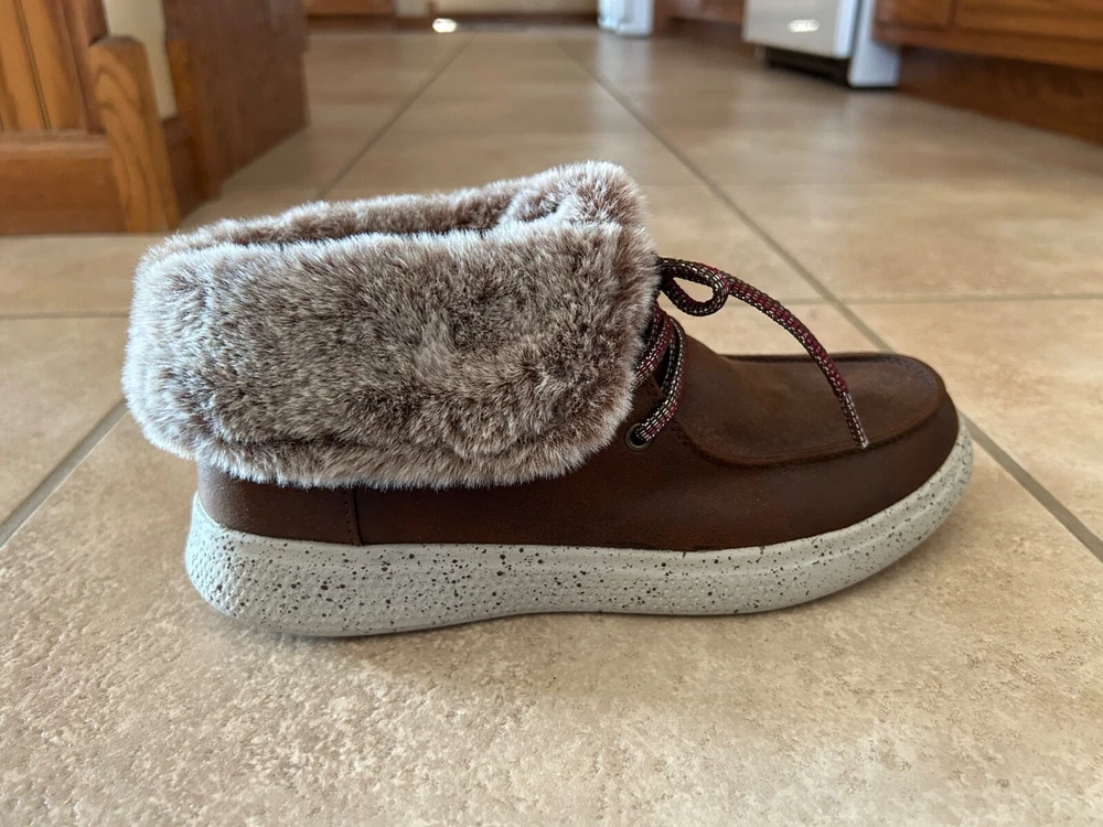 You will be both in style and dressed for comfort with these Skechers Women's BOBS Skipper Hang Glider Boots in brown. The listing is for women's size 9. Designed with a smooth leather-textured microfiber upper material and a lace-up ankle boot design with a moc toe, these boots are perfect for any occasion. The plush faux-fur fold-down collar adds a touch of elegance,w hile the rubber outsole provides great traction and durability. These ankel boots feature a chenille lining, cushioned midsole with speckle color details, and memory foam insole for extra comfort. The low heel height and flat heel style make them perfect for walking or standing for long periods of time. With a solid pattern and accents like fur trim and logo, these boots are sure to make a statment. Don't miss out on this great addition to your shoe collection. Please note: Items are from smoke-free and pet-free home. Alaska & Hawaii residents - please contact me for shipping quote, as shipping is usually a little higher than to the 48 contiguous states. International buyers - Please note: Import duties, taxes and charges are not included in the item price or shipping charges. These charges are the buyer's responsibility. Please check with your country's customs office to determine what these additional costs will be prior to bidding/buying. Track Page Views With Auctiva's Counter