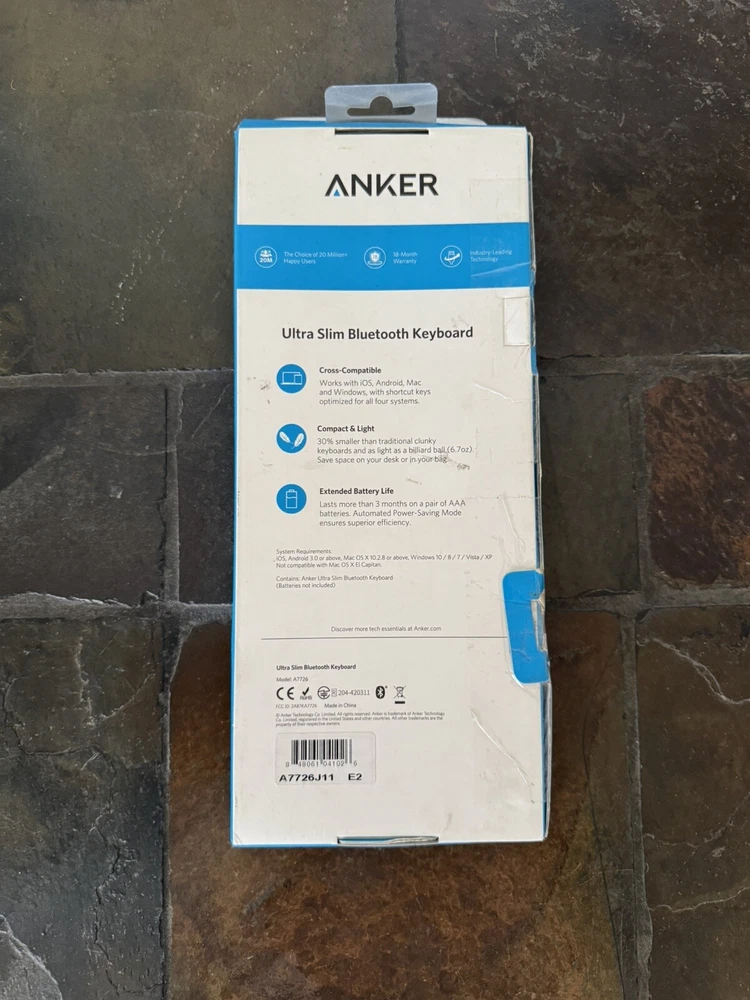 Anker wireless bluetooth keyboard. Brand new in box, box has some sight damage but the keyboard is unused!!