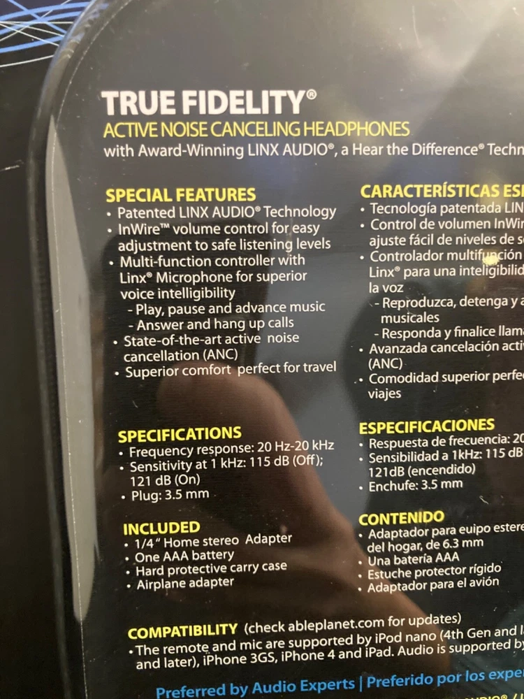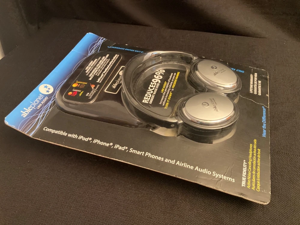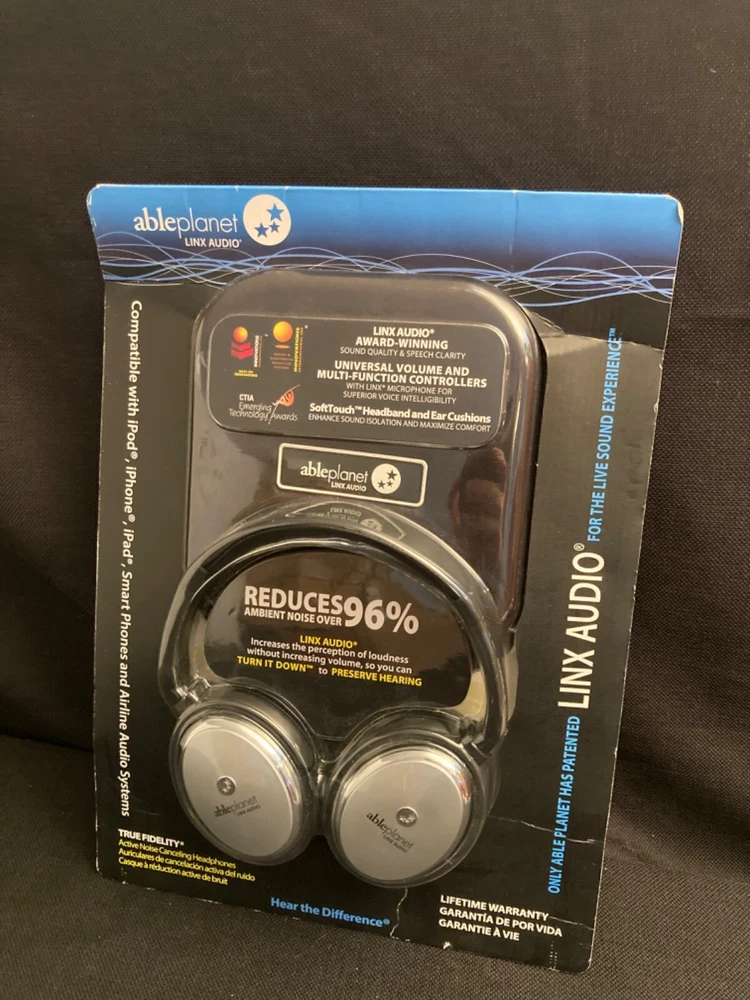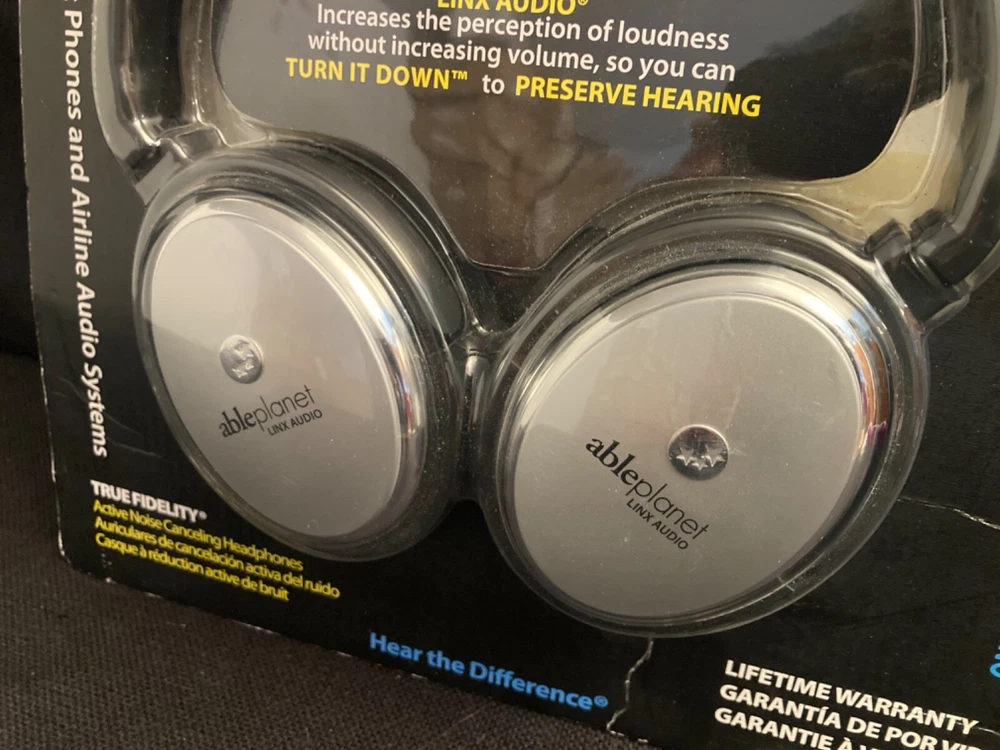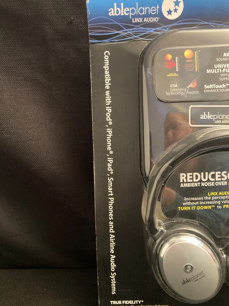 Experience high-quality sound with the Able Planet True Fidelity Active Noise Canceling Headphones. These ear-cup headphones have a double earpiece to provide a more immersive audio experience. The Linx Audio model is designed with a sleek silver and black color theme that is perfect for any style. These headphones have a wired connectivity option with a 3.5mm jack for easy attachment to your favorite devices. (compatible with iPod, iPad, older model iPhones, Smart Phones with a jack insert, laptops) Great for kids and their devices like LeapFrog, etc! The active noise cancellation feature eliminates distractions and allows you to enjoy your music without any external noise. Get ready to enjoy your travel experience with these comfortable and stylish headphones.