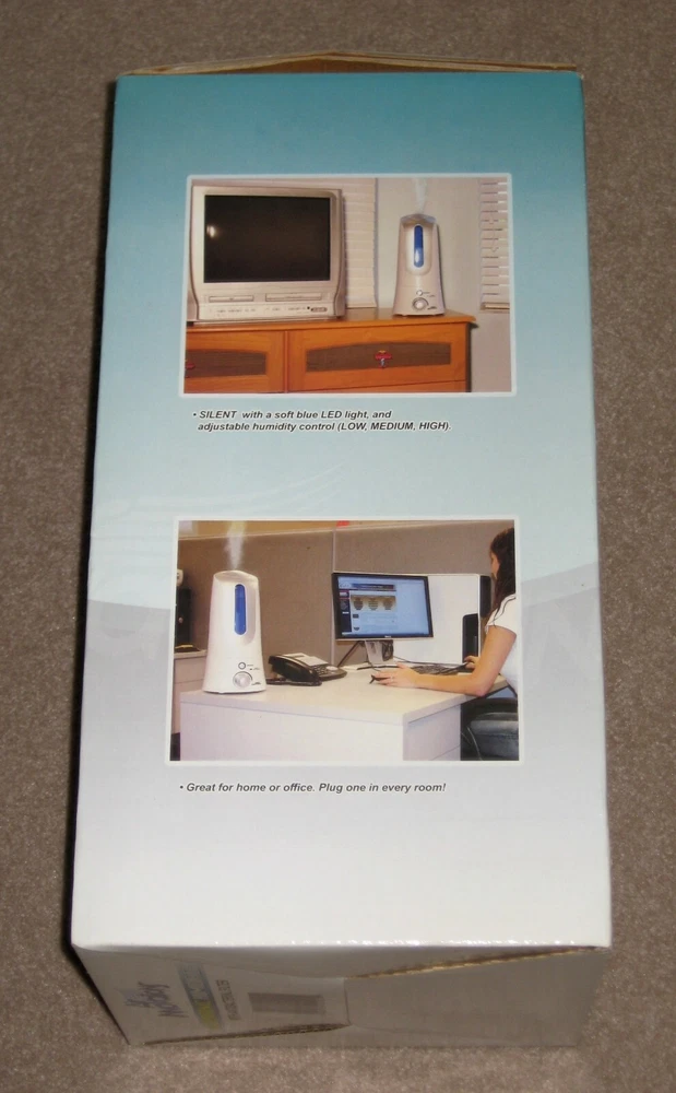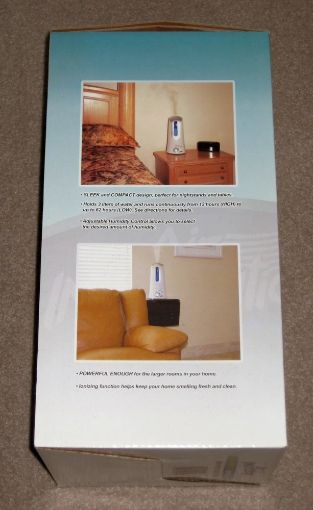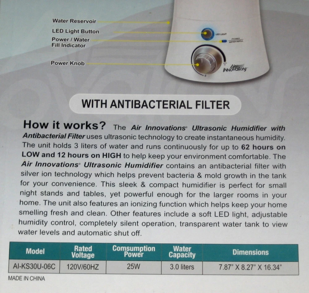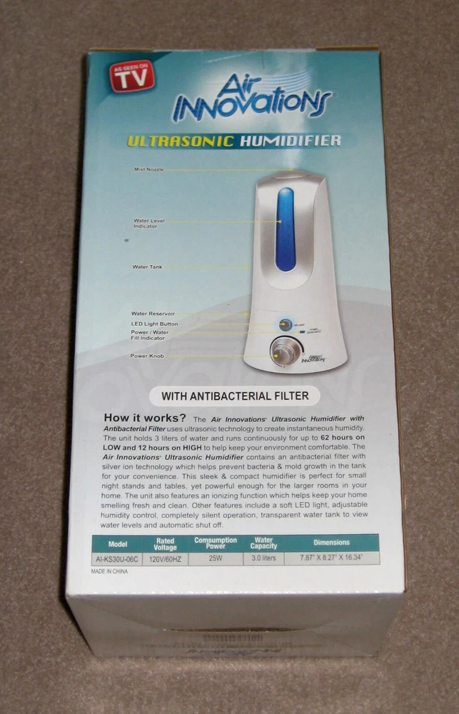 New Air Innovations Ultrasonic Humidifier with Antibacterial Filter 62 Hours Air Innovations Ultrasonic Humidifier W/ Bacterial Filter White As Seen On TV 3L Humidifier Is In New Condition in the Original Box Filtered water, fresher air. Help keep your home healthy with this ultrasonic humidifier. The compact unit features an antibacterial silver-ion filter that prohibits mold and bacteria growth in the water tank and releases clean water into the air. Its permanent filter never has to be replaced. Simply remove it, rinse it off, and put it back in the unit--no extra expense! Ultrasonic vibration creates a cool mist that's safe to the touch and humidifies continuously and silently. It also acts as an ionizer, helping to keep your home smelling fresh and clean. An adjustable dial lets you control the amount of humidity in the air--choose low mode for up to 48 hours of operation or the high mode for up to 12 hours of operation per single tank of water. The sleek and compact tower design allows for easy transfer from the nursery to the office to the living room. Finally! Moistened air--anywhere--without the mess or worry. From Air Innovations. Soft blue LED illuminates when unit is operating Adjustable humidity control Automatic shutoff Transparent water tank Holds three liters of water Mist plume can reach up to 17" Approximate measurements: Humidifier 16"H x 8-1/2"W x 8"L; Power cord 6'L Buyer to pay choice of weight based shipping and packaging with tracking. Check our other listings for more outstanding merchandise to combine on shipping! We also have a unique eBay store that features many more one of a kind items! Smoke free and pet free home. Introducing the new Air Innovations Ultrasonic Humidifier with Antibacterial Filter, designed to improve indoor air quality and create a comfortable living space. This tower humidifier runs on electrical power with a voltage of 120V and has a tank capacity of 0.8 gallons (3L). The AI-KS30U-06C model features adjustable humidity control, automatic shut off, and quiet operation. It also has an aroma diffuser and LED lights for a relaxing and personalized experience. Ideal for use in any room, including recreational vehicles and personal spaces, this humidifier is made of plastic and metal material with a glossy finish. With a recommended room size ranging from travel/personal to large, this Air Innovations humidifier is perfect for your indoor air needs.