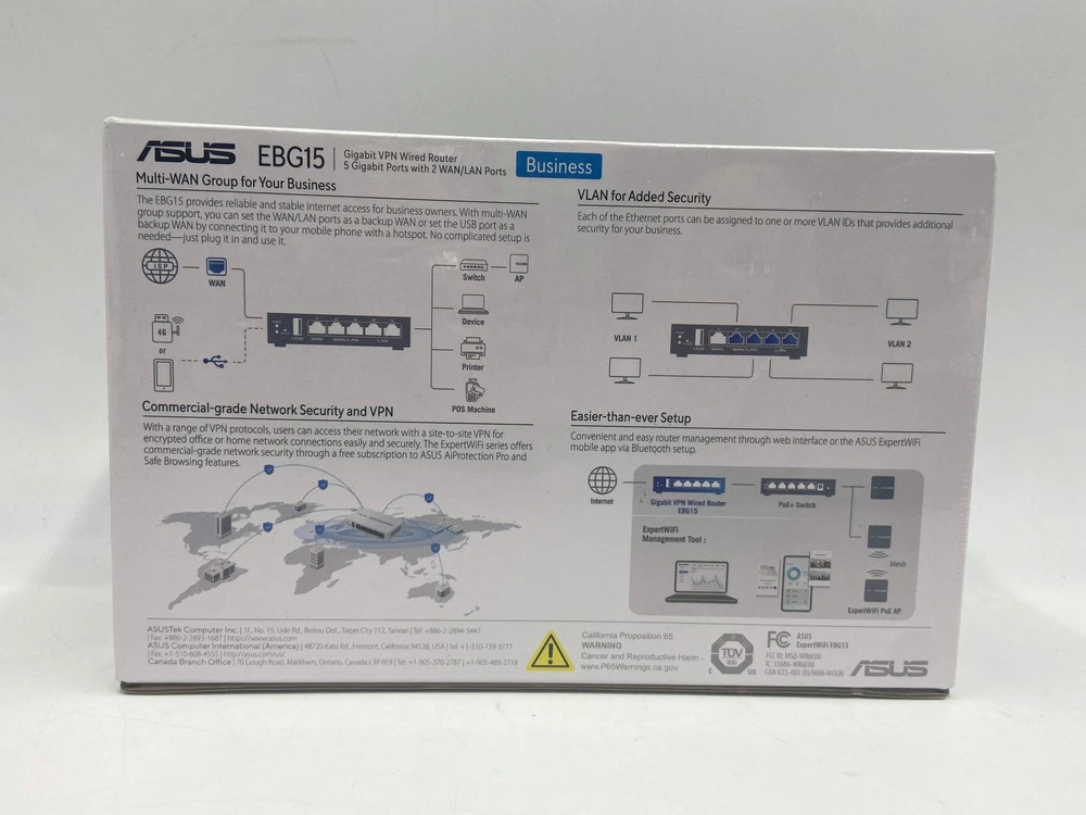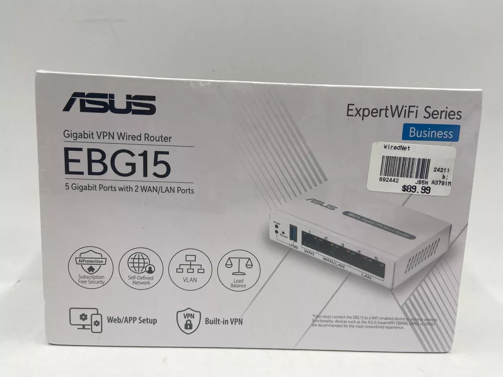 New Asus EBG15 Gigabit VPN Wired Router New Asus EBG15 Gigabit VPN Wired Router Items included in this sale: New Asus EBG15 Gigabit VPN Wired Router *All originally boxed contents are included. Specifications: Collection General/Other Brand Asus Model EBG15 Type Gigabit VPN Wired Router Condition New MFG Warranty? No UPC 197105067516 Serial# S2IG6E400351SEJ Cosmetic Condition: The router is new and sealed in the original box. Please view our close up photos, as these are taken of the actual item being offered for sale. Functionality: The router is new and sealed in the original box. New Asus EBG15 Gigabit VPN Wired Router New Asus EBG15 Gigabit VPN Wired Router Items included in this sale: New Asus EBG15 Gigabit VPN Wired Router *All originally boxed contents are included. Specifications: Collection General/Other Brand Asus Model EBG15 Type Gigabit VPN Wired Router Condition New MFG Warranty? No UPC 197105067516 Serial# S2IG6E400351SEJ Cosmetic Condition: The router is new and sealed in the original box. Please view our close up photos, as these are taken of the actual item being offered for sale. Functionality: The router is new and sealed in the original box. × × × Buy now and save! Shipping info Click the Shipping & Payments tab above the listing description for more info FREE Shipping Click the Shipping & Payments tab above the listing description for more info! Additional delivery notes PICK UP OPTION Sorry, our items are NOT available for pick-up. PAYMENT Immediate payment is required upon selecting "Buy It Now" or upon checking out through the cart. We accept payment via U.S. PayPal accounts and all Major Credit Cards, Debit Cards & Google Pay. We are legally required to collect sales tax in those states and localities where we maintain a physical presence (nexus). The applicable amount of sales tax charged to an order will be calculated based on the shipment destination's state and local sales tax laws. Thank you for shopping with us on eBay! Additional Information No additional information at this time Ask seller a question You might also like Schlange 2A Power Supply 902 Class 2 Relay EL Panic Device Control Board Florence Collection 27" Hand Made Porcelain Doll Margaret Rose Dress LE #230 NHL 20 (Sony PlayStation 4 PS4, 2019) Includes Manual + Inserts Cisco AIR-AP3802I-B-K9 Aironet 3802 5.2 Gbps Wireless Dual Band Access Point Contact To contact our Customer Service Team, simply click the button here and our Customer Service team will be happy to assist. Ask seller a question © PayMore Flatbush Shipping & Payments Shipping is FREE for this item Payment Accepted Payment Methods Immediate payment is required upon selecting "Buy It Now" or upon checking out through the cart. We accept payment via U.S. PayPal accounts and all Major Credit Cards, Debit Cards & Google Pay. We are legally required to collect sales tax in those states and localities where we maintain a physical presence (nexus). The applicable amount of sales tax charged to an order will be calculated based on the shipment destination's state and local sales tax laws. Thank you for shopping with us on eBay! Returns Returns are accepted Items must be returned within 30 days of the auction ending Seller will pay for return shipping. eBay integration by