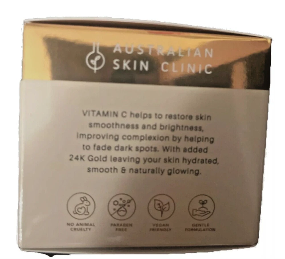 The Australian Skin Clinic Brightening Vitamin C 24K Gold Face Cream is a luxurious skincare product designed to enhance skin radiance and hydration. Here’s a breakdown of its potential features and benefits: Features: 1. Vitamin C: Known for its brightening properties, Vitamin C helps to even out skin tone, reduce the appearance of dark spots, and boost collagen production for a youthful look. 2. 24K Gold: Often included in high-end skincare for its antioxidant and anti-inflammatory properties, gold can improve skin elasticity, reduce fine lines, and give a radiant glow. 3. Hydrating Formula: Likely includes additional moisturizing agents to keep the skin plump and hydrated. 4. Brightening Effects: Designed to tackle dullness and improve skin luminosity. How to Use: • Cleanse your face thoroughly. • Apply a small amount of the cream and gently massage it into the skin using upward motions. • Use daily, preferably as part of your morning skincare routine for maximum brightening effects.