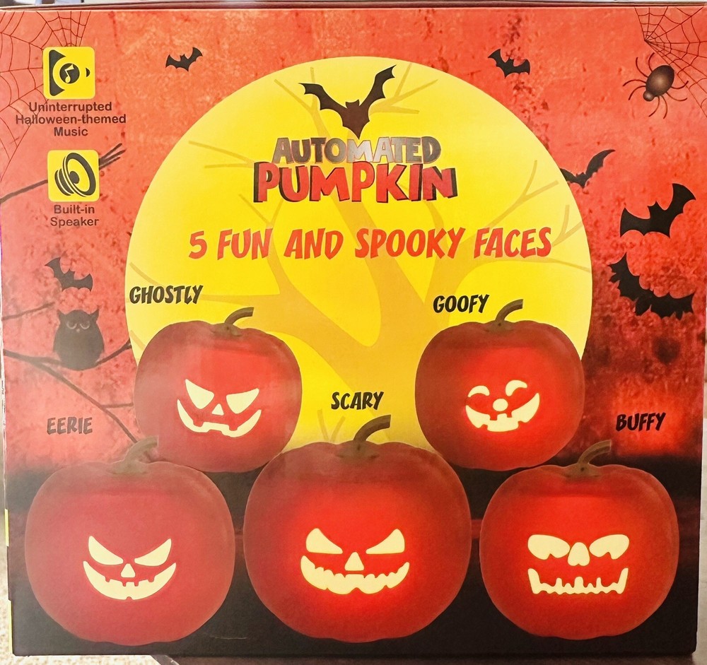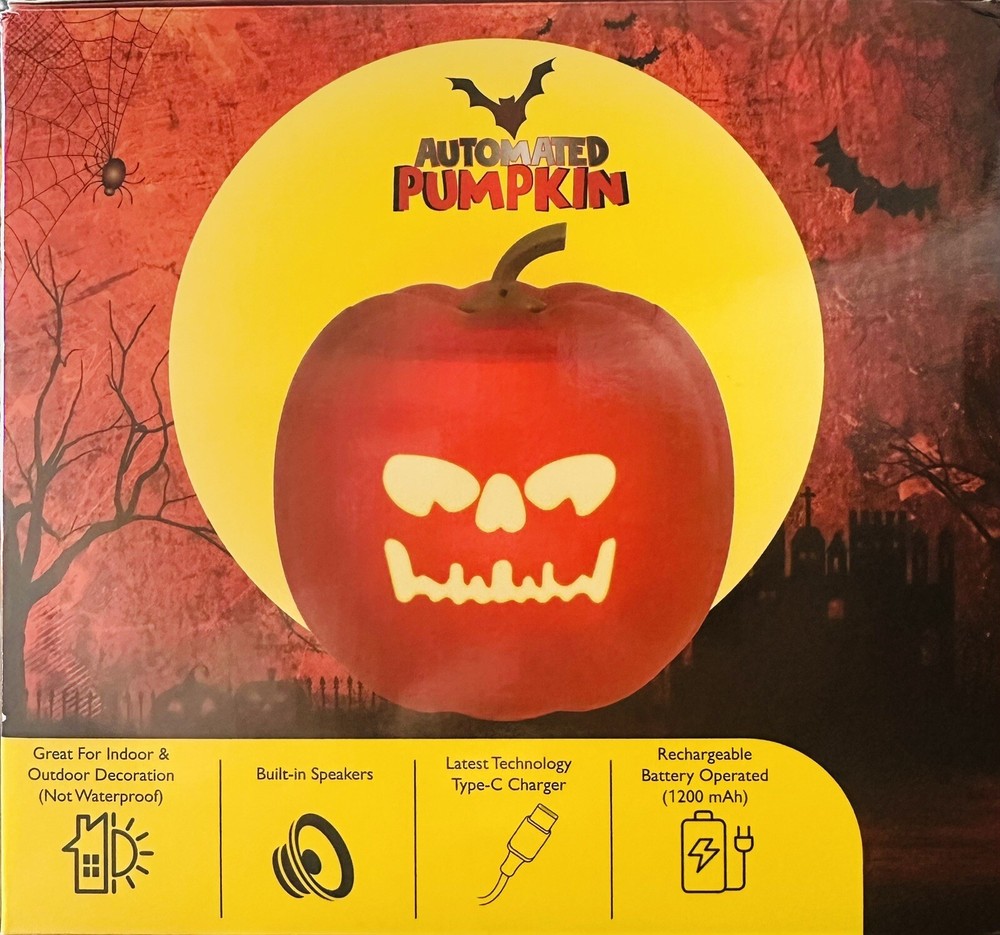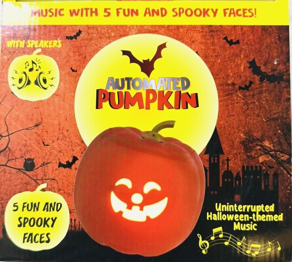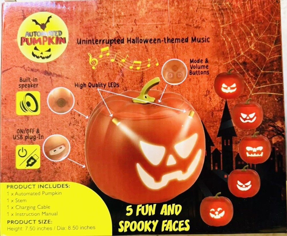 Get ready for Halloween with this amazing automated pumpkin figurine! With five different spooky faces, built-in speakers, and LEDs, this Pinnacle brand collectible is sure to delight anim enthusiasts and Halloween lovers alike. Made of durable plastic and weighing only 1.0 pounds, this pumpkin is easy to move and perfect for display in any room. The pumpkin features a rechargeable battery built-in and comes in a package dimension of 9.02x9.02x7.01 inches. It's the perfect addition to any holiday or seasonal collection, and a must-have for any fan of animation-themed décor. Don't miss out on this unique and captivating figurine that will bring a touch of frightful fun to your home.