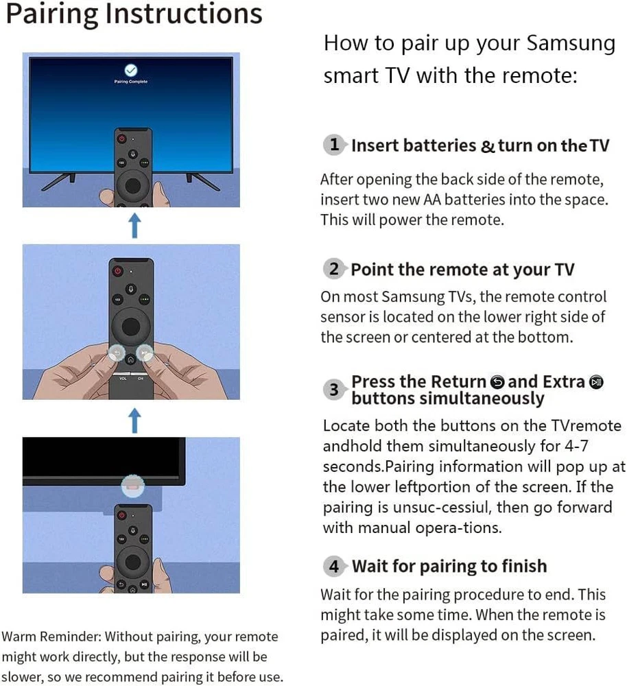 Product Description If you have any questions, please contact customer service first, do not open disputes easily, thank you! Specification: Model Number: BN59-01329A BN59-01330A Condition: New Compatible Brand: For Samsung Type:TV Remote Channel: 1 Frequency: 433 MHz Material: ABS Material Colour: As Shown Mode power supply: 2xAA batteries (batteries are not included) Remark: A replacement remote control units and will work as well as the originals. Compatible for Samsung TV model: QN49Q80TAFXZA, QN49Q8DTAFXZA, QN50Q80TAFXZA, QN55Q70TAFXZA, QN55Q80TAFXZA, QN55Q8DTAFXZA, QN55Q90TAFXZA, QN65Q70TAFXZA, QN65Q7DTAFXZA, QN65Q800TAFXZA, QN65Q80TAFXZA, QN65Q8DTAFXZA, QN65Q900TSFXZA, QN65Q90TAFXZA, QN75Q70TAFXZA, QN75Q800TAFXZA, QN75Q80TAFXZA, QN75Q8DTAFXZA, QN75Q900TSFXZA, QN75Q90TAFXZA, QN82Q70TAFXZA, QN82Q800TAFXZA, QN85Q70TAFXZA, QN85Q80TAFXZA, QN85Q900TSFXZA, QN85Q90TAFXZA Pairing: The remote control needs to be paired before use. To pair the remote control: Press the BACK and START / PAUSE buttons at the same time, for five seconds to pair the remote control with your TV. Warm Reminder: Without pairing, your remote might work directly, but the response will be slower, so we recommend pairing it before use. Package Included: 1 x Remote control (batteries are not included) Note: Due to different lighting and screen settings, the item color may be slightly different from the picture. Due to different manual measurements, please allow a 1-2cm difference in size. About Us We accept all payments authorized by eBay. powered by
