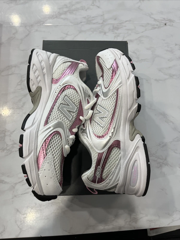 The product is a pair of New Balance 530 sneakers in a size 4 for men. They come in a Pink Sugar colorway and are in great pre-owned condition. The style code for these sneakers is MR530PK, featuring a mesh upper material that provides breathability and comfort. Part of the New Balance 530 product line, these sneakers offer a classic and stylish look perfect for athletic or casual wear in 2024. OGALL!