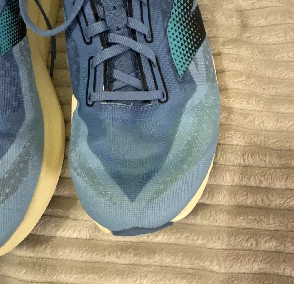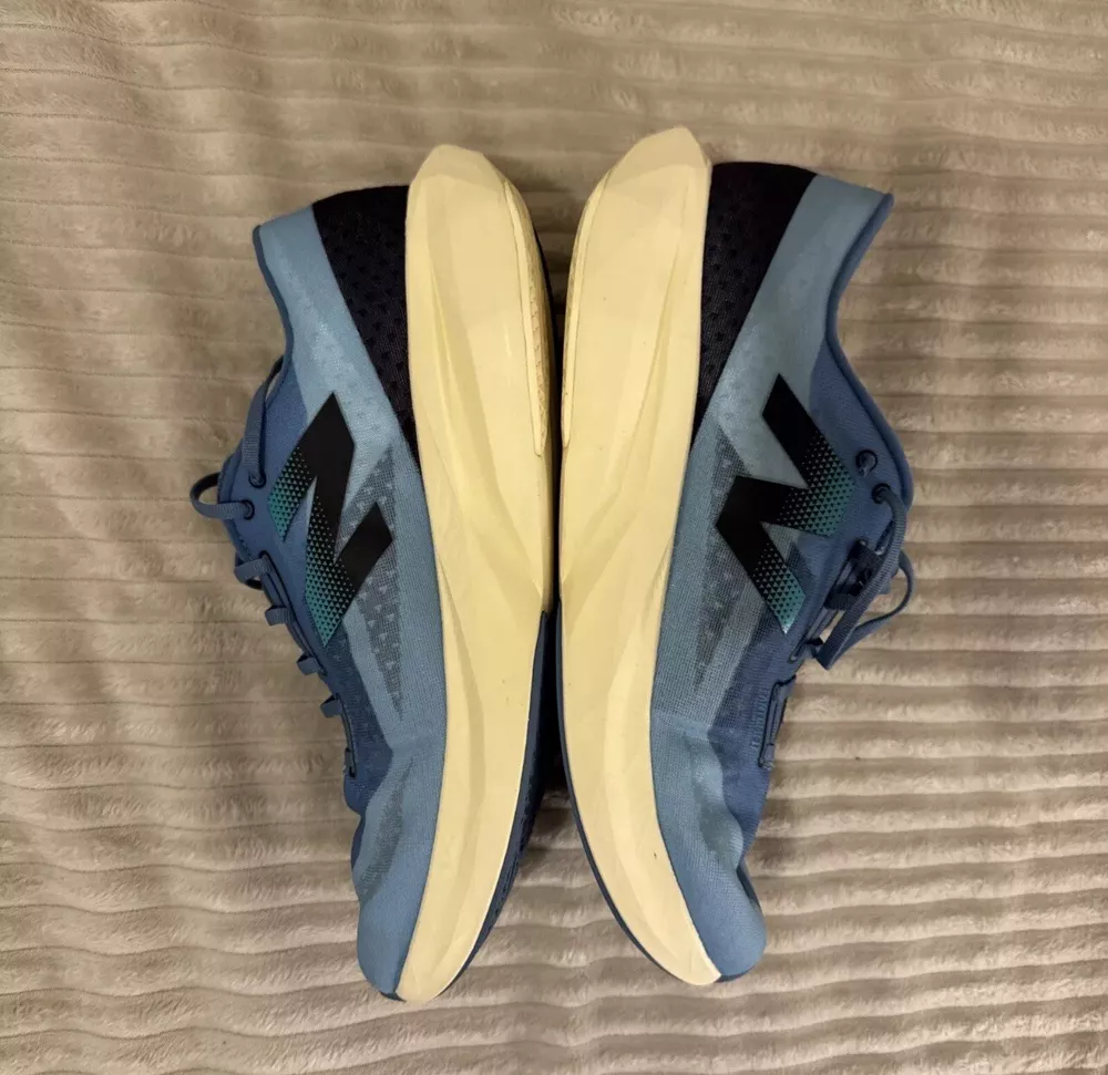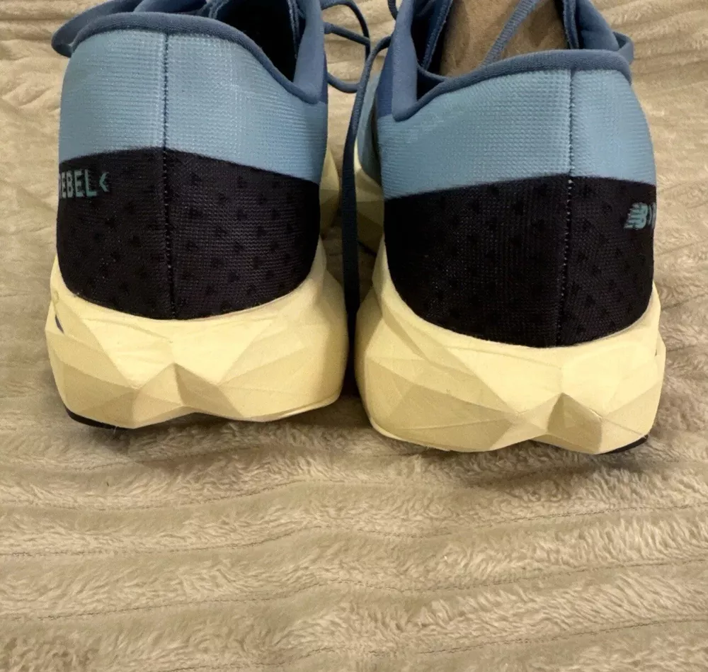 This is a pre-owned pair of New Balance FuelCell Rebel v4 athletic running shoes, designed for men in a US size 15 wide (2E). The sneakers feature a mesh upper material for breathability and comfort during uptempo daily training and running. The New Balance FuelCell technology provides responsive cushioning and energy return for a comfortable and supportive running experience. Perfect for those looking for a quality pair of athletic shoes in a larger size.