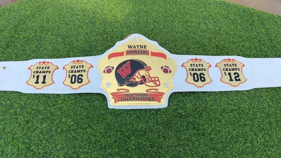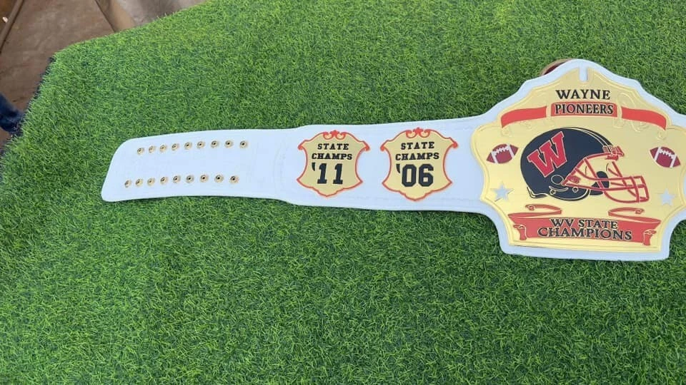 New Customise Wayne WV Pioneers State Championship Title Belt *ALL PICS ARE OUR OWN MANUFACTURED BELT'S PICTURES* FEATURES METAL PLATES. GOLD PLATING. GENUINE HAND CRAFTED LEATHER BELT. THE PLATE IS WITH DEEP ETCHING LOOKS VERY REALISTIC STRAP IS MADE FROM 100% (COWHIDE) LEATHER SNAP CLOSURE. ADULT SIZE. BELT FULL LENGTH IS ALMOST 50". FITS UPTO 46" WAIST. We take almost 5 (maximum) days ship the item. Payment Details Payment is required after placing the order; complete as per eBay order total; via PayPal (Credit Card holders can make payment via Paypal) We Manufacture all Type of Replica Championship Belts (WBO, WWE, WBA, IBI, IBF, MMA, IFS) Contact us for Details.