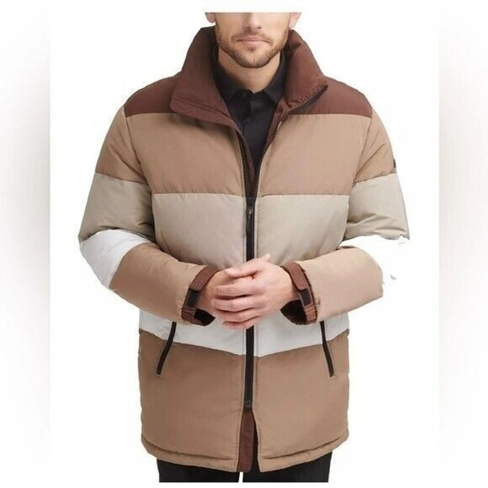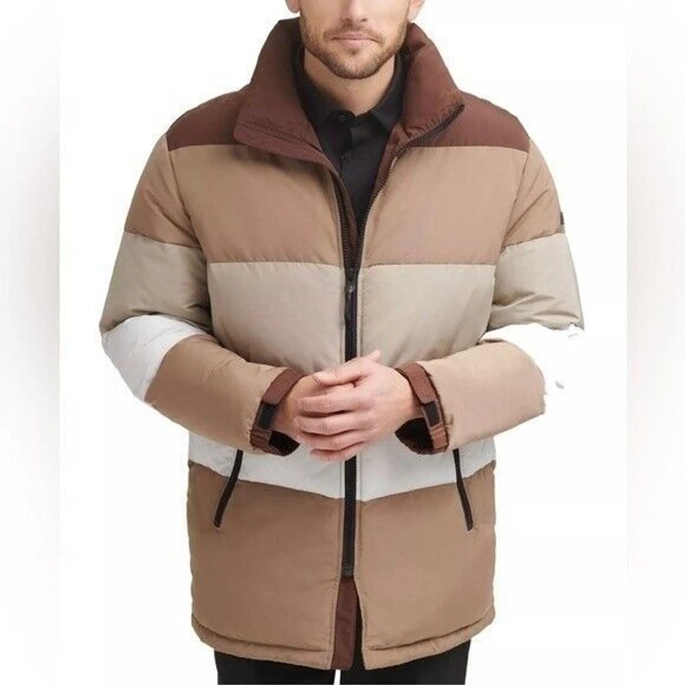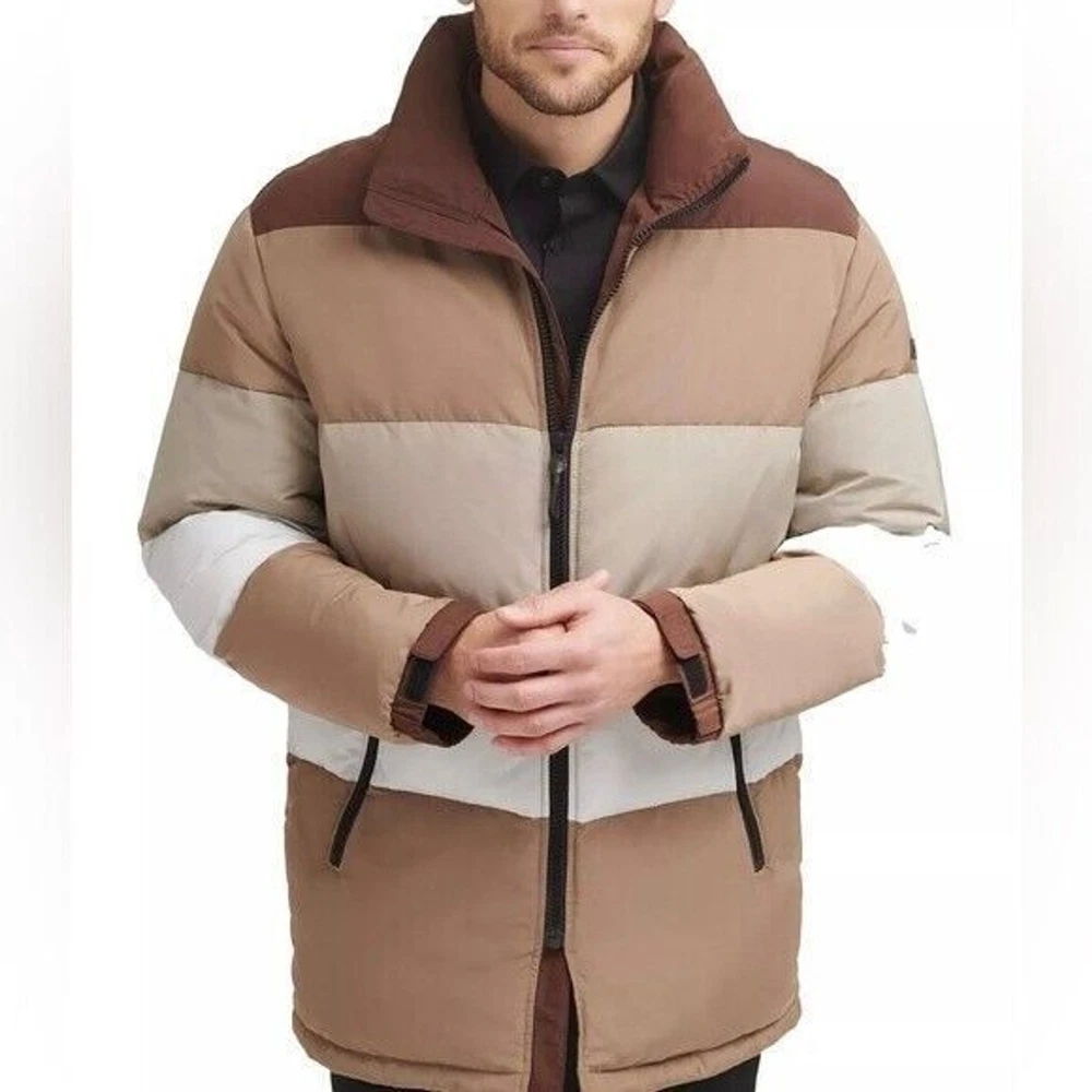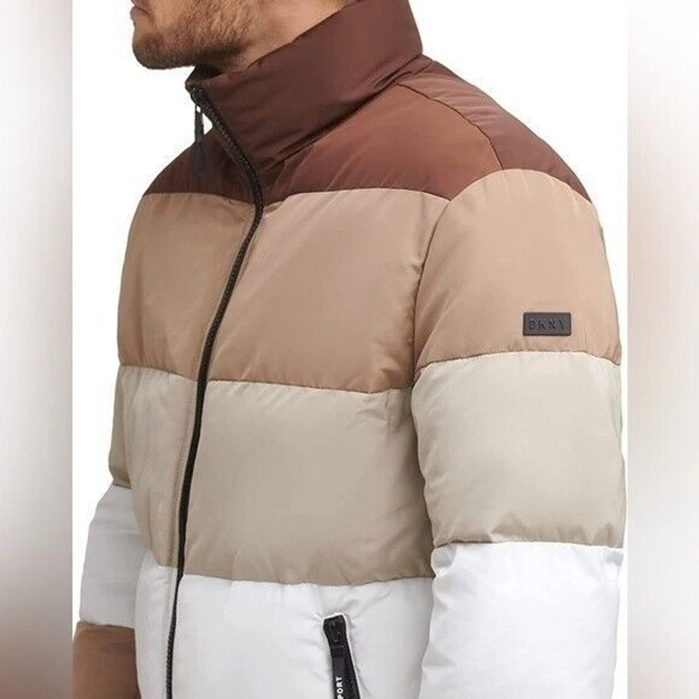 Step into both style and comfort for cold evening on the town with the bold, runway-ready quilted body and heavyweight design of this fresh take on the classic walking coat from DKNY. Heavyweight Regular fit Zip-through collar; full-zip front closure Two welt zipper pockets DKNY logo plaque on left sleeve; colorblock style (brown colorway); mixed media (red colorway) adjustable cuffs Shell: faux memory/patent faux leather polyurethane (red colorway); polyester faux memory (brown colorway); body lining: nylon; sleeve lining: polyester; DXIMP666 Age Group adult Gender male Color brown combo