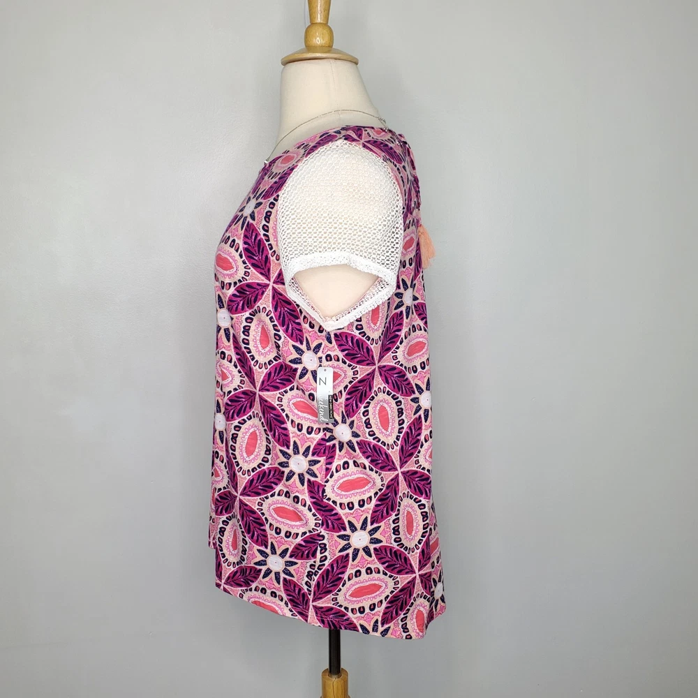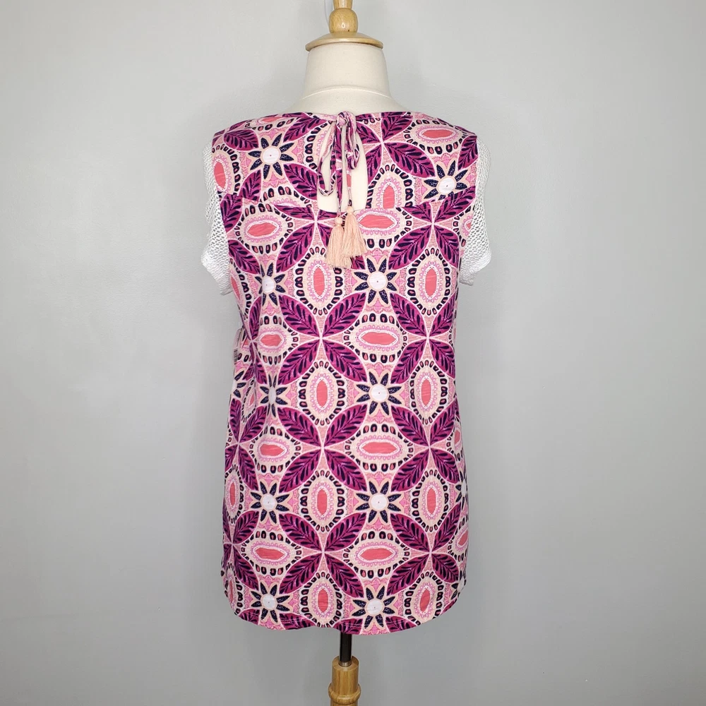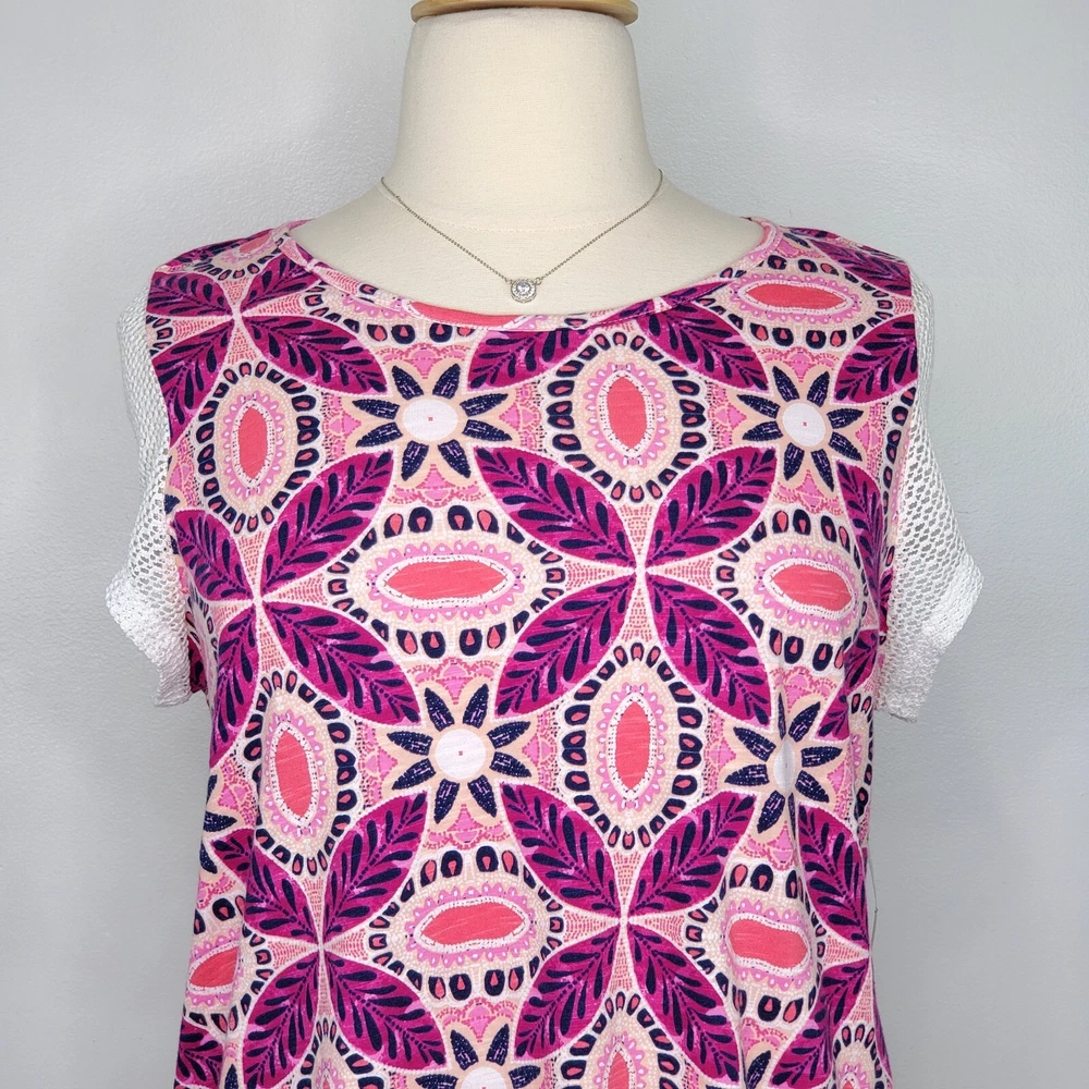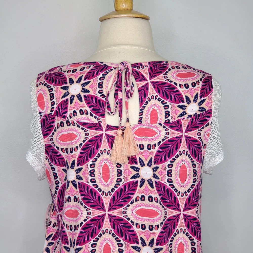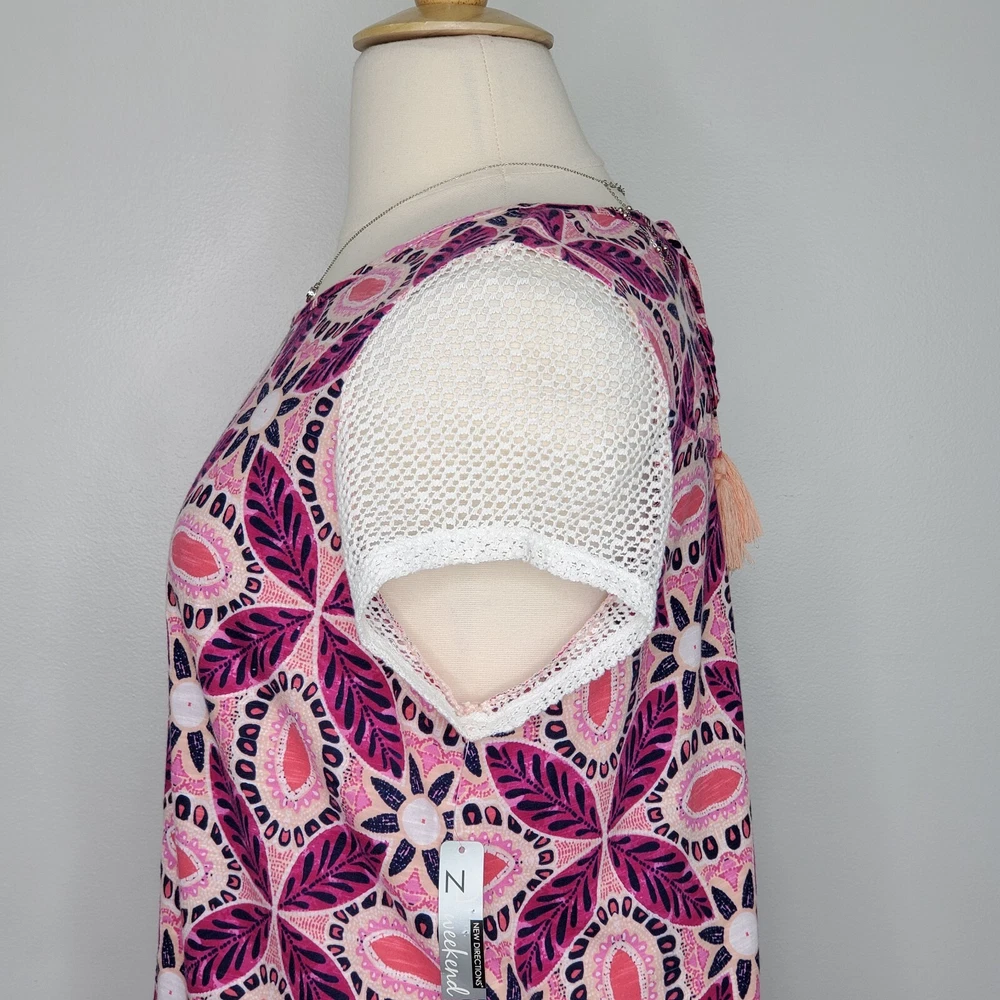 New Directions Weekend Geometric Floral Leaves Cap Sleeve Knit Top NEW NWT Size 0X Pullover summer top with mesh cap sleeves Fuchsia, pink, peach, navy, white Back tassel tie keyhole Has stretch Body 100% cotton, lace mesh cotton, nylon blend Breathable NWT - New With Tag Pictured on woman's XL Dess Form Notice: Color may differ from your computer, phone or device display Relaxed flat lay measurements are approximate, fit not guaranteed. Pit to pit: 22 1/2" Front Length down center: 23" Front Length shoulder to hem: 27 1/4" Back Length down center: 28" Hem Width front side to side: 27" EE870B M62822 9106 **5.9oz 70424 EBMP1 summer top flowers leaves mesh cap sleeves pullover breathable tassel tie back plus size top plus size blouse