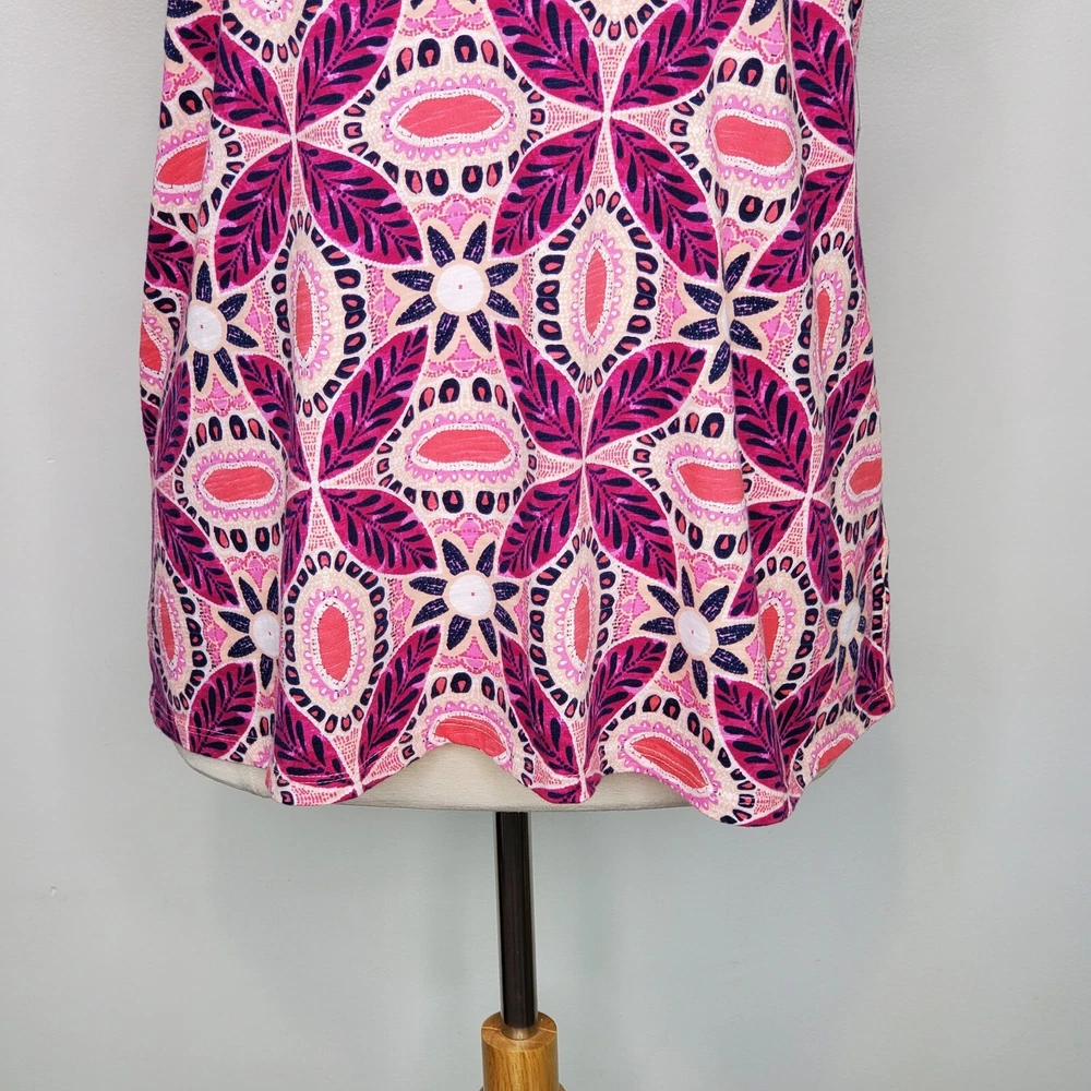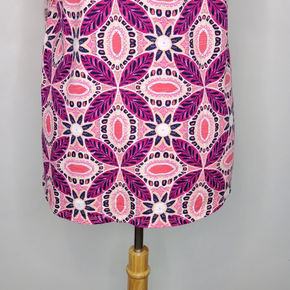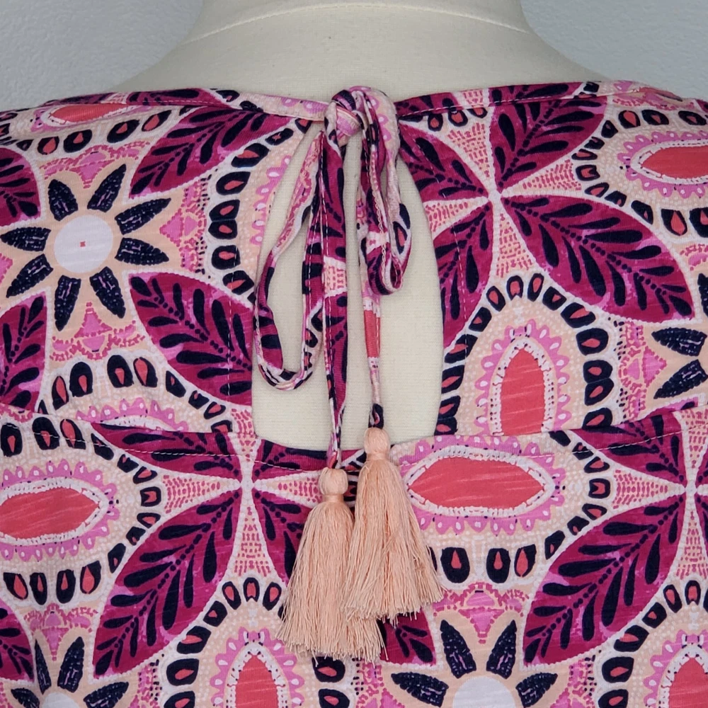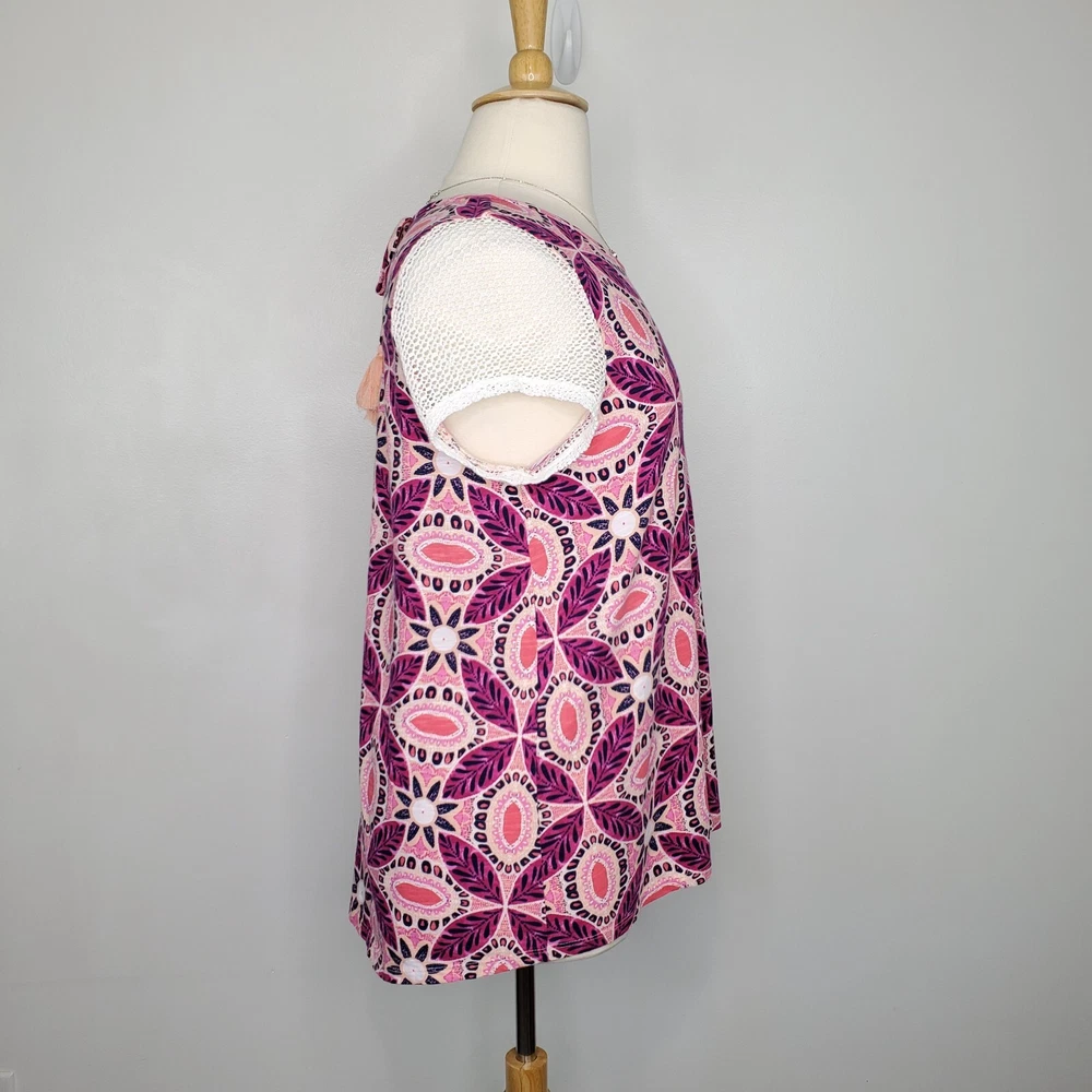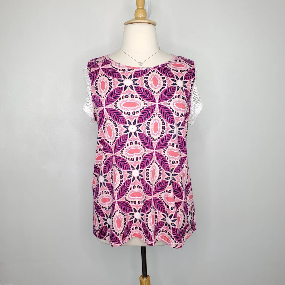 New Directions Weekend Geometric Floral Leaves Cap Sleeve Knit Top NEW NWT Size 0X Pullover summer top with mesh cap sleeves Fuchsia, pink, peach, navy, white Back tassel tie keyhole Has stretch Body 100% cotton, lace mesh cotton, nylon blend Breathable NWT - New With Tag Pictured on woman's XL Dess Form Notice: Color may differ from your computer, phone or device display Relaxed flat lay measurements are approximate, fit not guaranteed. Pit to pit: 22 1/2" Front Length down center: 23" Front Length shoulder to hem: 27 1/4" Back Length down center: 28" Hem Width front side to side: 27" EE870B M62822 9106 **5.9oz 70424 EBMP1 summer top flowers leaves mesh cap sleeves pullover breathable tassel tie back plus size top plus size blouse