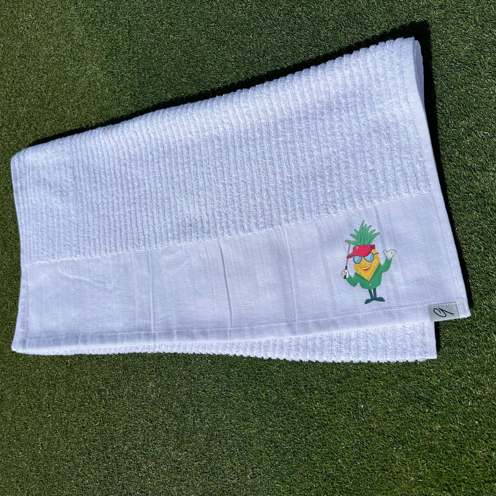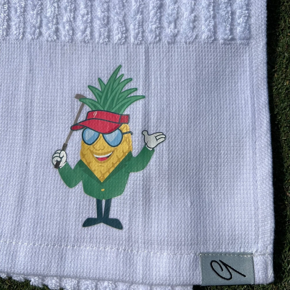 Hello friends or might I say "patrons".....We've decided to pay homage to that little April tradition with our pineapple mascot. It's every golfers favorite time of year and probably most everyone's favorite tournament to watch. With how hospitable and iconic the Green Jackets are at the tournament...we've taken our Pineapple Hospitality Mascot and decked him out in the iconic Green Jacket. Keeping it as exclusive as the tourney....we've made this a limited edition collection. There is a gift set option for all 3 items which includes the cutout ball marker, Tour caddie golf towel and a sticker. Sorry no golden ticket to the tournament though. So no matter how you swing, this gift set will make any golfer feel like they got a piece of that April tradition. Our caddie or caddy golf towel (p otato, potahto ) is printed with a hybrid screen print heat transfer process in color . This golf towel is a super soft, durable golf towel and a solid bag swag addition. Just like the Tour Players use, although they pay someone to wipe down their clubs and fill their divots. Makes a great golf accessory gift. Size: 22" x 44" Terrycloth, 86% cotton, 14% Polyester The cut out ball marker is 1.5" or 40mm tall A sticker is included with every purchase.