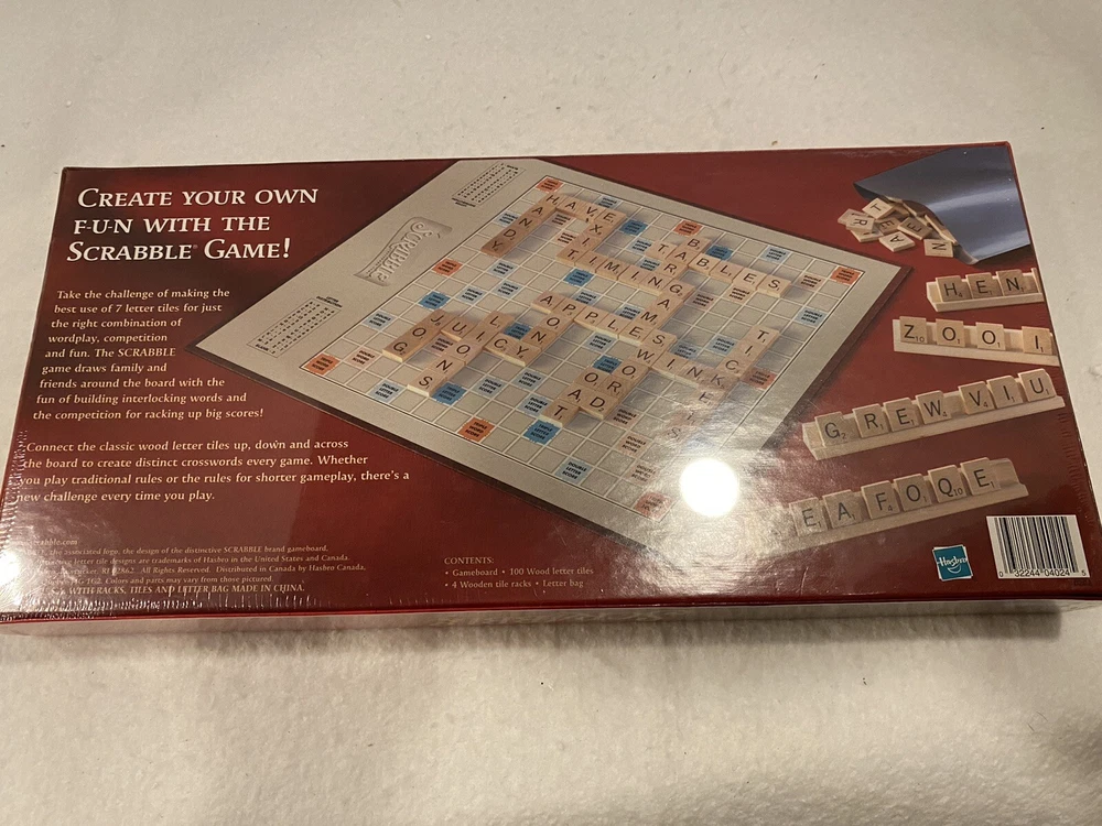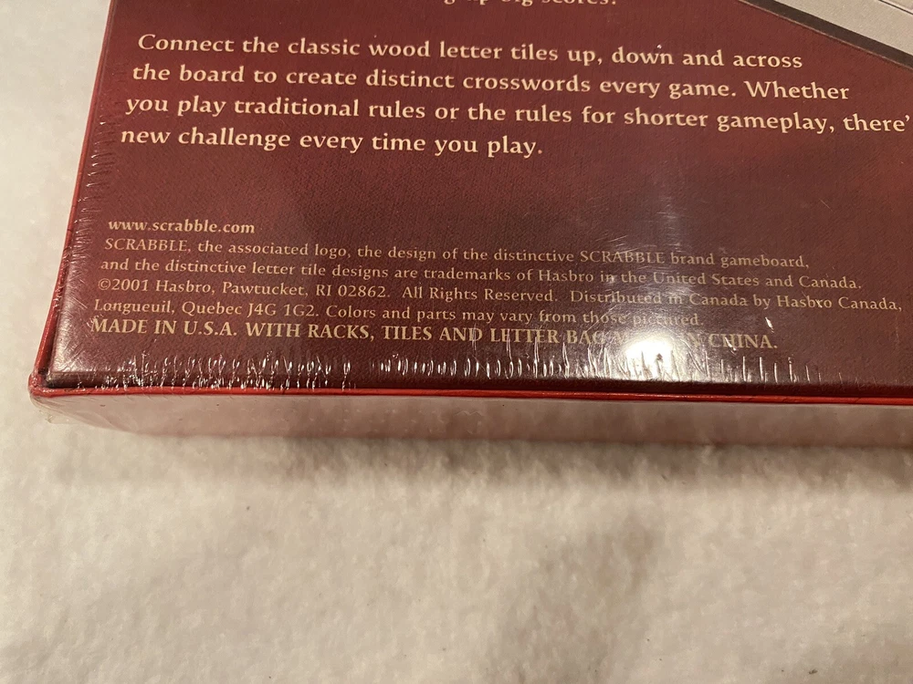 gtin13:032244040245UPC:032244040245Game Type:Board GameTheme:LettersMin. Number of Players:2 playersAge Level:8-11 Years, 17 Years & UpRecommended Age Range:8 To AdultGame Title:ScrabbleBrand:Parker BrothersCharacter Family:ScrabbleYear:2001Type:Game Board