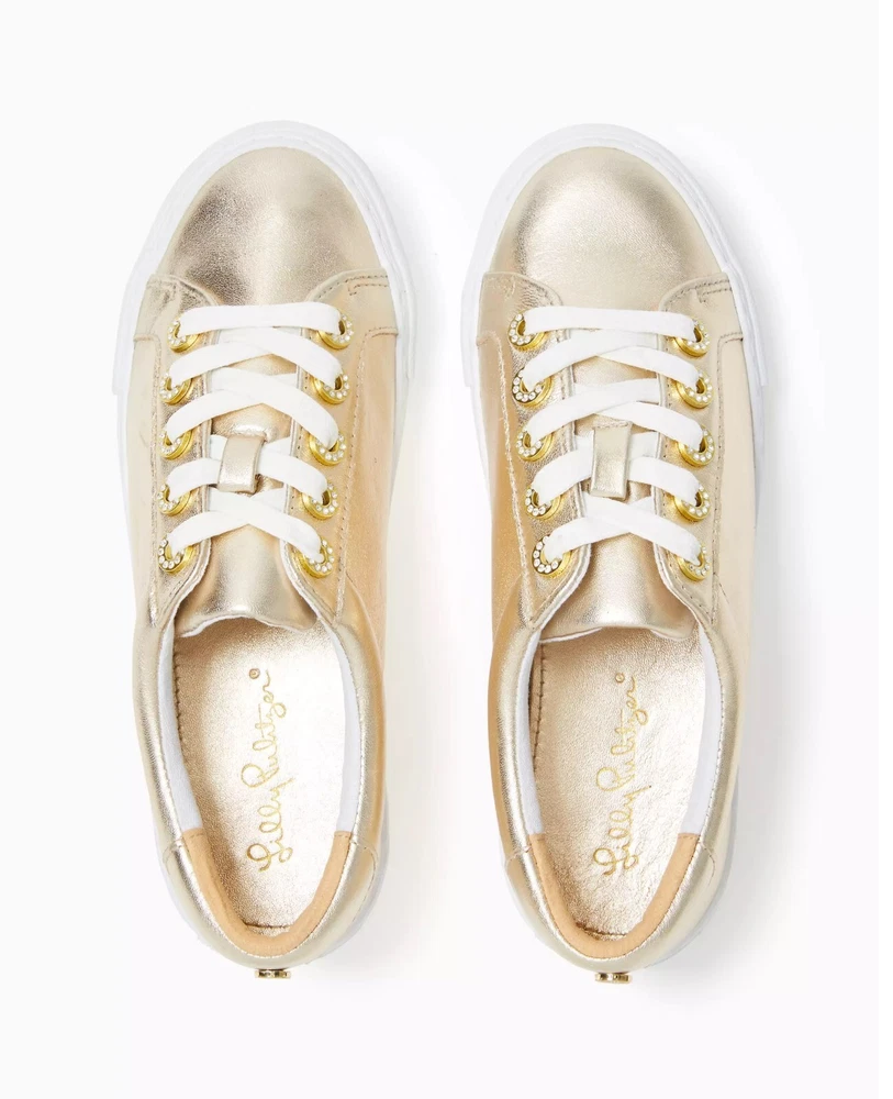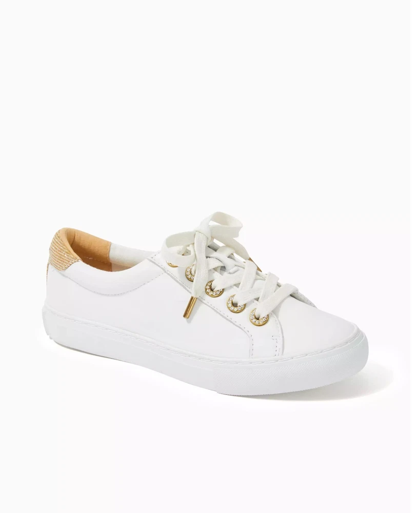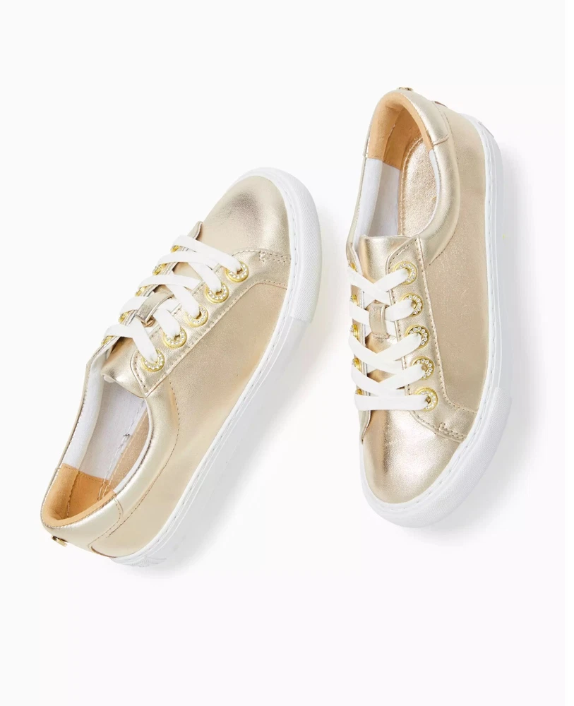 New Hot Lillypulitzer Lux Hallie Sneaker Color: Gold Metallic or Resort White Retail : $158 Color: Gold Metallic or Resort White Step into the sunshine with our Hallie Sneakers, a goes-with-everything pair made from white leather with gold metallic details and rhinestone accents. Leather lace up sneaker with gold metallic and pave rhinestone accents. Solid Nappa Leather. Imported. SKU: 004316