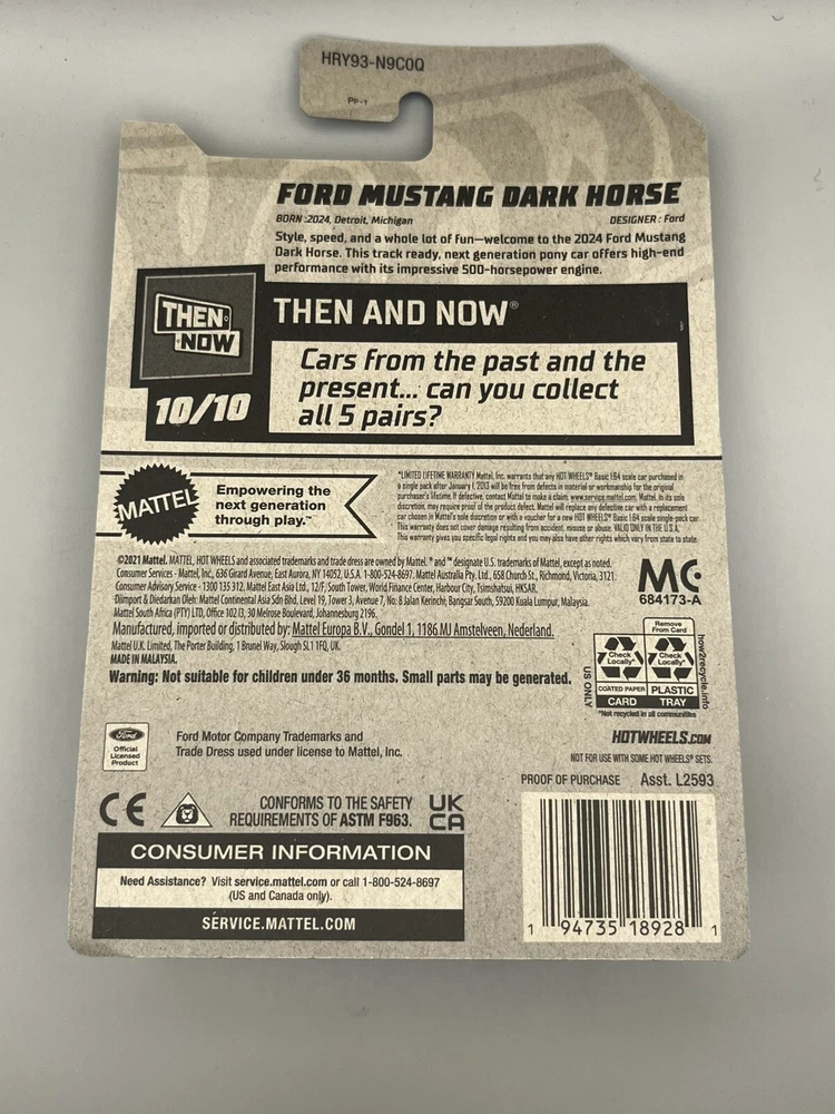 For all the car enthusiasts out there, check out this Hot Wheels 2024 Case Q Mainline 250/250 FORD MUSTANG DARK HORSE. This diecast model is a must-have addition to your collection. With a satin blue and black color combination, this 1:64 scale model is a perfect replica of the Ford Mustang. The car is designed with custom license plates, advertising specimens, and is unopened in its box. This Hot Wheels model is a part of the Hot Wheel Then & Now series and is manufactured in Malaysia. It is suitable for boys and girls aged between 12-16 years and 17 years & up. Get your hands on this Hot Wheels model and add a touch of class to your diecast collection.