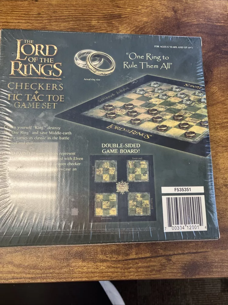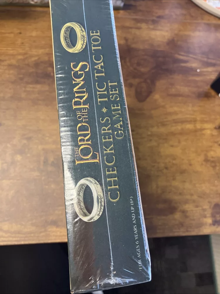 The product is a new Lord of the Rings Checkers/Tic Tac Toe board game set that is sealed in its original packaging. It is a game board featuring characters from the Lord of the Rings franchise, intended for players aged 6 years and up. The game can be played as traditional checkers or tic-tac-toe, providing entertainment for individuals in the age ranges of 12-16 years, 8-11 years, and 17 years & up who are fans of the Lord of the Rings series. Created by USAopoly, this board game offers a themed gameplay experience centered around the world of war in the Lord of the Rings universe.