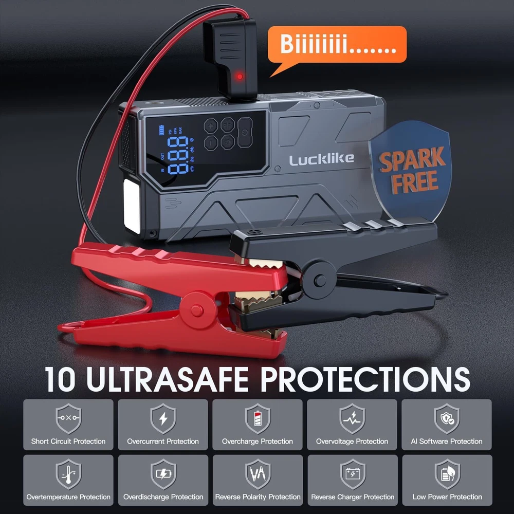 【New】 Lucklike Jump Starter with Air Compressor, 4000A Portable Car Battery Jumper Starter Pack for 10L Gas and 8L Diesel, Tire Inflator with Presssure Detection, 12V Jump Box with 3 Modes Flashlight Product Details Brand: Lucklike Product Dimensions: 1.97"D x 4.13"W x 8.15"H Item Weight: 1.8 Pounds Amperage: 4000 Amps Peak Output Current: 4000 Amps Manufacturer: Shenzhen Kalaifu Technology CO.,Ltd. Model: Jump Starter Item Weight: 1.78 pounds Item model number: W210 Batteries: 1 Lithium Ion batteries required. (included) Manufacturer Part Number: W210 Brand: Lucklike Product Dimensions: 1.97"D x 4.13"W x 8.15"H Item Weight: 1.8 Pounds Amperage: 4000 Amps Peak Output Current: 4000 Amps Battery Cell CompositionVoltage: Lithium Ion12 Volts Vehicle Service TypeBattery Capacity: Passenger Car, Bus, Van, Motorcycle, RV, Truck, Lawn MowerPassenger Car, Bus, Van, Motorcycle, RV, Truck, Lawn MowerPassenger Car, Bus, Van, Motorcycle, RV, Truck, Lawn Mower See more 21.8 Amp Hours 【Jump Starter with Air Compressor】 -- Powerful 4000A peak jump starter. Instantly start your car in seconds when the 12v vehicles battery is out of power (up to 10.0L gas and 8.0L diesel engines). It also support the tire inflations function 【150PSI Tire Inflator with Tire Presssure Detection】 -- This car battery jump starter built-in air pump supports 4 modes: cars, motorcycles, bicycle, balls etc and the 3 unit switching: BAR, KPA, PSI. It also support tire pressure detection function, connect the air pipe to thecorresponding interface of the machine,the display screen will display the current tire pressure data 【Portable Power Bank】 -- This jump box can be used as a mobile power bank, it offer one 18W(5V/2A 9V/2A) fast charging type-C input port and one 18W (5V/3A 9V/2A 12V/1.5A) USB output ports, you can quickly charge your devices such as smartphones, earphone, tablets, cameras, etc. Ideal for road travel or camping 【LED Emergency Light & LCD Display】 -- With LED lighting function, lighting, flash and SOS modes can be switched for the emergencies. LCD screen provides real-time data,make it clearer and easier to operate the product 【10 Safty Protections】 -- This Lucklike upgraded W210 jump starter with air compressor built-in 10 safety protection technologies (Short Circuit Protection, Overtemperature Protection, Overcurrent Protection, Overdischarge Protection, Overcharge Protection, Reverse Polarity Protection, Overvoltage Protection, Reverse Charger Protection, Al Software Protection, Low Power Protection), jumper cables is auto-detect connection with no sparks, 100% safe