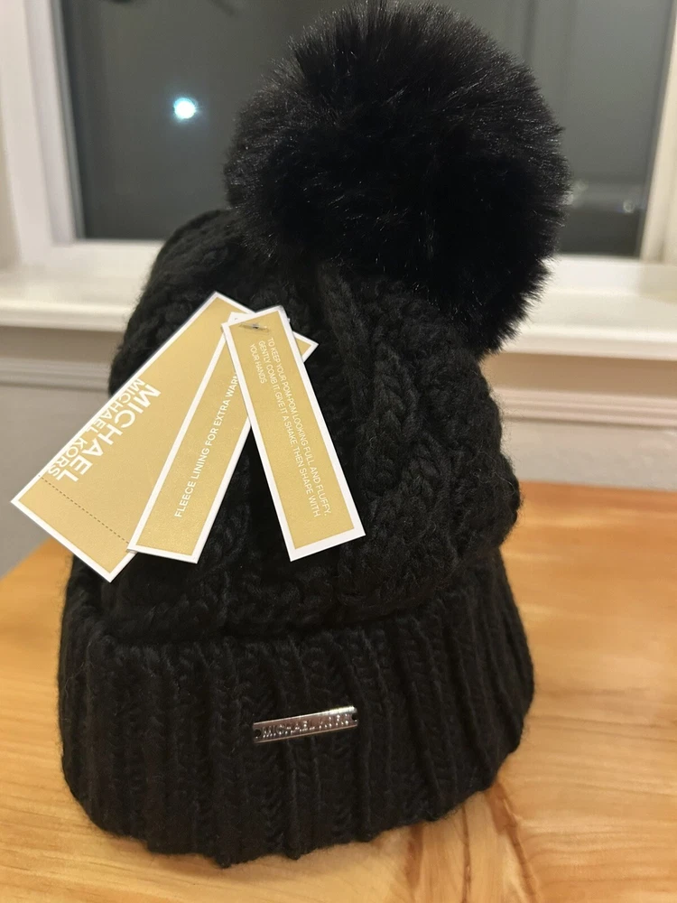 MK tags pictured come with the item, they are no longer attached. Elevate your winter look with this Michael Kors Cable Knit Pom Beanie Hat in Black. The classic and designer theme of this beanie with the iconic Michael Kors logo accent makes it a must-have for any woman's casual or activewear collection. Made of stretchy polyester knit fabric, this beanie is perfect for any one size fits all occasion. This beanie is stylish and functional, providing warmth and comfort during the chilly seasons. The solid pattern and cable character of the knit make it a versatile accessory that can be paired with any outfit. Whether you're traveling, working out, or just running errands, this beanie is the perfect addition to your wardrobe! Thank you!