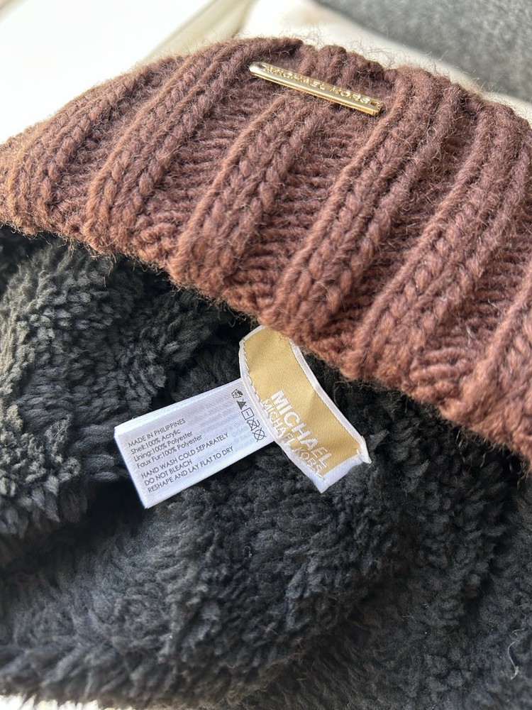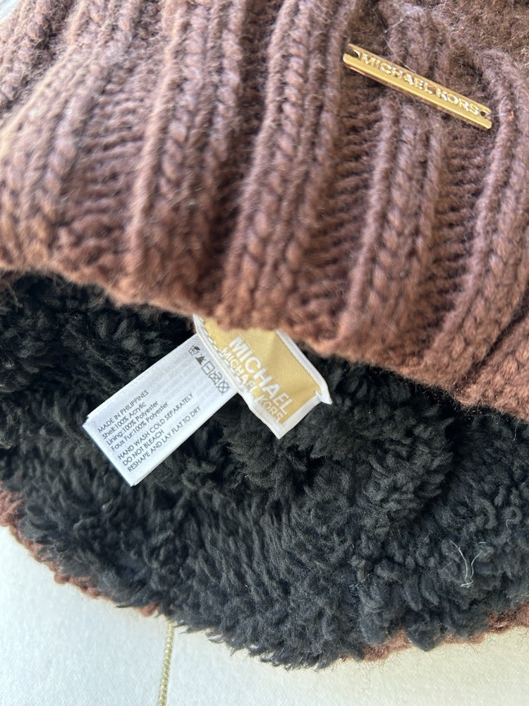 The Michael Kors Cable Knit Pom Fleece Lined Beanie Hat in Brown is a stylish accessory perfect for winter, fall, and spring seasons. Made of polyester knit fabric, this one-size beanie features a cable pattern with logo accents, making it a classic designer piece. The stretchy material ensures a comfortable fit for women on the go, whether traveling, engaging in activewear, or simply enjoying casual outings. With its solid color and high-quality construction, this beanie adds a touch of sophistication to any wardrobe. Thank you, GBC!