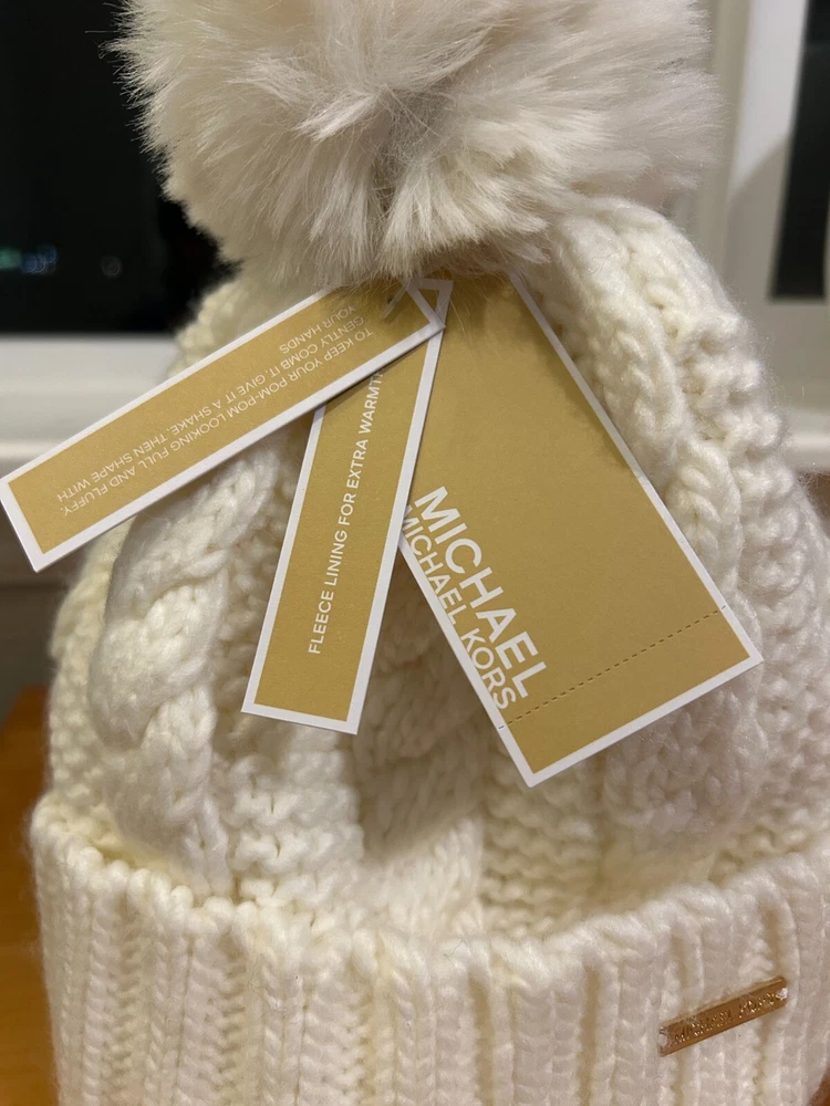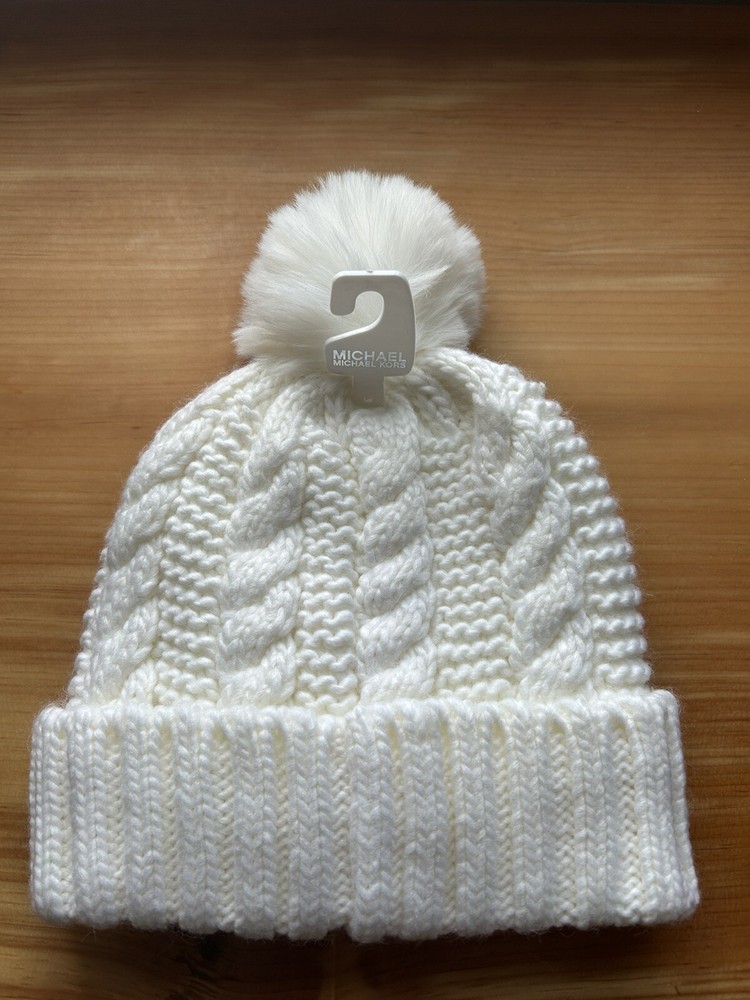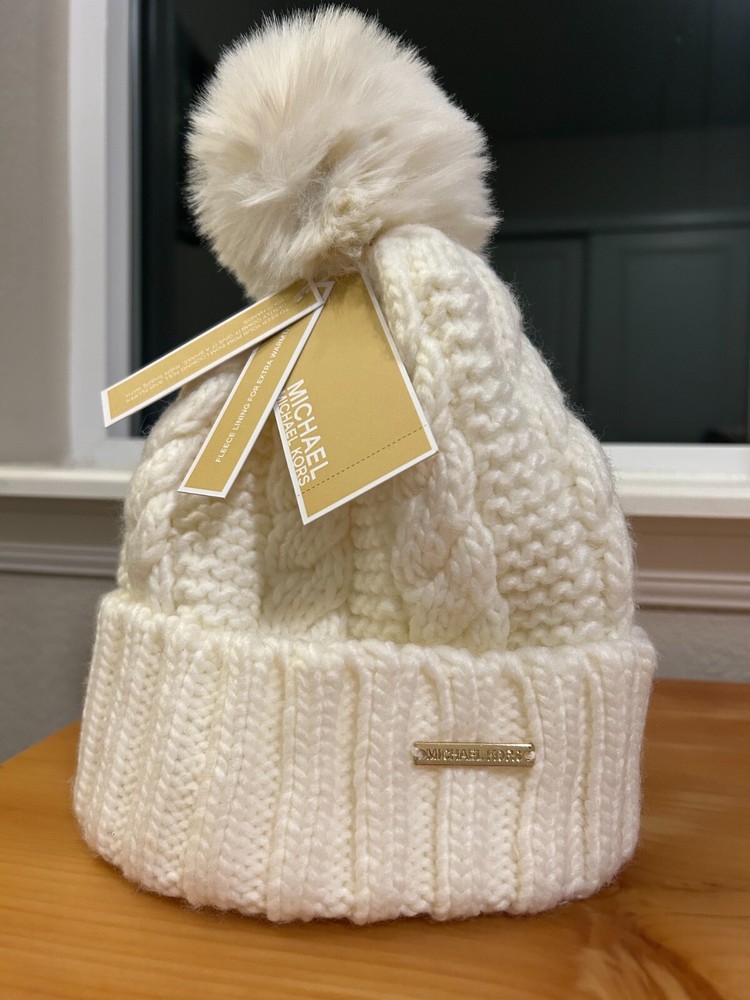 New Michael Kors Fleece-Lined Cable Knit Pom Beanie Hat in White Retail $68
