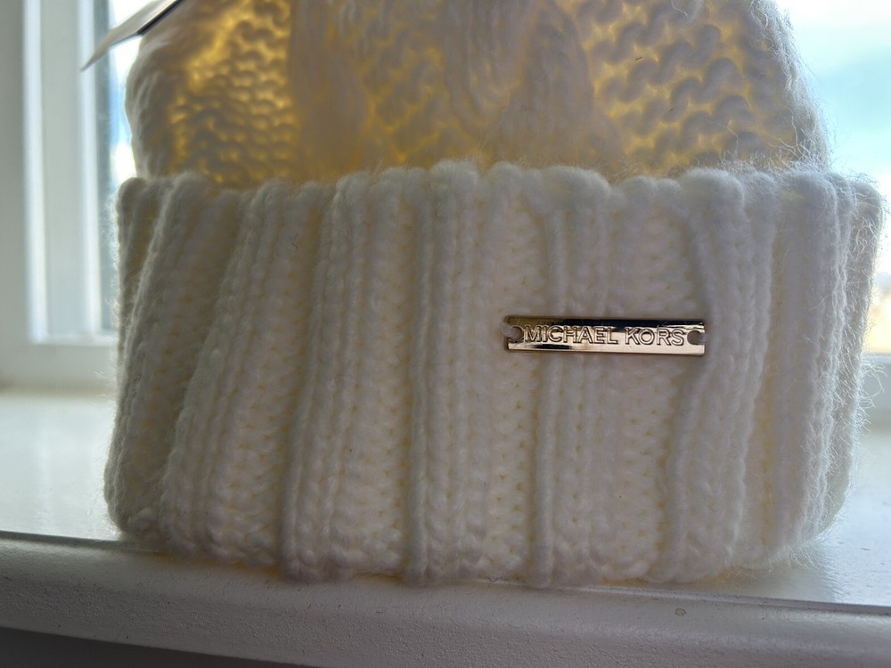 Elevate your winter look with this Michael Kors Cable Knit Pom Beanie Hat in White. The classic and designer theme of this beanie with the iconic Michael Kors logo accent makes it a must-have for any woman's casual or activewear collection. Made of stretchy polyester knit fabric, this beanie is perfect for any one size fits all occasion. This beanie is not only stylish but also functional, providing warmth and comfort during the chilly seasons. The solid pattern and cable character of the knit make it a versatile accessory that can be paired with any outfit. Whether you're traveling, working out, or just running errands, this beanie is the perfect addition to your wardrobe. Thank you!