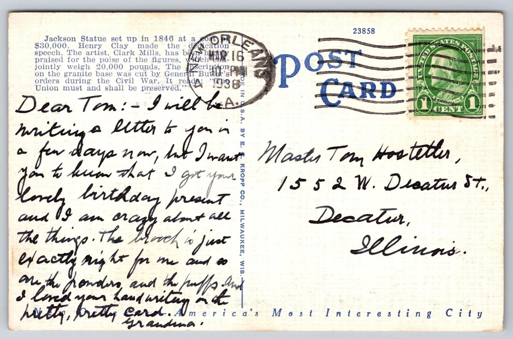 Seller Notes: “Good Vintage Condition.” Location: New Orleans, LA Type: Mail Old Genuine Original Postcard Card Image Picture Antique Region: Louisiana Finish: Matte Color: Multicolor Original/Licensed Reprint: Original Time Period Manufactured: 1930-1939 Size: Standard (5.5 x 3.5 in) Subject: Statue Postage Condition: Posted Country: United States Franchise: Postcard Brand/Publisher: EC Kropp Continent: North America Number of Items in Set: 1 Signed By: Sender Vintage: Yes Features: Divided Back, Stamp, Stamped, White Border, Original Genuine Antique Vintage Postcard Year Manufactured: 1938 Country/Region of Manufacture: United States Artist: Postcard Theme: Architecture, Cities & Towns, Community Life, Famous Places, Landscapes, Roadside America, Social History, Postcard, Original Genuine Antique Vintage Postcard Material: Paper Occasion: Postcard Orientation: Horizontal Character: Postcard Era: White Border (1915-1930) Posted: Yes Antique: Yes Stamp: Yes Unit of Sale: Single Unit Signed: Yes City: New Orleans