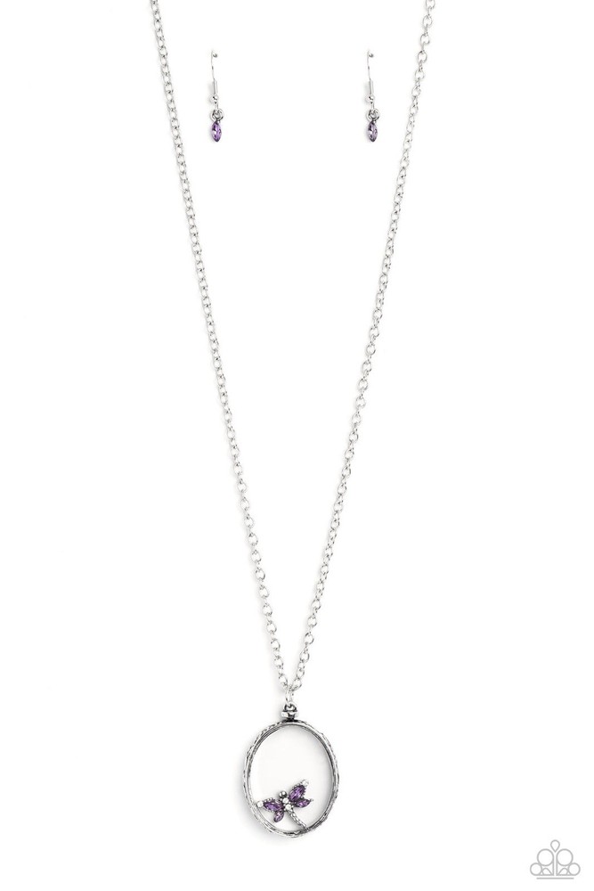 Falling from a high-sheen silver chain, a thick oval pendant with a faceted clear center lengthens the torso as it swings from the bottom of the chain. Swinging from the center of the shimmery pendant, an intricate dragonfly charm, lined with dainty purple and white rhinestones creates additional eye-catching movement. Silver filigree and a dot motif border around the oval design creating whimsical cutouts for an elegantly earthy finish. Features an adjustable clasp closure. Sold as one individual necklace. Includes one pair of matching earrings.