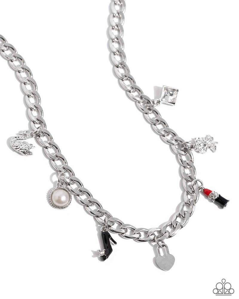 Dancing along a silver curb chain, a collection of trendy charms including a heart lock, a black white-gem embellished high-heel shoe, a red lipstick tube embellished with white rhinestones, a pearl pressed in a serrated frame, a silver rose, a solitaire white gem in a diamond frame, and a silver swan creates a shopaholic statement below the neckline. Features an adjustable clasp closure.