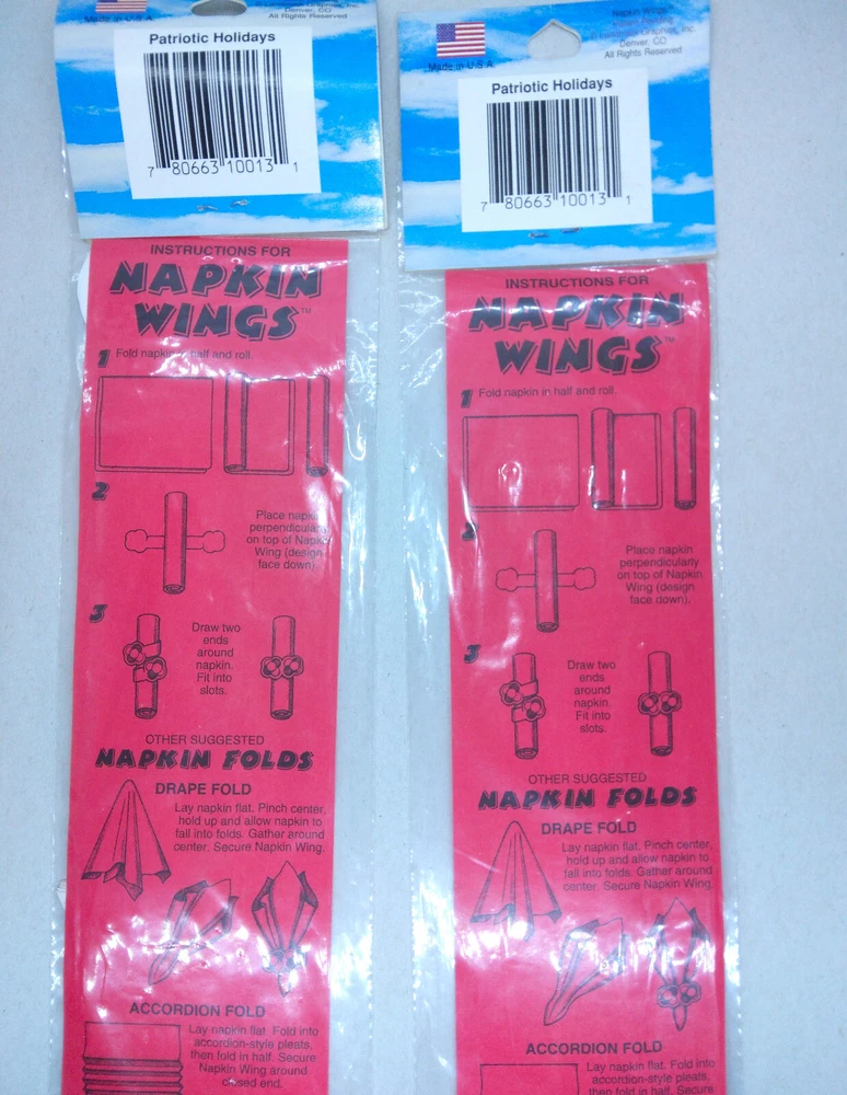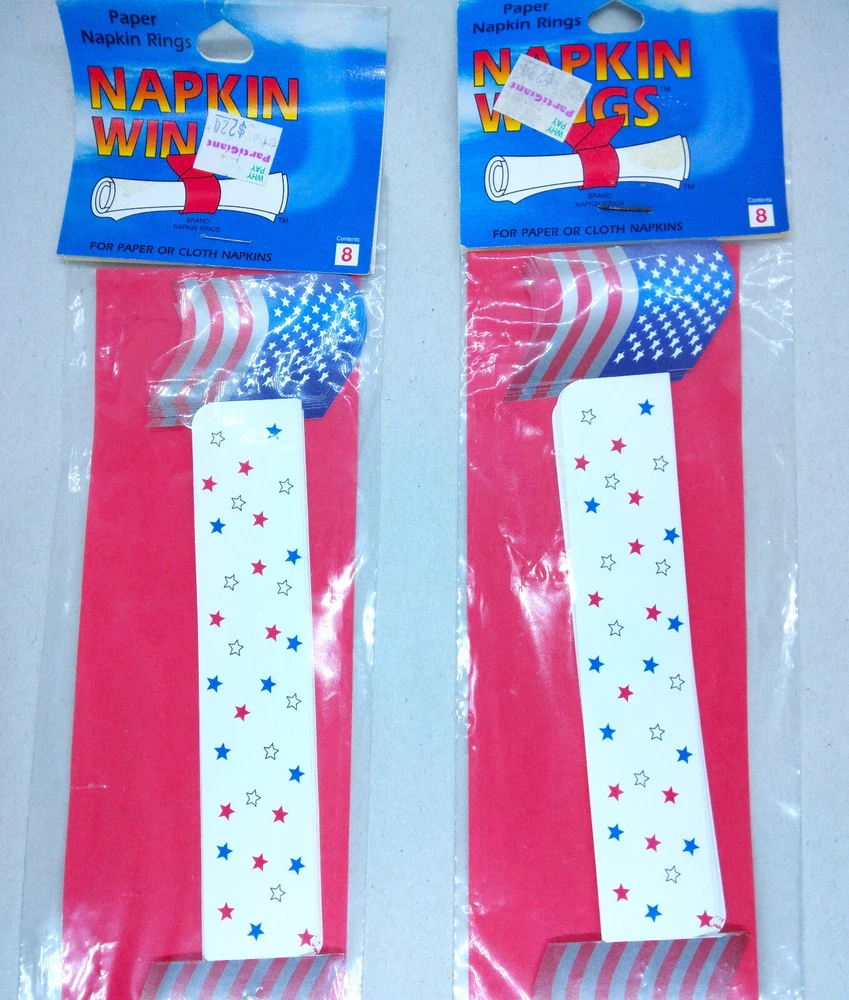 New Patriotic Napkin Wings Rings Decorative, America, 2 Packages of 8. Buyer will receive 16 napkin wings total. Packages are sealed and have never been opened.
