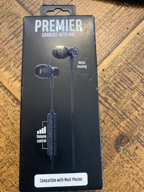Premier Earbuds with Mic, New in Box. In-Line Microphone, Noise Isolation, Single click Answer/End, Double Click Next Track, 3-Click Previous Track, Up/Down Volume.