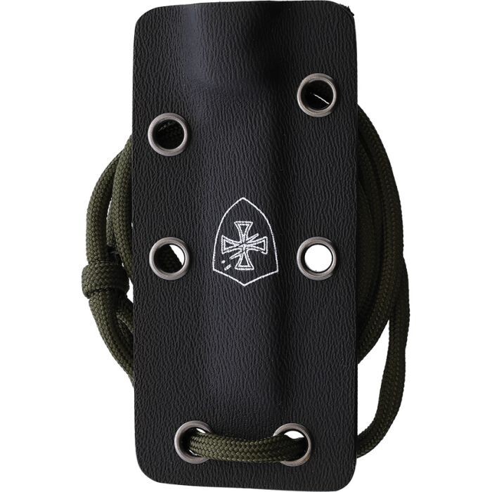 6.63" (16.84cm) overall. 2.5" (6.35cm) satin finish D2 tool steel tanto blade. OD green finger grooved micarta handle. Belt/cord cutter. Full tang. Black Kydex neck sheath. Boxed.