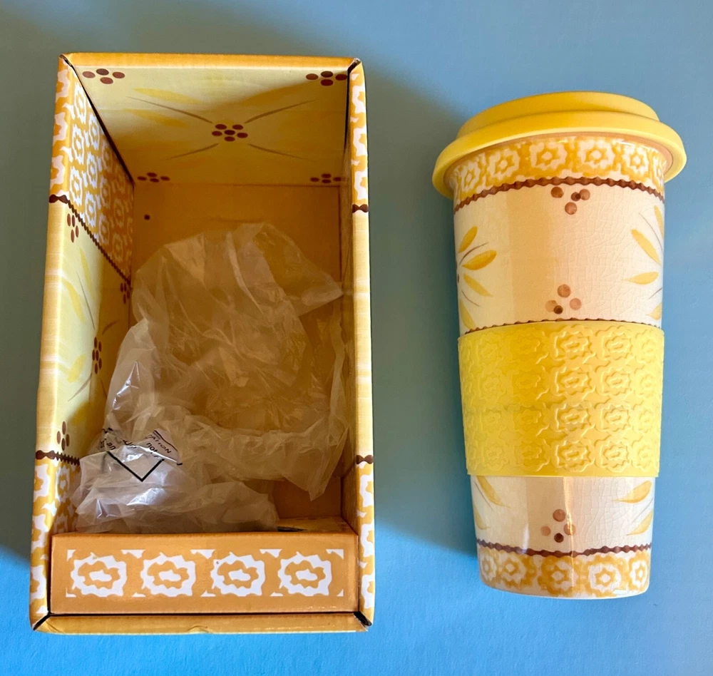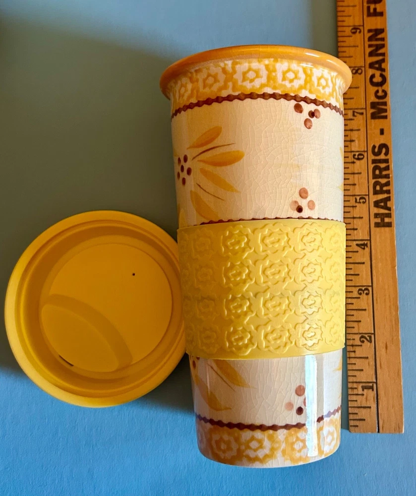 Temp-tations Old World by Tera Hand Painted Yellow Ceramic Travel Tumbler Cup w/ Lid & Band is New in the Original Box. Capacity: 16 fl oz Manufacturers Name Style/Color: Old World/Yellow Good weight - Not flimsy Double Wall insulation. 3.5” W at the top x 7” Ht 7.5” Ht w/lid. See all Photos for Details