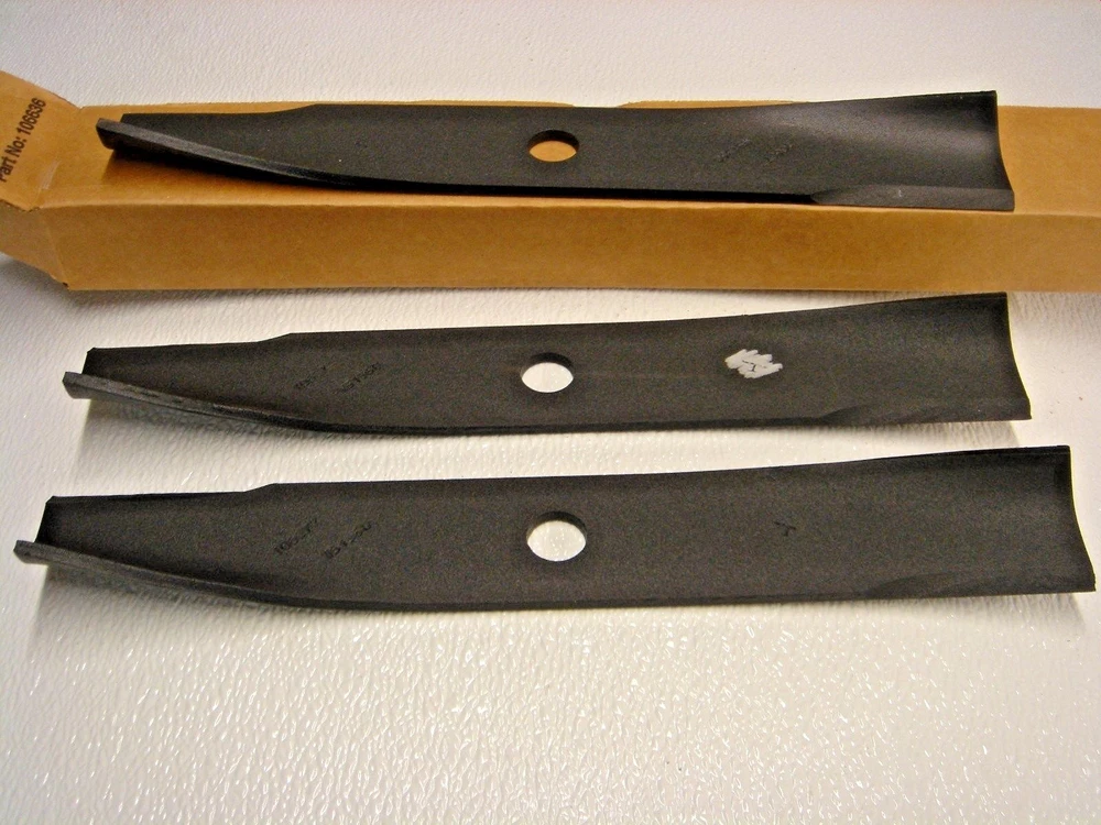 This offer is for 1 complete set (3 pieces = 1 set) of the factory original equipment OEM Toro Wheel Horse part # 106636 42" side discharge blade . This 42" side discharge blade set will fit many 42" side discharge riding mower /garden tractor decks made by Toro Wheel Horse from the 1970's to 2007 garden tractor models ( but NOT the newer LX lawn tractor or Z zero-turn mower models). Dimensions of the blades are: 13 7/8'' long, 2'' wide, 3/4'' center bore and they are .205 thick. These blades have the Toro logo (the big "T" that looks like a bull head) and the old original part # 106077 stamped into them for identification and certification of authentic OEM blades . These are new and unused fresh inventory, still in the original Toro box that they come in. Offered for less than the current MSRP of this blade set. No Reserve!! In stock for immediate shipment!! USPS Priority shipping cost is determined by buyers location / zip code Can't find what your looking for? >> Check out our Store <<- click here please note - this blade set will NOT work on some of the older model decks that have a "D" shaped center hole (differently said- a round hole with two flat sides)- you will need to obtain a different part # blade set, or add adapter bushings to use this set - we no longer have the bushings avail- but I have seen them on the internet- thanks - sherwoods