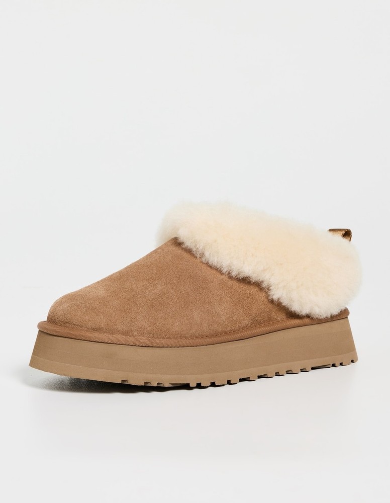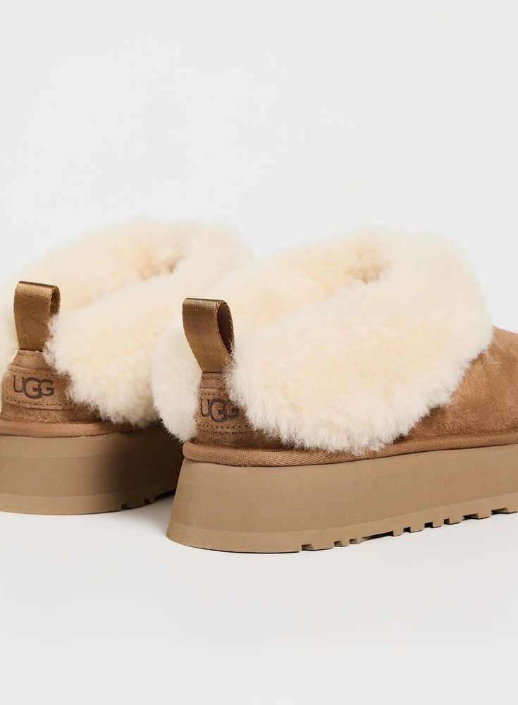 Women Tazzelle Style (Model: 1171393) Chestnut Love the Tazz but want even more UGG® coziness? Our Tazzelle is the one for you. This ultra-plush indoor-outdoor slipper features genuine suede and a lightweight 1.75" platform made from springy sugarcane EVA. Sheepskin lines the interior and continues onto the lush fixed cuff, so you can wear these with socks, or without. Suede upper Sheepskin collar 10mm sheepskin lining 10mm sheepskin insole EVA midsole Sugarcane EVA outsole Textile binding made from 100% recycled polyester fibers 1.75" platform height Production is imported: Vietnam/Thailand/Cambodia/Indonesia/Philippines.