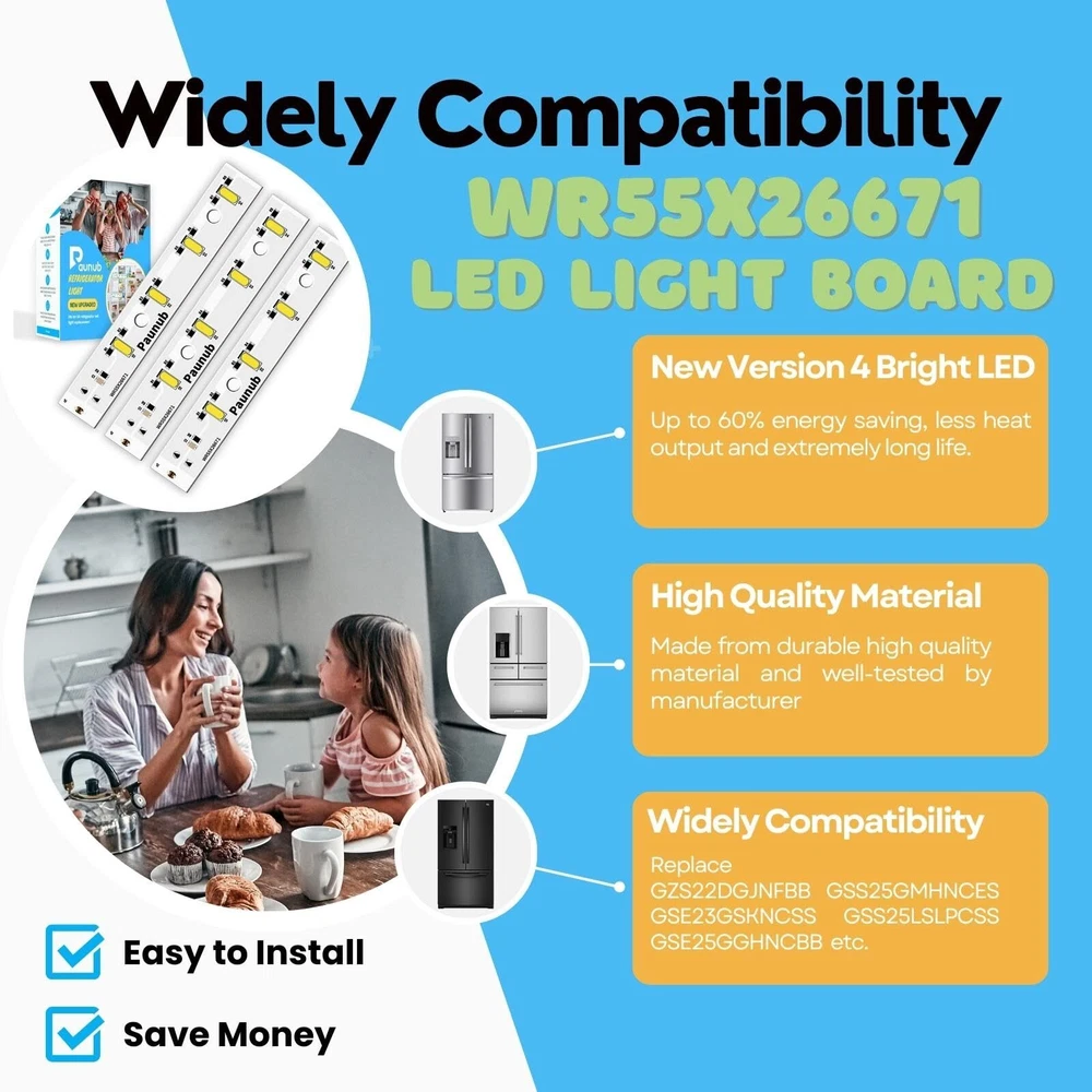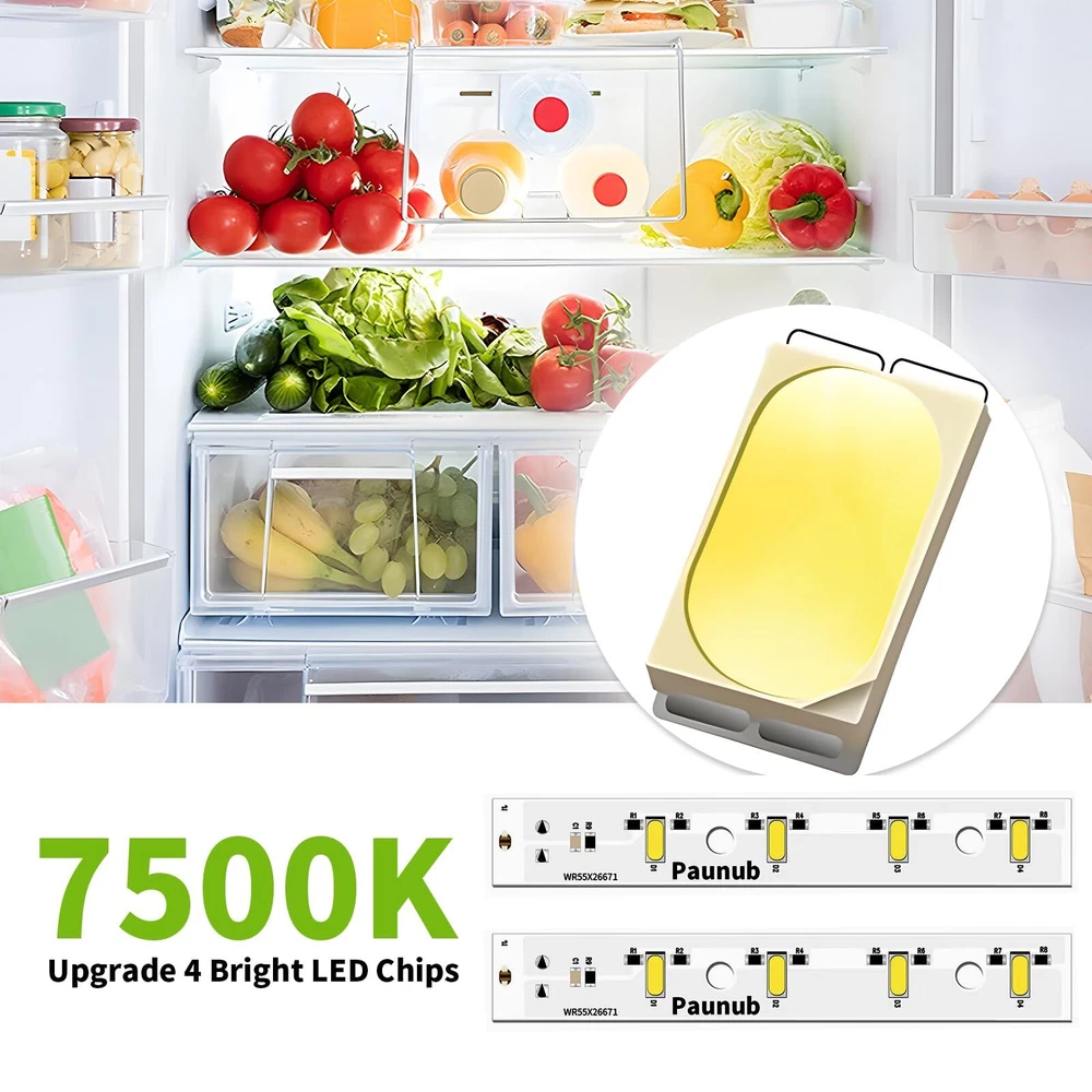 【New Version 4 Bright LED Chips GE Refrigerator Light 】WR55X26671 LED Light Bulb Refrigerators light bulb replacement energy saving and bright. Mainly used for repairing GE freezer refrigerator light bulb. Up to 60% energy saving, less heat output and extremely long life. Save $30 on your electricity bill per year, no longer need to replace frequently. 【Pack of 2 PCS for Money Saving 】GE Freezer Light Bulb Replacement Model: GSE25GGHJCCC GSE25GGHJCWW GSE25GSHJCSS GSE25HEMJHDS GSS25GMHJCES DSE25JGHGCBB DSE25JGHGCWW DSE25JMHGCES PSE25KBLJHTS PSE25KGHGHBB PSE25KGHGHWW PSE25KSHGHSS PSS28KSHGCSS PZS22MMKEHES PZS22MMKGHES PZS22MSKEHSS PZS22MSKGHSS GSS25GSHJCSS 【Compatible for GE Model Refrigerators 】WR55X26671 LED Light part is compatible with models including: 4468532 AP6035586 PS11767930 EAP11767930 CZS22MSKEHSS DSE25JGHECBB DSE25JGHECWW DSE25JMHECES DSE25JSHECSS PSE25KGHEHBB PSE25KGHEHWW PSE25KSHEHSS PSS28KSHECSS GSE25HGHJHBB GSE25HGHJHWW GSE25HMHJHES GSE25HSHJHSS CZS22MSKGHSS DSE25JBLJCTS DSE25JSHGCSS GSE23GGKJCBB GSE23GGKJCCC GSE23GGKJCWW GSE23GSKJCSS GSE25HBLJHTS GSS23GGKJCBB GSS23GGKJCWW 【Super Bright 7500K Daylight white Led Bulb】GZS22DGJNFBB GSS25GMHNCES GSE23GSKNCSS GSS25LSLPCSS GSE25GGHNCBB GSS23GGKNCBB GSE25GGHNCWW GSS25IGNBHWW GZS22IYNPHFS GSS25GGHNCWW GZS22IYNBHFS GSS25LSLNCSS GSS23GSKPCSS GSS25GMHPCES GSS25IBNBHTS XSS25GGHNCWW GSS25GGHPCBB CZS22MP2NBS1 GSE23GGKPCWW GSE23GSKPCSS