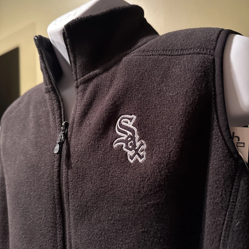 This Vineyard Vines fleece vest is a must-have for any Chicago White Sox fan. Made from durable polyester with a soft fleece fabric type, this black vest is perfect for layering in cooler weather. It features a full zipper closure and the iconic White Sox logo embroidered on the chest. The size is medium and the fit is regular for men. Whether you're at the game or out and about, this stylish vest is the perfect addition to any outfit.