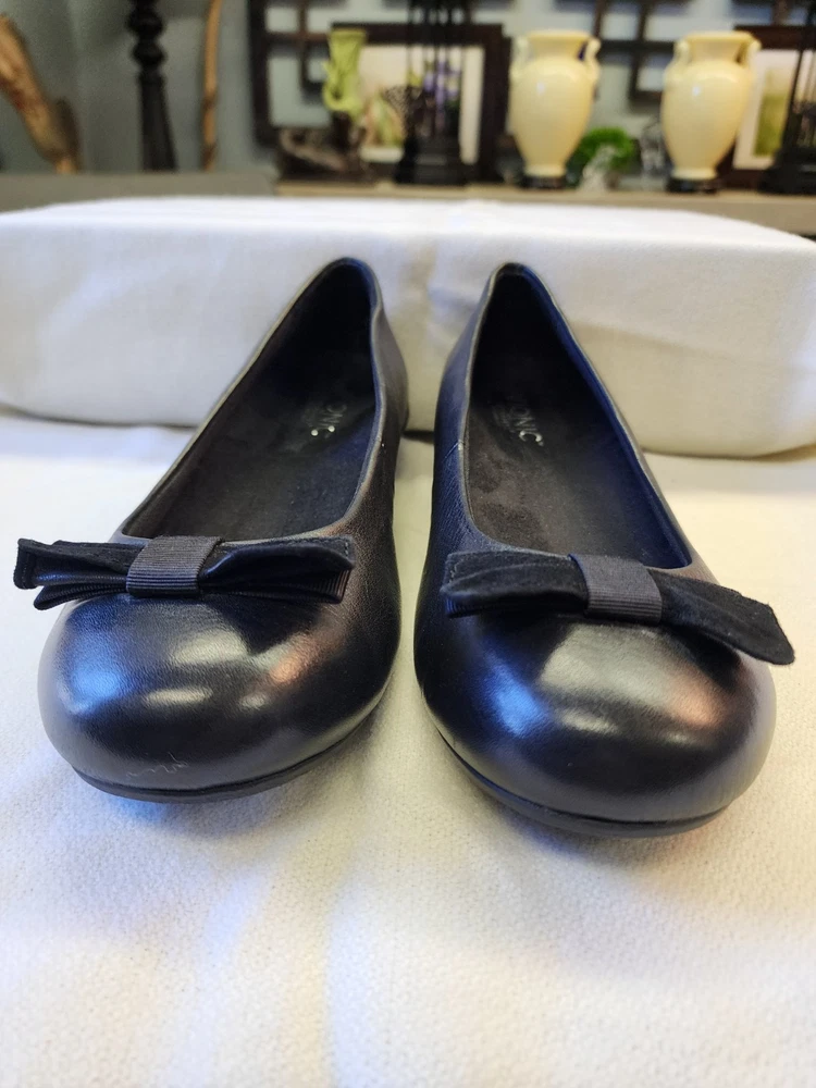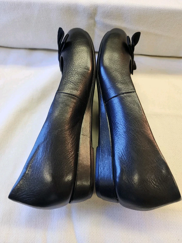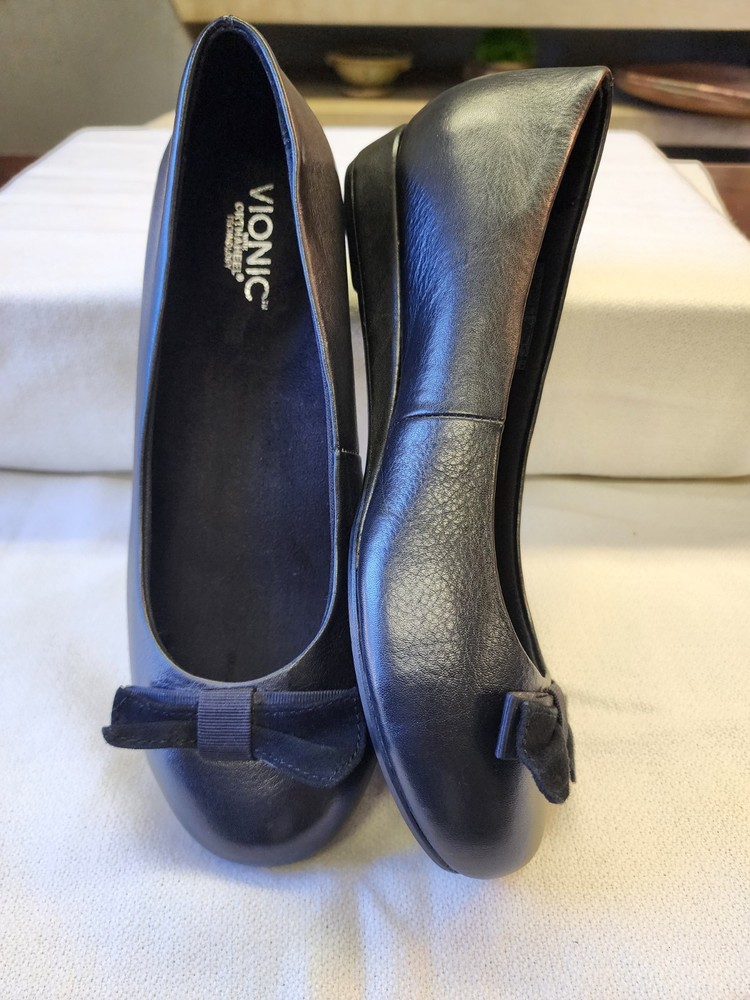 The Vionic 'Lydia' Demi Wedge in Black Leather is a stylish slip-on shoe designed for comfort and support. Featuring a round toe shape, low wedge heel, and bow accent, this shoe is perfect for casual or travel occasions. The shoe is crafted with leather upper material, fabric lining, and a rubber outsole for durability. It also includes features like arch support and motion control, making it suitable for walking activities. The classic design and orthopedic support make it a versatile and practical choice for everyday wear.
