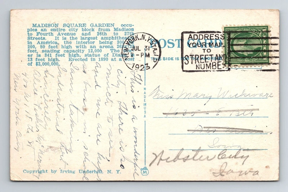 New York City NY, Madison Square Garden, c1923 Vintage Postcard