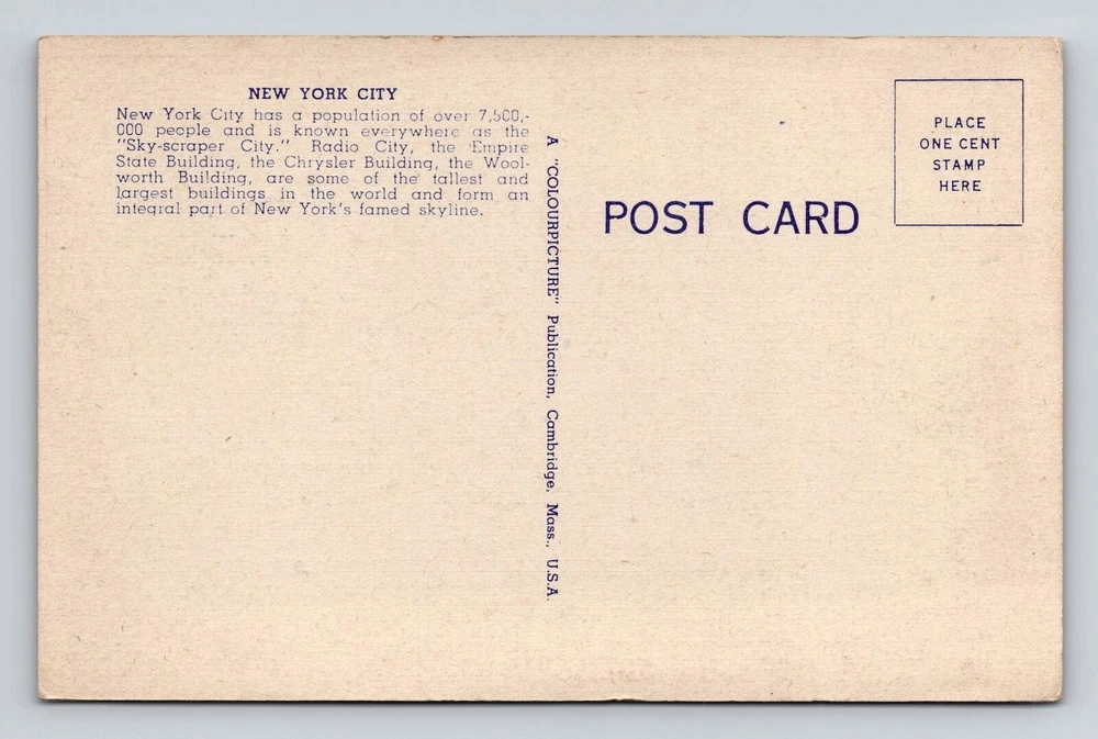 Region: New York Original/Licensed Reprint: Original Country: USA City: New York City Postage Condition: Unposted Theme: Cities & Towns Subject: Cities & Towns Unit of Sale: Single Unit Country/Region of Manufacture: Unknown Type: Printed (Lithograph) Era: Vintage