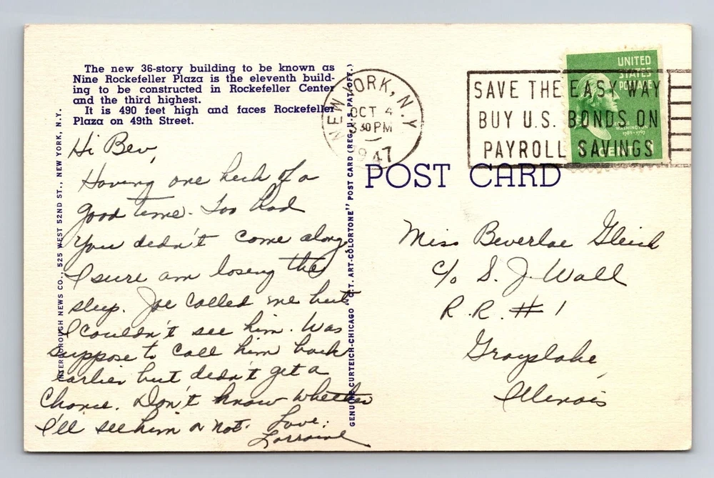 New York City, Nine Rockefeller Plaza, Antique Souvenir Vintage c1947 Postcard