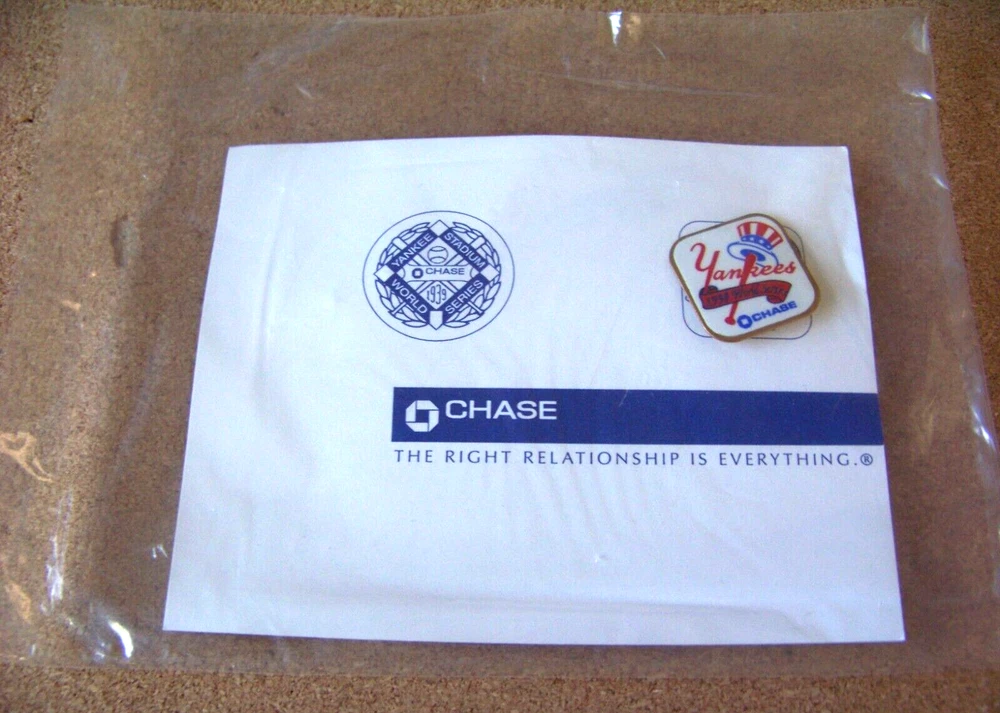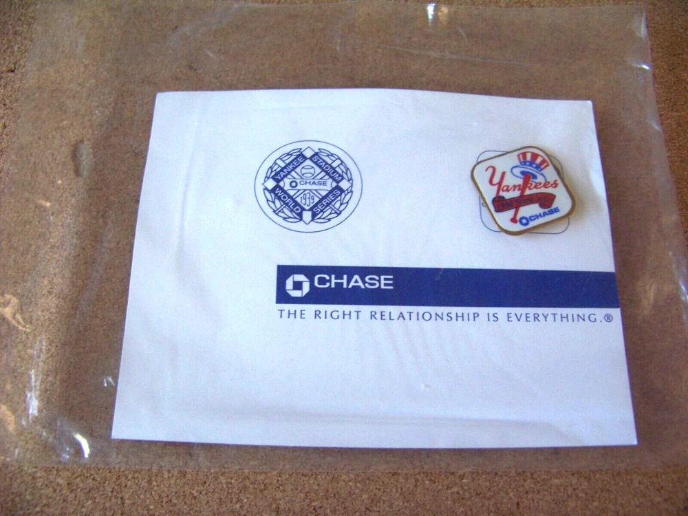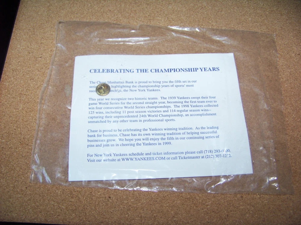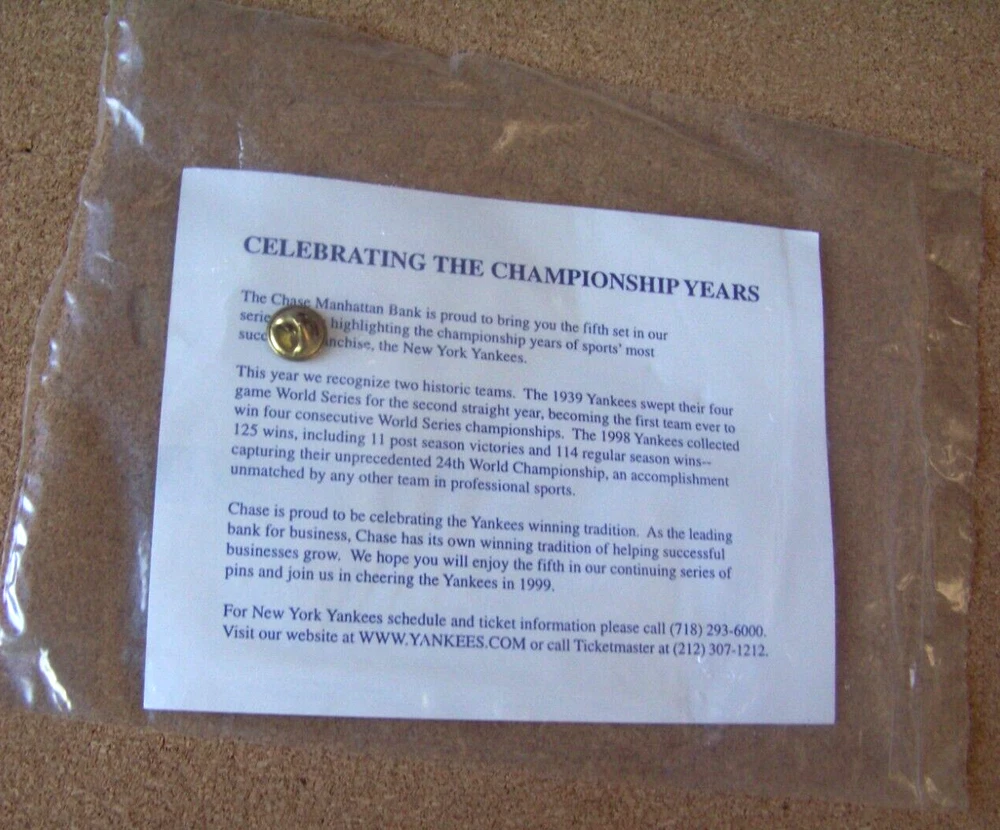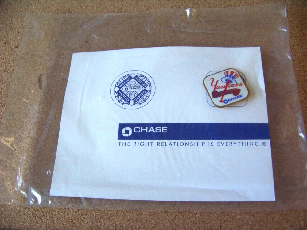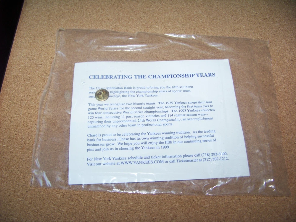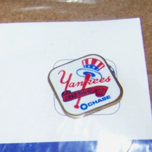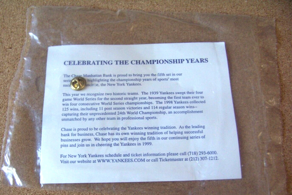 New York Yankees pin 1998 World Series Chase SGA, sealed backing card WS NY This MLB licensed post and butterfly clip backed pin measures about 1-1/4" wide and is rim/backed in gold tones. Part of the Chase Bank series, Yankee Stadium give away. Sealed original protective packaging. Card has minor bends and minor dings on corners. NYY, N.Y. Major League Baseball Don’t forget to click on my "Stores" link, next to my eBay name, to see other items I currently have listed for sale, or you can copy and paste this address into your browser: stores.ebay.com/highcountrycollectibles SHIPPING INFORMATION Shipping to U.S. addresses is FREE! HIGH COUNTRY COLLECTIBLES Since 1989 – A LEADER IN THE DENVER SPORTS MEMORABILIA MARKET. Check out my other auctions and listings, and keep an eye out for the different, unusual, and EXCLUSIVE items available nowhere else but from High Country Collectibles.