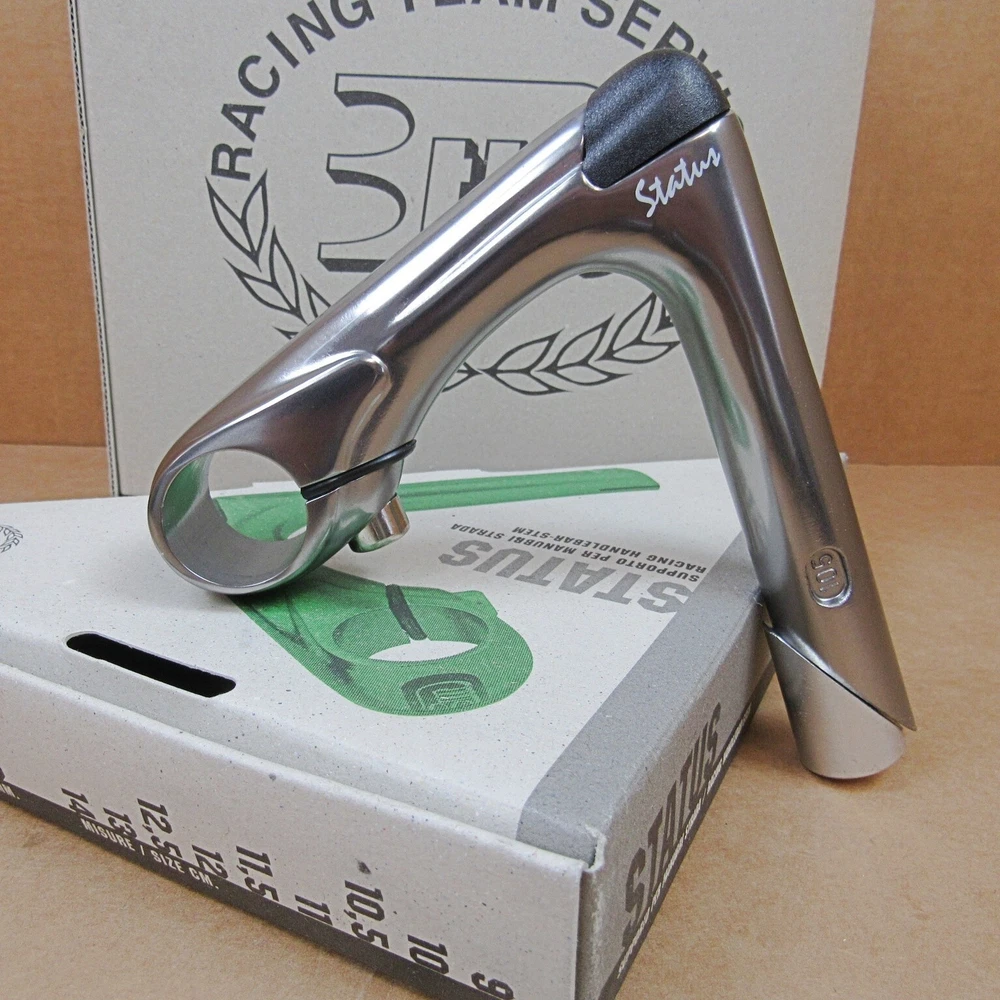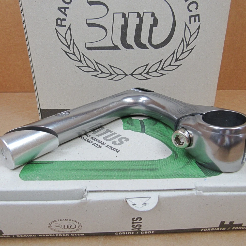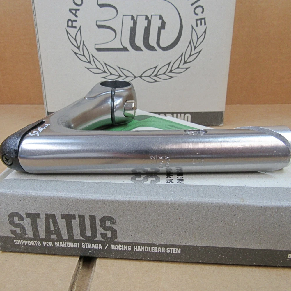 New-Old-Stock 3T Status Quill Stem w/Gray Finish (25.8 mm / 26.0 mm clamp x 105 mm length)...Nice Clamp Expansion Design Feature Thank you for your interest in this item and please visit our store for other offerings. We have very reasonable shipping terms and combine orders to save money (for customers) on shipping costs. We also maintain customer friendly return/refund/exchange policies. Product Description: This item for sale is a new-old-stock 3T Status quill stem. These Italian made stems are very good quality, as they are forged from an aluminum alloy (AL 6082) and were positioned as one of 3T's "Racing Team Services" quill stems (so manufactured to withstand the stresses and demands of competitive cycling/racing). We also like the brownish gray (anodized) finish, as it compliments the stem's sleek styling (which is somewhat unique...the styling that is...among 3T's competition level quill stem offerings). Some of it's more prominent design features and specs include the following... Body length: 105 mm (measured from a profile view of the stem body as a straight line that extends from the center of the quill to the center of the bar clamp) Body angle: 72 degrees (or said another way...a negative 18 degree rise) Quill length: 75 mm (the distance between the limit line and the top of the quill...inclusive of the dust cover, if applicable) Clamp: 25.8 to 26.0 mm (fairly common sizing for many vintage drop handlebars) Quill diameter: 22.2 mm (common size compatible with most 1" threaded forks) Weight: 255 grams (per our digital postal scale and inclusive of all mounting hardware) We also want to point out the 3T Status model is one of only a few Racing Team Services' models (with forged aluminum alloy construction) that has a one-piece clamp design and a partially hidden clamp bolt (meaning the clamp bolt is nicely tucked away on the underside of the stem body). We mention this because some of our colleagues believe there may be inherent weakness in stem clamps when the design includes a detachable face plate or is hinged in some manner. The thought here is that anything other than a solid/continuous (one-piece) design using forged alloy materials is going to result in potential weakness at the pivot (hinged) points or anchor points (in the case of detachable face plates). We do not have any hard data to substantiate these claims, but we thought the discussion points were still worth noting. Having said all of this, we do believe (and think most would agree) that a solid one-piece clamp design is at least equal in strength and durability to the other designs available on the market. The drawback, of course, is the inconvenience of handlebar installation relative to some of these other designs (although, as noted below, 3T modified the design of the traditional one-piece clamp with their Status model to facilitate the handlebar install/uninstall task). It's been our experience that most of these one-piece clamps are only threaded in the main body of the stem. In other words, a clamp bolt will slide through the first section of the bolt-hole, but will not thread until it reaches the the bolt-hole section in the main body of the stem...at which time the clamp bolt will thread and cinch down on the handlebars. The 3T Status stem is different in that it's bolt-hole is also threaded in this first section. 3T's reason for this added design feature is to aid in the expansion of the stem clamp to facilitate handlebar installation. This is accomplished by completely unthreading the clamp bolt, pulling out the rubber washer/spacer and inserting/holding a coin (or equivalent small/flat metal object) in place of the rubber washer/spacer. Once the coin is in place, re-thread the clamp bolt until the end of it comes into contact with the coin. At this point, continue to slowly thread the clamp bolt and the added pressure applied to the coin (while not allowing the clamp bolt to enter the main body of the stem) will slowly expand the stem clamp opening without marring the finish on the bars or stem. The bars still have to be clean (meaning no tape, cable, levers, etc.) to install/uninstall them...so this feature is still not the equivalent of a hinged design or detachable face plate in terms of convenience. However, we thought the preservation of cosmetic condition during the install/uninstall process with one of these stems was still worth noting...and a nice feature not commonly found on stems with solid one-piece clamp designs. We are spending a little more time inspecting each of these retail boxed stems, as we near the end of our stocks. Honestly, we may be splitting hairs with some of these inspections, as none of them are cosmetically perfect upon close scrutiny. Although, any cosmetic issues are usually fairly minor and may consist of, among other things, small blemishes in the form of forging/finishing imperfections coming out of the factory. In other words, we sometimes observe small/shallow dimples, pin-sized holes, thin lines, etc. in the stem body that appear to be the result of an imperfect forging process. We believe this to be something that occurred at the factory, because the anodized finish does not appear to be disturbed in these areas...meaning the finishing/anodizing process was completed after the forging imperfections were created. We also see some instances where the stem may not have been properly cleaned prior to the anodized finishing work. More specifically, there may be some other small cosmetic irregularities on the stem body (i.e., there may be some small/residual metal pieces, etc. that should have been cleaned/removed from the stem body, but were instead covered by the anodized finish). Lastly, we will sometimes identify some shopwear (i.e., light scuffs/scratches) in the anodized finish that is likely the result of several years of storage time. Listing Update...We have begun updating the pictures to reflect the next stem that will sell/ship. Although, please keep i