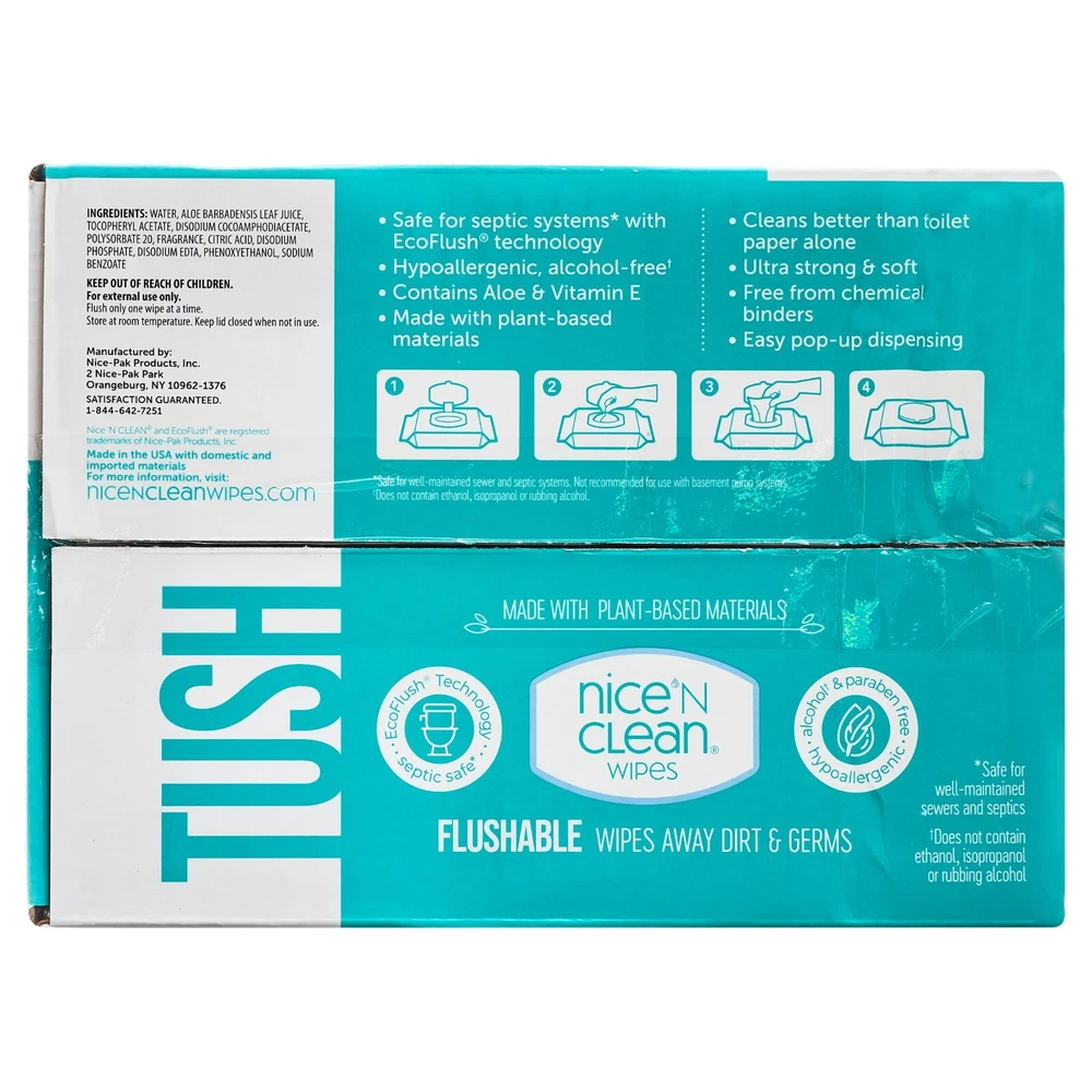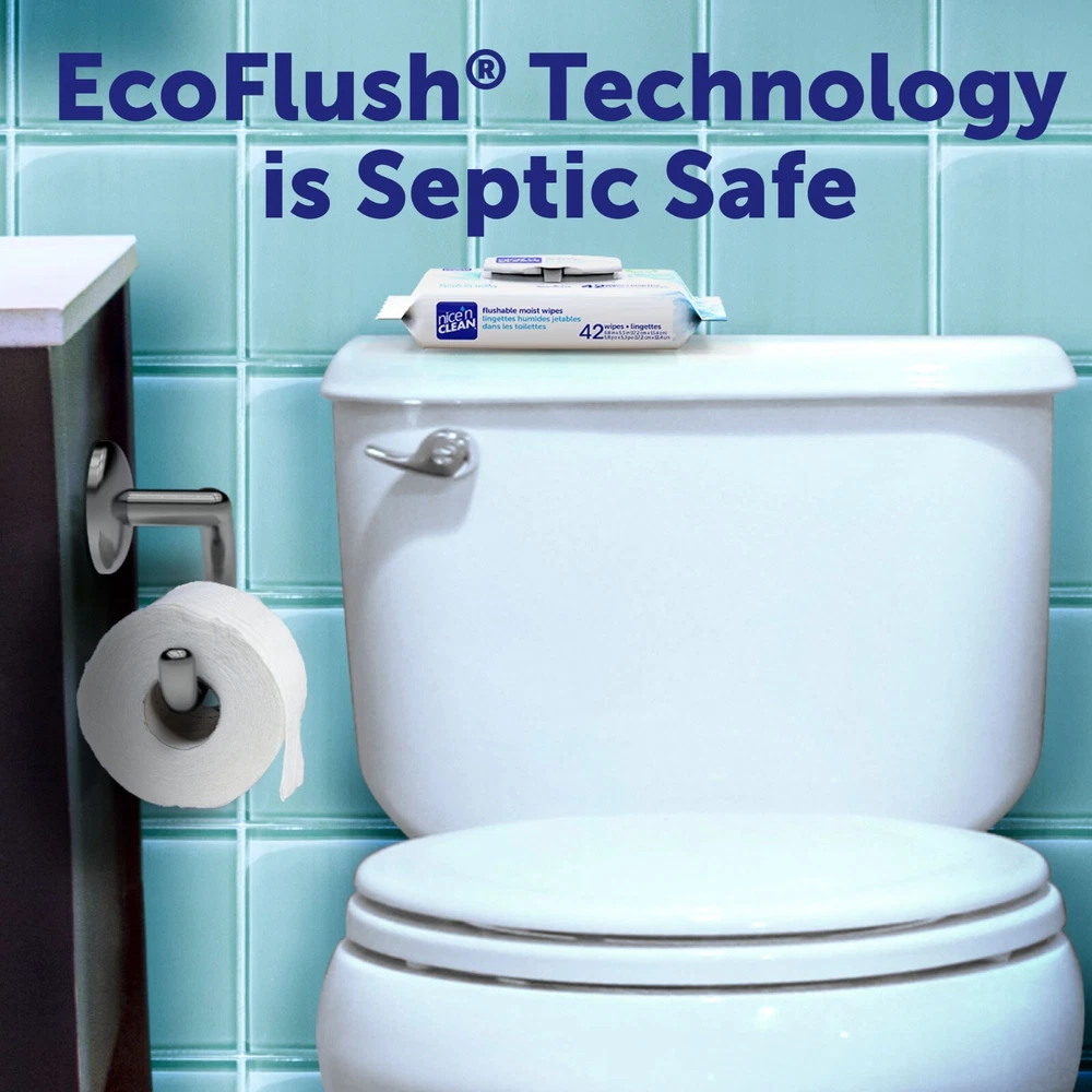 Product details Flushable wipes with aloe and vitamin E Softer than regular toilet paper Septic-safe flushable wipes made with Eco Flush Technology and 100% plant-based fiber Wet wipes, flushable in well-maintained sewers and septic systems as a complement to toilet paper Nice 'N Clean Thick and Soft Flushable Wet Wipes are strong, soft wet wipes that can be easily flushed in any well-maintained septic system. Eco Flush technology allows us to make flushable wipes with 100% plant-based fiber that feels great and flushes easily. Our stylish packaging has a resealable Moisture Lock Lid to dispense and store wipes quickly and easily. Nice 'N Clean makes for great toddler wipes to clean up spills or help make potty training easier With this 5-pack of 60 wipes each, you can have a wipe within reach wherever you need one. Truly Flushable Wet Wipes the Perfect Toilet Paper Complement With Nice 'N Clean, you can finally use wet wipes that are softer than toilet paper, flushable, and clean better than toilet paper alone. Thick and Soft Flushable Wet Wipes’ 100% plant-based material and Eco Flush technology make for wipes that are easier to flush than ever. They’re great for everyday use and perfect for potty training These wipes are also proven to pass through sewer systems and are compatible with wastewater treatment plants. Pick up our flushable wet wipes and see what you’re missing out on today Resealable Moisture Lock Lid is Convenient and Discreet These septic-safe flushable wipes aren’t just high-quality and comfortable, they’re easy to use, too All 5 pouches in this 5-pack are equipped with an easy-open resealable dispenser with a Moisture Lock Lid. Anyone can easily open the lid, take a wipe and close it back again with a single hand. Nice 'N Clean flushable wipes work great alongside incontinence products as a simple, discreet package of adult wipes. Hypoallergenic, Alcohol-Free, with Aloe and Vitamin E Rough, scratchy wipes or toilet paper can cause discomfort, dehydrate your skin or even cause an allergic reaction Nice 'N Clean Thick and Soft Flushable Wet Wipes are completely hypoallergenic and alcohol-free. Each wipe is even infused with vitamin E and aloe Nice 'N Clean takes pride in producing quality wet wipes that anyone can use comfortably. Wet Wipes with a Commitment to Sustainability At Nice-Pak Products, Inc. (the maker of Nice 'N Clean), we are committed to caring for your family as well as the Earth. That’s why we design several of our products with gentle and sustainable materials. Nice 'N Clean Thick and Soft Flushable Wet Wipes are made from 100% sustainably-sourced plant-based fibers. They also contain no artificial chemical binders. These practices make the wipes easier to flush, more comfortable to use, and smarter for our planet. Now that’s a flush you can feel good about Ultra Thick and Soft Wet Wipes, Made with Care The Nice 'N Clean Purpose, Helping families stay healthy and well, one wipe at a time. Since founding our family-run company in 1957, we've been guided by a vision to provide gentle yet effective products that meet the specific needs of caring parents, their families, and the environment. When it comes to our loved ones, we only use the gentlest and highest quality pre-moistened wipes. We know that you want the same for yours. Safe for well-maintained sewers and septic. Flush only one wipe at a time. Ultra-thick and soft wet wipes; more comfortable and reliable than toilet paper alone Flushable wipes for a comfortable complement to toilet paper Aloe and vitamin E in every wipe Clean, comfortable toddler wipes perfect for potty training or small spills 5-Pack of wet wipes with 60 wipes each 300 total wipes Easy-to-use, discreetly dispensing wet wipes Perfect for use with incontinence products Not recommended for use in motor homes or basement pump systems