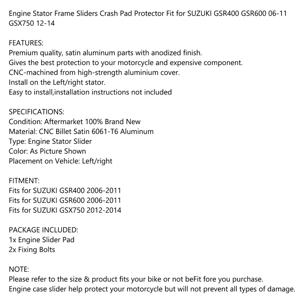 You may also like Injection ABS Bodywork Fairing Kit for Yamaha MT-09 / MT-09 SP 2021-2023 04# 405.85 USD Free shipping Tachometer Case Speedometer Cover 5" Trim Black For Glide Softail Fat Boy Fxst 21.85 USD Free shipping Gold Stator Crash Sliders Engine Guard Left for Honda CMX 500/300 Rebel 17-2019 26.85 USD Free shipping Side Air Intake Vent Panel Cover Fairing Cowl for Honda X-ADV 750 XADV 2017-2020 58.85 USD Free shipping Axle Slider Wheel Protect Axle Guard A-Chrome Fit For Bmw R Nine T R9T 2020-2021 27.41 USD 28.85 USD Free shipping 5% off Carbon ABS Radiator Panel frame Fairing For Suzuki GSX-S 1000 2015-2020 132.85 USD Free shipping Seat Side Cover Bench patent leather Fairing Cowling For Kawasaki Z900 17-19 36.85 USD Free shipping Cnc Anti-Crash Frame Sliders Protector Titanium Fit For Cfmoto 450Sr 2022-2023 19.85 USD Free shipping Aluminum Shifting Gear Lever Stabilizer Black For Honda Cb650R Cbr650R 19-21 16.85 USD Free shipping Cnc Engine Cover Plate For Kawasaki Vulcan S Abs Vn650 15-20 Cafe En650 Green 21.85 USD Free shipping Right Black Crankcase Cover Crash Guard for Honda Rebel 300 500 CMX 2017-2019 UE 24.85 USD Free shipping Gas Fuel Tank Side Cover Fairing Panel Cowl Trim for Yamaha YZF R6 2006-2007 41.85 USD Free shipping English Engine Stator Frame Sliders Crash Pad Protector Fit for SUZUKI GSR400 GSR600 06-11 GSX750 12-14 FEATURES: Premium quality, satin aluminum parts with anodized finish. Gives the best protection to your motorcycle and expensive component. CNC-machined from high-strength aluminium cover. Install on the Left/right stator. Easy to install,installation instructions not included SPECIFICATIONS: Condition: Aftermarket 100% Brand New Material: CNC Billet Satin 6061-T6 Aluminum Type: Engine Stator Slider Color: As Picture Shown Placement on Vehicle: Left/right FITMENT: Fits for SUZUKI GSR400 2006-2011 Fits for SUZUKI GSR600 2006-2011 Fits for SUZUKI GSX750 2012-2014 PACKAGE INCLUDED: 1x Engine Slider Pad 2x Fixing Bolts NOTE: Please refer to the size & product fits your bike or not beFit fore you purchase. Engine case slider help protect your motorcycle but will not prevent all types of damage. Deutsch Motor Stator Rahmenschieber Crash Pad Protector Fit für SUZUKI GSR400 GSR600 06-11 GSX750 12-14 MERKMALE: Hochwertige, satinierte Aluminiumteile mit eloxiertem Finish. Bietet den besten Schutz für Ihr Motorrad und Ihre teuren Komponenten. CNC-gefräste Abdeckung aus hochfestem Aluminium. Am linken/rechten Stator installieren. Einfach zu installieren, Installationsanleitung nicht enthalten SPEZIFIKATIONEN: Zustand: Aftermarket 100% nagelneu Material: CNC-Billet-Satin 6061-T6 Aluminium Typ: Motorstatorschieber Farbe: Als Bild gezeigt Platzierung am Fahrzeug: Links/rechts EINRICHTUNG: Passend für SUZUKI GSR400 2006-2011 Passend für SUZUKI GSR600 2006-2011 Passend für SUZUKI GSX750 2012-2014 LIEFERINHALT: 1x Motor Slider Pad 2x Befestigungsschrauben HINWEIS: Bitte beachten Sie die Größe und das Produkt, die zu Ihrem Fahrrad passen oder nicht passen, bevor Sie es kaufen. Motorgehäuseschieber schützen Ihr Motorrad, verhindern jedoch nicht alle Arten von Schäden. -About US Founded in 2012, VIPJQ have professional development and sales, and are involved in various products, providing customers with various high-quality products. Since its establishment, VIPJQ has always adhered to the service concept of "customer first" and the management concept of "pursuit of quality", and is committed to providing customers with high-quality original designs. We commit to provide you the best innovative, quality products & professional services with competitive prices. We value every customer, and we look forward to providing solutions for your business needs to help your business achieve its goals, please contact us immediately! We are all about you! We are a Japanese seller,but with large warehouse in USA. We are profesional on Auto Parts,Car Parts,Motorcycle Parts,3C,other hot sale items and so on. We aim to provide to customers high quality product and best service. -About Shipment&Returns The item usually will be dispatched within 3 days after you ordered.All are free shipping. And it usually takes 3-10 working days to delivery depends on buyers' address or other majeure on the way. If you are not satisfied with the items and want to return the item,we hope you could message us first,we will give you the return details, we think we could give you the best service to save your time and money.Thank you. -About Feedback&Customer Service If you are enjoy your shopping here,not only enjoy the items but also the service,we are appreciate you could give us a 5-star feedback. If you are not satisfied with the item,before you give us the negative feedback,we hope we could give you the best solution through our commutication. We think we could do it if you give us the chance.Thank you.