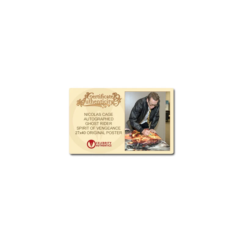 Powered by Frooition Contact Us Add To Favorites Receive Store Newsletter Nicolas Cage Autographed Ghost Rider Spirit of Vengeance Original 27x40 Poster Nicolas Cage Autographed Ghost Rider Spirit of Vengeance Original 27x40 Poster © Celebrity Authentics. All Rights Reserved. Item Description Celebrity Authentics is the exclusive autograph partner of Nicolas Cage. Please be aware most other online autographs purported to be Mr. Cage's are forgeries. Mr. Cage has only signed with Celebrity Authentics so be sure the item you choose is affixed with the Celebrity Authentics Authentication Hologram for his genuine signature. This rare 2017 Ghost Rider Spirit of Vengeance Original 27x40 Double-Sided Movie Poster has been personally autographed by Johnny Blaze himself, Nicolas Cage during his exclusive signing with Celebrity Authentics. Now hiding out in Eastern Europe, Johnny Blaze (Nicolas Cage) is still struggling with the curse of the Ghost Rider -- the devil's bounty hunter. Johnny meets a priest named Moreau (Idris Elba), who asks Johnny to find a boy named Danny (Fergus Riordan) and bring him back. But there's a catch -- Satan (Ciarán Hinds) is looking for the boy too, and has a personal stake in the matter. But if Johnny can find Danny first and save the boy's soul, there's a chance Johnny can save his own soul as well. P oster may have minor edge wear and ships affixed with Celebrity Authentics serial-numbered Authentication hologram and includes Celebrity Authentics Certificate of Authenticity featuring picture of Nic signing the poster. Please note: with multiples signed by the actor, a sample photo is used from stock to represent what you will receive. Exact autograph size and placement may vary. Authenticity Authenticity Our Story Shipping Customer Service Authenticity At the core of every autographed item we release lies our customers peace of mind in knowing that their autograph is 100% authentic. At Celebrity Authentics we ensure this by only authenticating products that we personally witness being autographed by the talent. We do not use third party suppliers, authenticators or opinion companies to acquire or authenticate our product. Every item we offer is obtained through autograph signings we conduct and witness. This strict and unwavering dedication to authentication has made Celebrity Authentics the most trusted name in authentication worldwide. Over the past decade we have developed innovative systems to terminate forgeries and guarantee our customers ironclad authenticity. The Hologram The Hologram is the cornerstone of our authenticity and is much more than just a series of numbers. Each tamper-proof Hologram provides an identification number that is unique to the specific item it's affixed to. This number can then be validated through our online Authentication Database to verify the authenticity of your item, presenting full signing details for your collectible including the date and location it was signed along with photo/s of the Talent singing. This form of Authentication used by Celebrity Authentics is the FBI's recommended means for authenticity. Certificate of Authenticity Additionally, every Celebrity Authentics item is accompanied by our industry defining Certificate of Authenticity (COA). Making a perfect display piece itself, our COA denotes the product title and features a photographic image of the Talent signing. This photographic proof is just one more reason why Celebrity Authentics products have seen a remarkable increase in value and demand. Our Story Our Story One fake autograph sparked the beginning of a revolutionary company. A course was then set to provide fans and collectors worldwide with access to hand-signed, genuine autographed editions by their favorite celebrities. When it comes to autograph authenticity, we do not sell opinions - nor do we guess. At Celebrity Authentics, we witness every autograph we authenticate. If we did not witness it being signed by the talent, then we will not offer it - no exceptions. Our autograph signing sessions are arranged and scheduled with the talent through their agent, manager or representative. We do not use autograph chasers that approach talent on the street, airport or similar. Our signings are conducted in a professional setting that can accommodate our large inventory of extraordinary collectibles and provide quality signatures. We are passionate about authenticity and the safeguarding of our product against fraud to maintain the integrity of each autograph. View our Authenticity section and discover how we have pioneered new systems to fight forgeries and ensure every item you receive from Celebrity Authentics is 100% genuine. Not all autographs are created equal. The FBI reported that over 90% of all A-List Actors autographs sold in the marketplace are forgeries. To maintain the integrity of each autograph, we developed and implemented a serial-numbered authentication system and Certificate of Authenticity that includes an industry first - a picture of the talent signing. According to the FBI's research, this is the most effective way to ensure authenticity while effectively eliminating forgeries in the marketplace. Shipping Shipping United States We offer free standard shipping to all addresses located within the Continental USA 48 States. We aim to get your item(s) to you as quickly as possible. Orders typically ship within 1-2 business days from receipt of payment (excluding holidays). You will be able to track your order on the courier's website and a tracking number will be provided upon shipment of your item(s). Please note, you may need to sign for your delivery. Your order may ship via USPS, FedEx or UPS at our discretion based upon the order's weight and size. Expedited shipping is available for an additional fee (please see rates and options at checkout). International Customs If you are based outside the United States, you may also have to pay import duty or other taxes, fees, VAT or cha