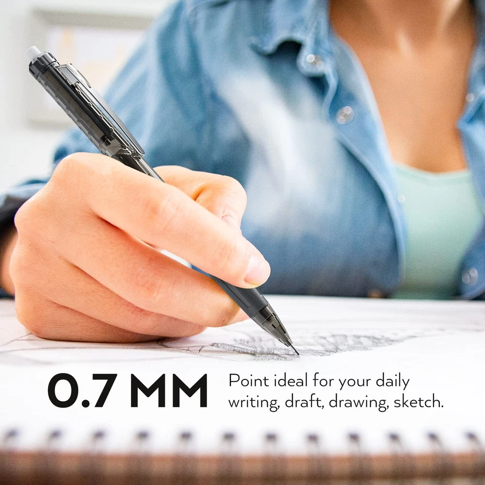 Specification Type: Self Sharpening Mechanical Pencils Size:0.7mm Material:Plastic Color: Black, Blue, Purple Lead Refill Material:resin Color: Black Size: 0.7 mm HB Value Package: Come with 3 pcs 0.7mm mechanical pencil in black, blue and purple colors, 6 tube lead refill and 3 pcs 4B erasers and 6 pcs twist up replaceable eraser refills, a storage case. Easy to click: Convenient click advance button on the side lets you easily advance lead without releasing the pencil. Compact and lightweight Comfort grip: Comfortable, non-slip & extra-soft rubber grip for less writing fatigue. Translucent barrel,refillable erase design. Ideals for artists, professionals, teachers and students alike. Perfect for writing, draft, drawing, sketch, must have for everyday use. 100% RISK FREE PURCHASE: If you are not satisfied with Nicpro mechanical pencil set , we’re very happy to either provide a no-questions-asked Refund or Replacement. Order today risk free!