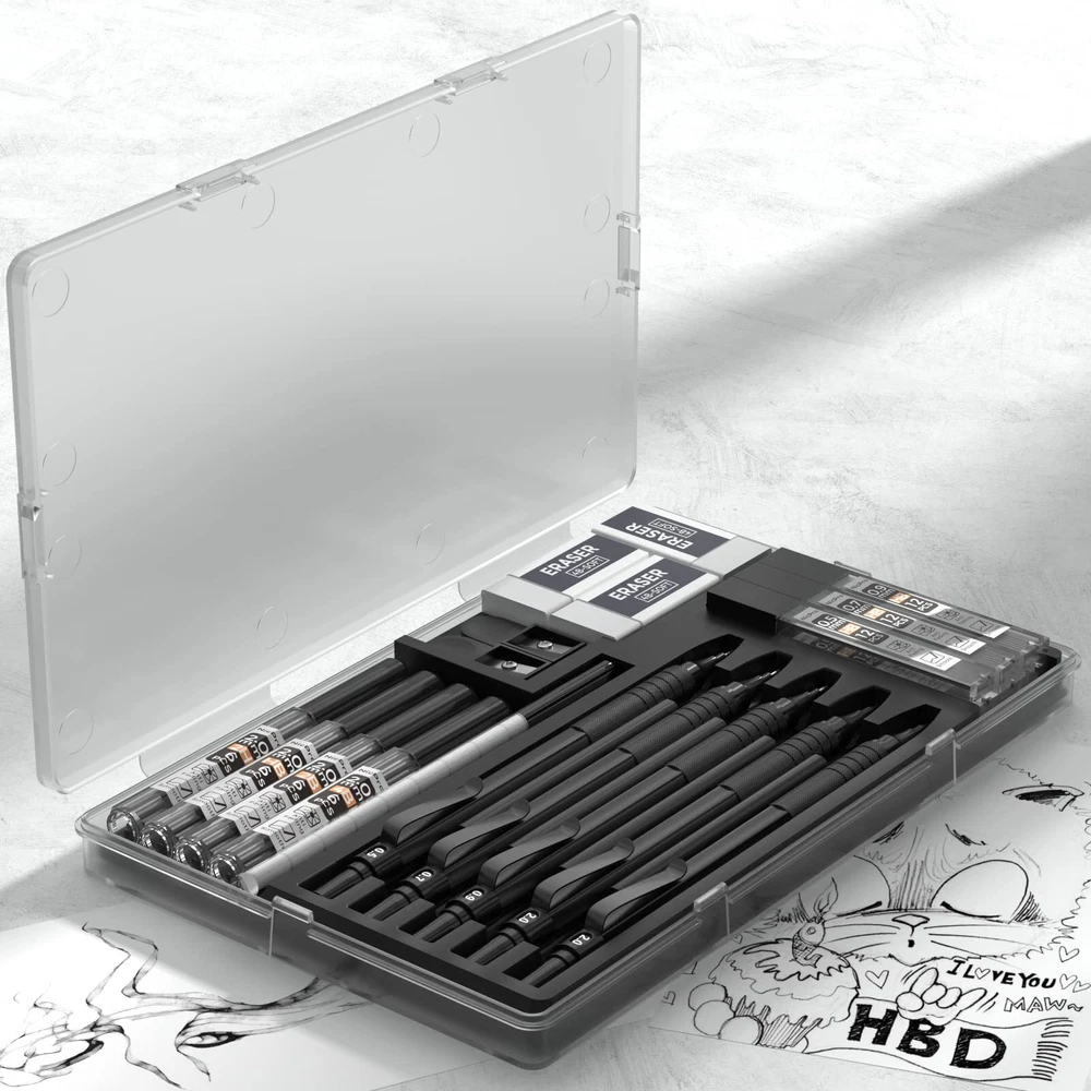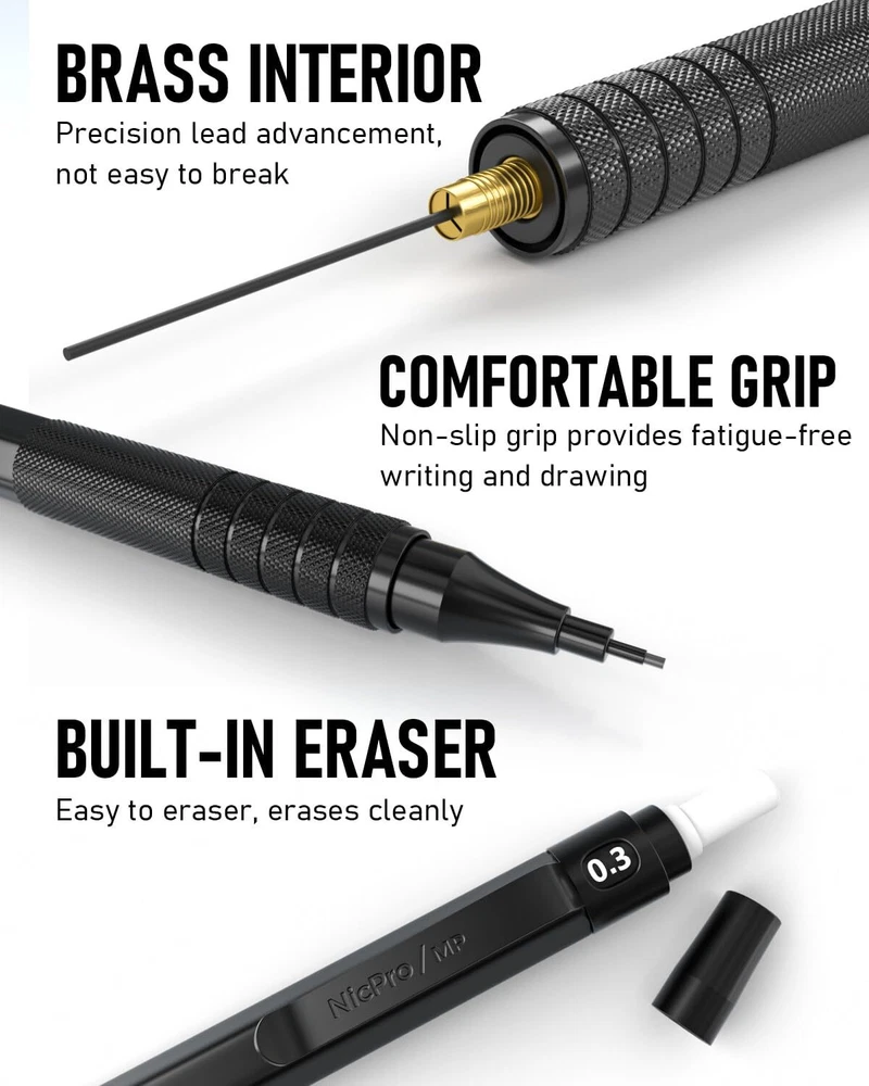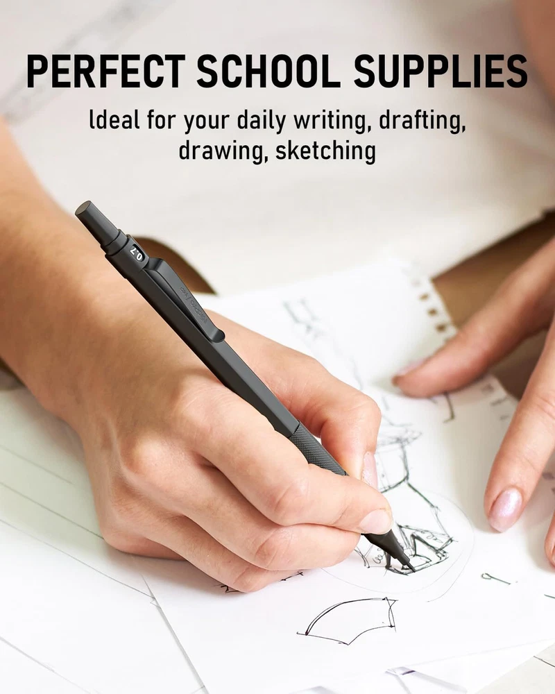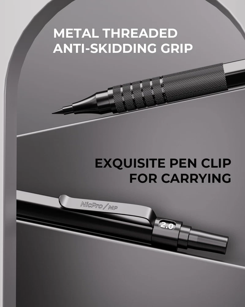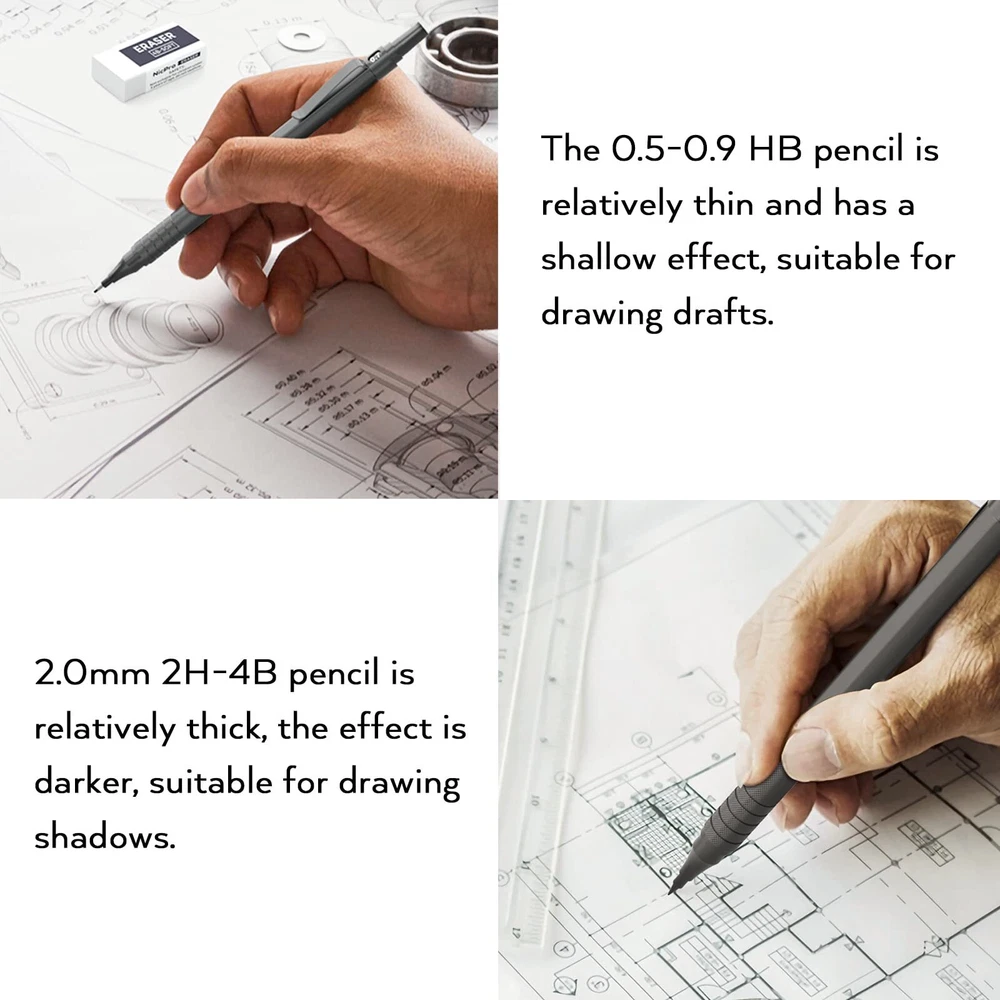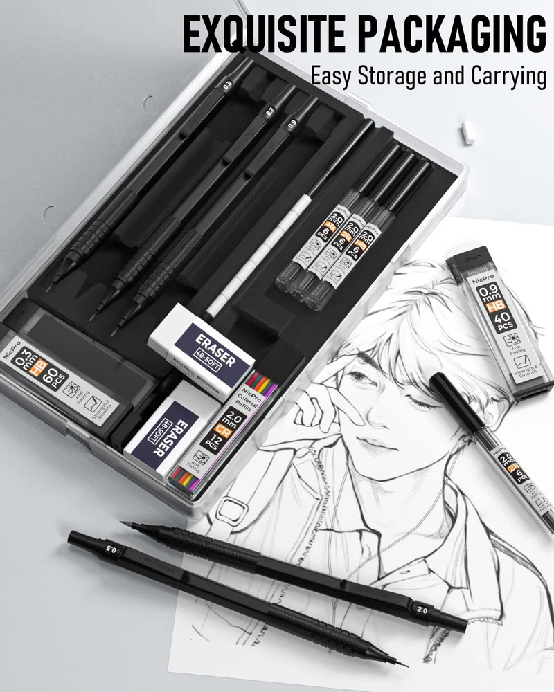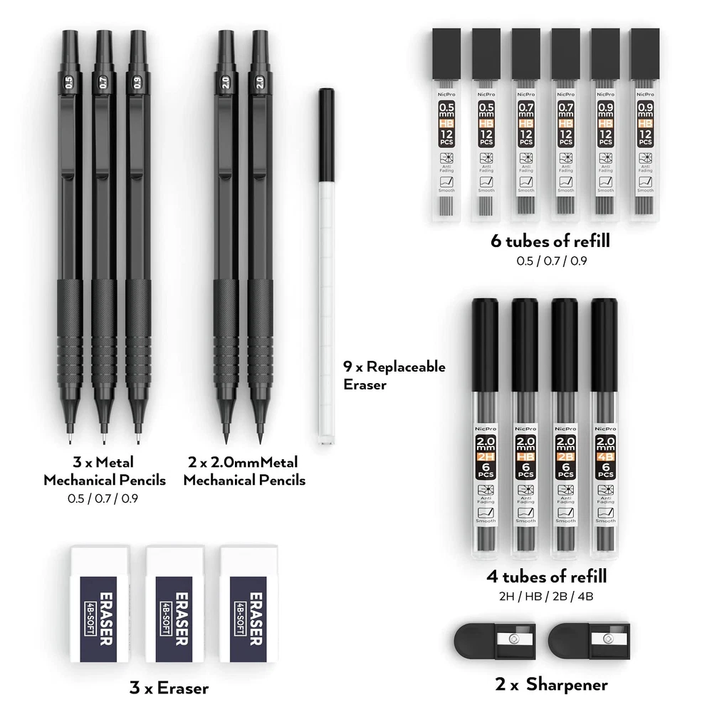 Value Pack: Includes 5 drafting pencils with 0.5mm, 0.7mm, 0.9mm, and 2mm graphite leads, along with 6 tubes of lead refills, 3 erasers, 9 eraser refills, and 2 lead sharpeners for a complete art supply set. Anti-Skid Metal Tube: The lead advances easily with a click and is drop resistant due to the metal threaded design. Weight Balanced Body: The full metal body provides an ideal weight balance for fatigue-free writing and drawing. No Sharpening Needed: The mechanical pencil lead works seamlessly with the drafting pencil for quick and convenient use. Risk Free Purchase: If you are unsatisfied with the Nicpro mechanical pencil set, we offer a hassle-free refund or replacement.