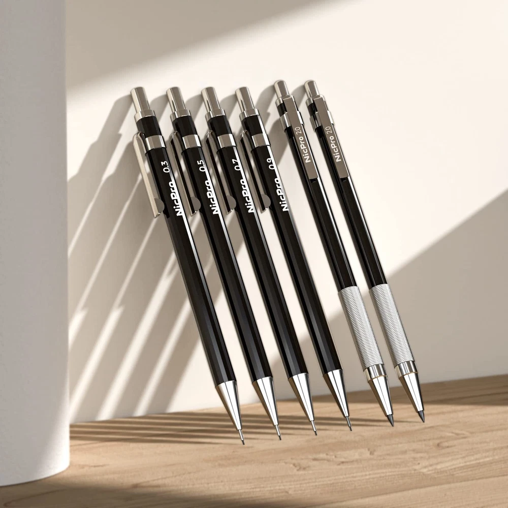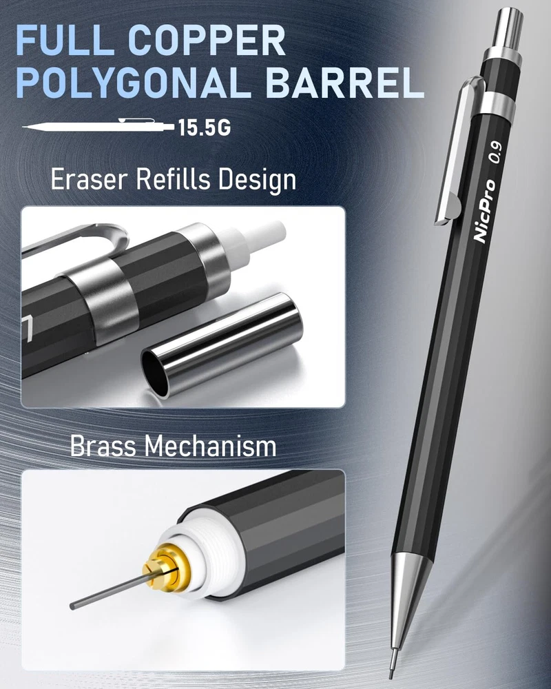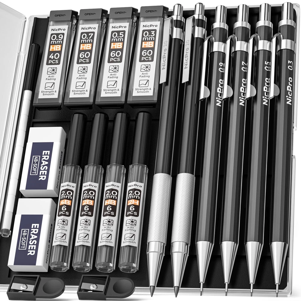 Package Included 0.3 mm mechanical pencil x 1 0.5 mm mechanical pencil x 1 0.7 mm mechanical pencil x 1 0.9 mm mechanical pencil x 1 2mm mechanical pencil x 2 4 tube HB lead refills (0.3mm/0.5mm/0.7mm/0.9mm) 4 tube 2mm lead refills(2H HB 2B 4B) 4B soft eraser x 2 lead sharpener x 2 cap eraser replacement x 9 Durable Metal Body: The full-brass metal body provides ideal weight balance for fatigue-free writing and drawing. Versatile Tip Sizes: Comes with 4mm mechanical pencils with 0.3mm, 0.5mm, 0.7mm and 0.9mm tips for various line sizes. Lead Holder and Sharpener: Includes 2 metal threaded anti-skidding pen tubes with sharpeners for the 2.0mm lead. Erasers and Refills: Comes with 2 erasers and 8 refill tubes for the mechanical pencils. Ideal for Artists and Students: Perfect for writing, drawing, sketching, drafting and more for artists, professionals, teachers and students.