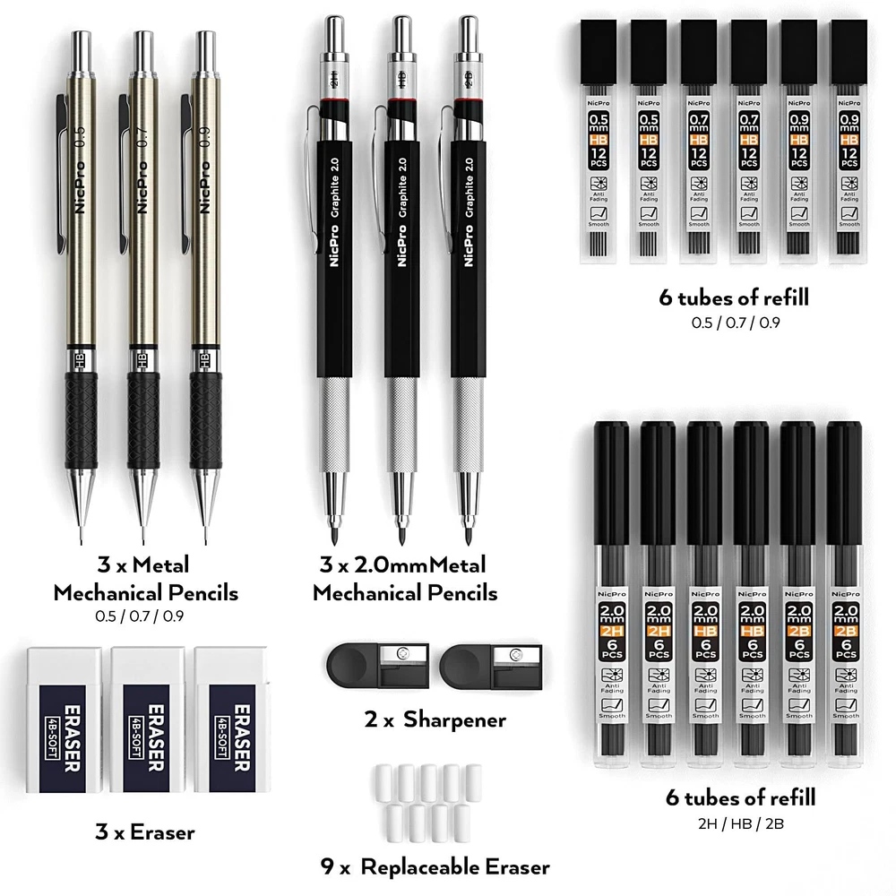 Easy replace refills 1.pencil. Press the top of button and make it no sprang back. Inset this refill and adjust the refill as a safest length 2.Please kindly be noted that the refills you should make it shorter as you could write. It will as larger as great assistance for protection for your refill being broken. Package Included: 3 x Mechanical Pencils 0.5-0.7-0.9mm leads 3 x Graphite Lead Holders 2B-HB-2H pencils 6 x Lead Refills (24 refills for each 0.5-0.7-0.9 mm) 6 x Graphite Lead Refills (12 refills for each 2B-HB-2H pencil) 3 x Erasers (5x2x1 cm) 6 x small cap erasers refill Value Package :Come With 6 PCS mechanical drafting pencils ,including 0.5 mm & 0.7mm & 0.9mm and 2mm ,12 tubes of refill : 0.5mm & 0.7 mm & 0.9mm ,2.0 mm (2B HB 2H) , 3 PCS of erasers , 9PCS of cap eraser refills, 2 PCS sharpener and a mechanical pencil case 4 Line Size & 3 Hardness: This awesome pencil set come with several size of lead refills for various line widths:0.5/0.7/0.9/2.0,the 2mm graphite pencil come with 3 hardness lead 2B HB and 2H to create different darkness, perfect for your daily use,they don't break easily, and write smoothly Ergonomic, Comfortable Design :The full-metal body provides ideal weight balance for fatigue-free writing and drawing or sketching, It brings you more effective and high quality tasks. The lead advances easily at the touch of a click. There is a sharpener in the cap of 2.0 mm mechanical pencil Two Type Anti-Slip Grips: Rhombus textured rubber grips and metal threaded anti-skidding, these pencils adopt different grip design base on pencil weight and applicable scene, only for better experience Perfect School Supplies :Ideals for teachers and students, artists, professionals,engineer alike. Perfect for writing, drafting, drawing, sketching or architectural working. Back to the basics! it will be also a great gift for your kids,parents,other family members and friends
