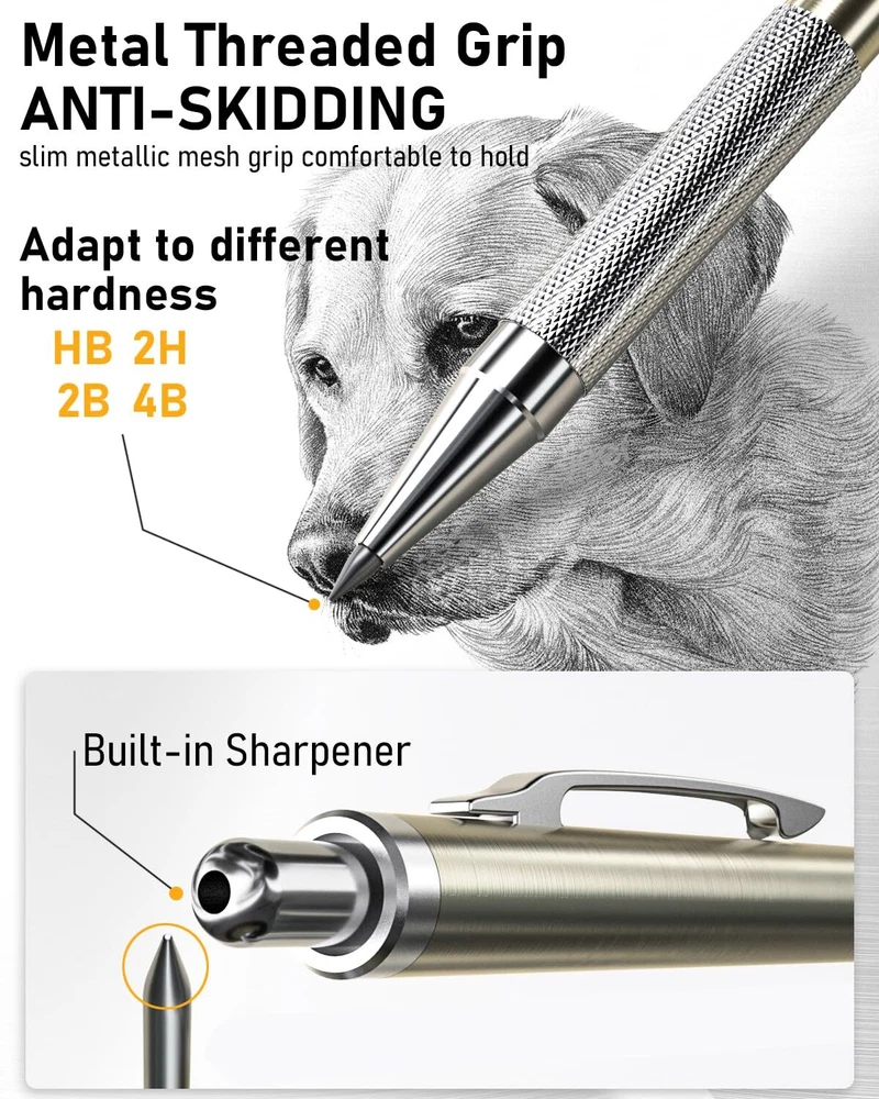 Come with 6 PCS drafting pencils and 8 tubes of lead refill in 0.3mm 0.5 mm & 0.7mm & 0.9mm (HB) + 2.0 mm(4B, 2B, HB, 2H) carbon based , 2 pcs erasers, 9 pcs cap eraser refill, 2 lead sharpener, updated storage case packaging The full-brass metal body provides ideal weight balance for fatigue-free writing and drawing. It brings you more effective and high quality tasks. 4 PCS Mechanical Pencils : 4 mm tip length makes it ideal for use with rulers and templates, various line size (0.3 mm,0.5 mm,0.7 mm & 0.9 mm) satisfy your demand. Polygon shape of these mechanical writing pencils avoids sliding on drawing tables. In addition, the pencil is pre-loaded with a 90mm-lead. 2 PCS 2mm Lead Holder: Metal Threaded Anti-skidding pen tube with sharpener in the cap of 2.0 mm mechanical pencil, Extra 2pcs lead sharpener are also provided for the 2.0 lead to keep the fine point as they dull. Perfect School Supplies:Ideals for artists, professionals, teachers and students alike. Perfect for writing, drafting, drawing, sketching